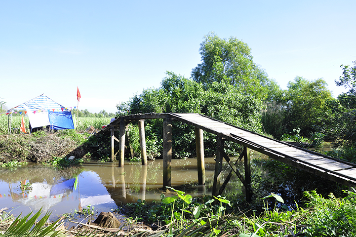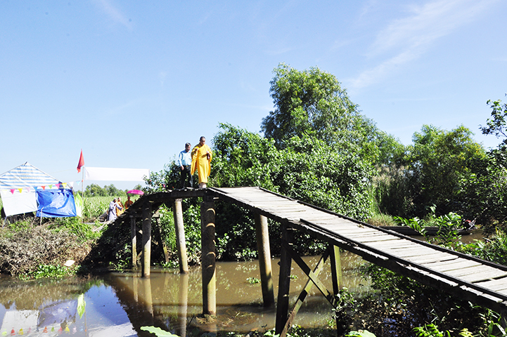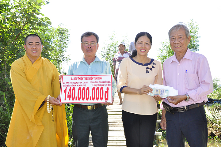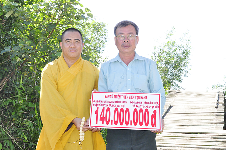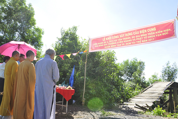 Được biết, cây cầu được xây dựng bằng bê tông cốt thép, chiều dài 30 m, ngang 2,6 m, tổng kinh phí 140 triệu đồng do hai gia đình Phật tử Bùi Trương Uyên và gia đình Trần Kiếm Hiệp tài trợ