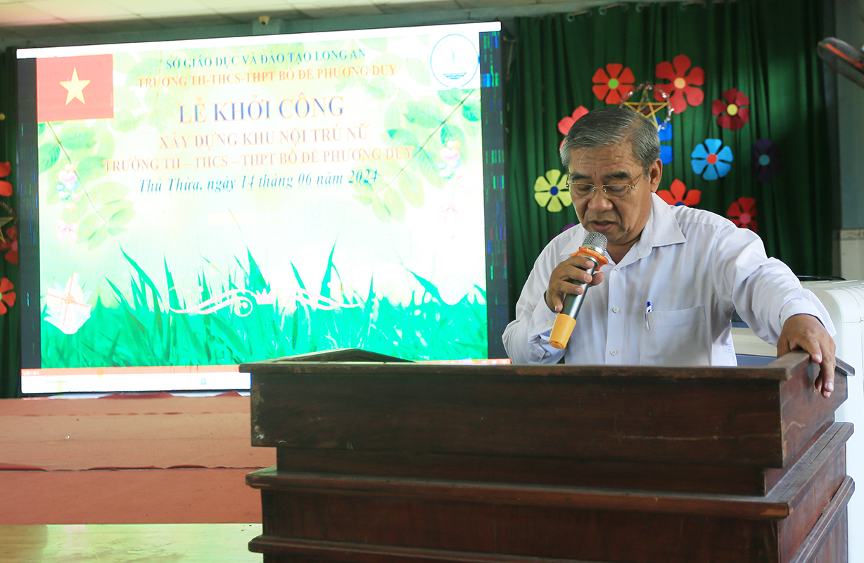 Ông Dương Quốc Xuân – Nguyên Chủ tịch UBND tỉnh Long An có lời phát biểu. Ông bày tỏ niềm tự hào trước quá trình hình thành phát triển và thành tựu của trường Bồ đề Phương Duy. Ông tỏ lòng tri ân đến Hoà thượng Trưởng BTS và Chư Tôn đức Phật giáo tỉnh đã hỗ trợ, tạo điều kiện để trường hoạt động tốt và nay có thêm khu nội trú nữ mới. Đồng thời, ông gửi lời tri ân chân thành đến các mạnh thường quân, doanh nghiệp đã hỗ trợ cho công trình. Ông mong rằng trong tương lai, các mạnh thường quân và doanh nghiệp sẽ tiếp tục là cánh tay nối dài, đồng hành, hỗ trợ cho trường Bồ Đề Phương Duy ngày càng phát triển.