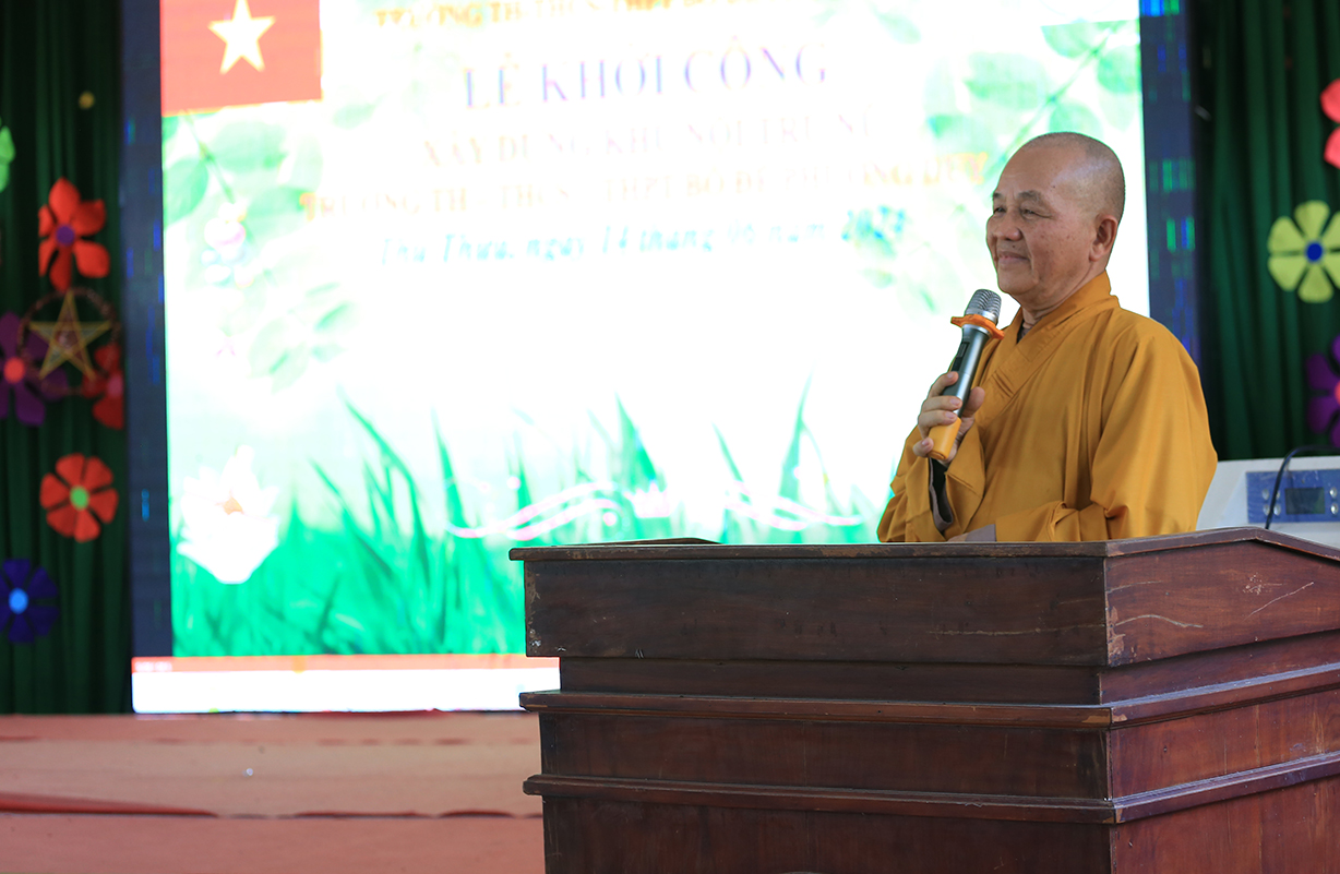 Hoà thượng Thích Minh Thiện – Trưởng BTS GHPGVN tỉnh Long An – Chủ tịch danh dự Hội đồng trường có lời phát biểu. Hoà thượng tri ân ông Dương Quốc Xuân – Nguyên Chủ tịch UBND tỉnh Long An đã hết sức quan tâm đến công tác giáo dục, trong đó có sự quan tâm đến mái ấm Kim Chi – nay là trường Bồ Đề Phương Duy. Ngôi trường chính là sự kết nối yêu thương của tất cả những nhà hảo tâm, mạnh thường quân đối với sự nghiệp trồng người. Hoà thượng gửi lời chúc tốt đẹp đến quý mạnh thường quân, doanh nghiệp và chúc cho buổi lễ được thành tựu, công trình sau khi hoàn thành sẽ hoạt động hiệu quả, đáp ứng nhu cầu học tập của học sinh trường.