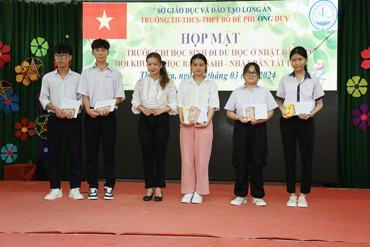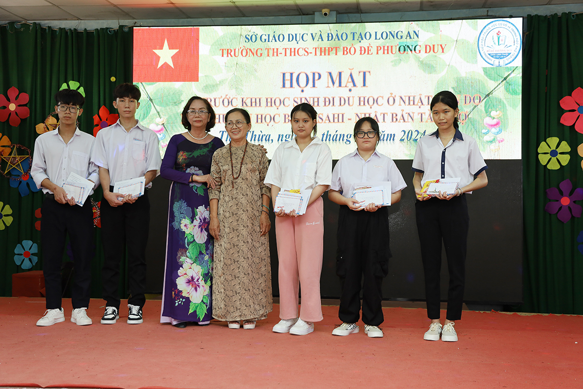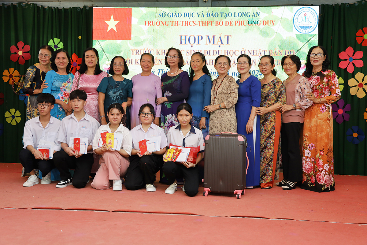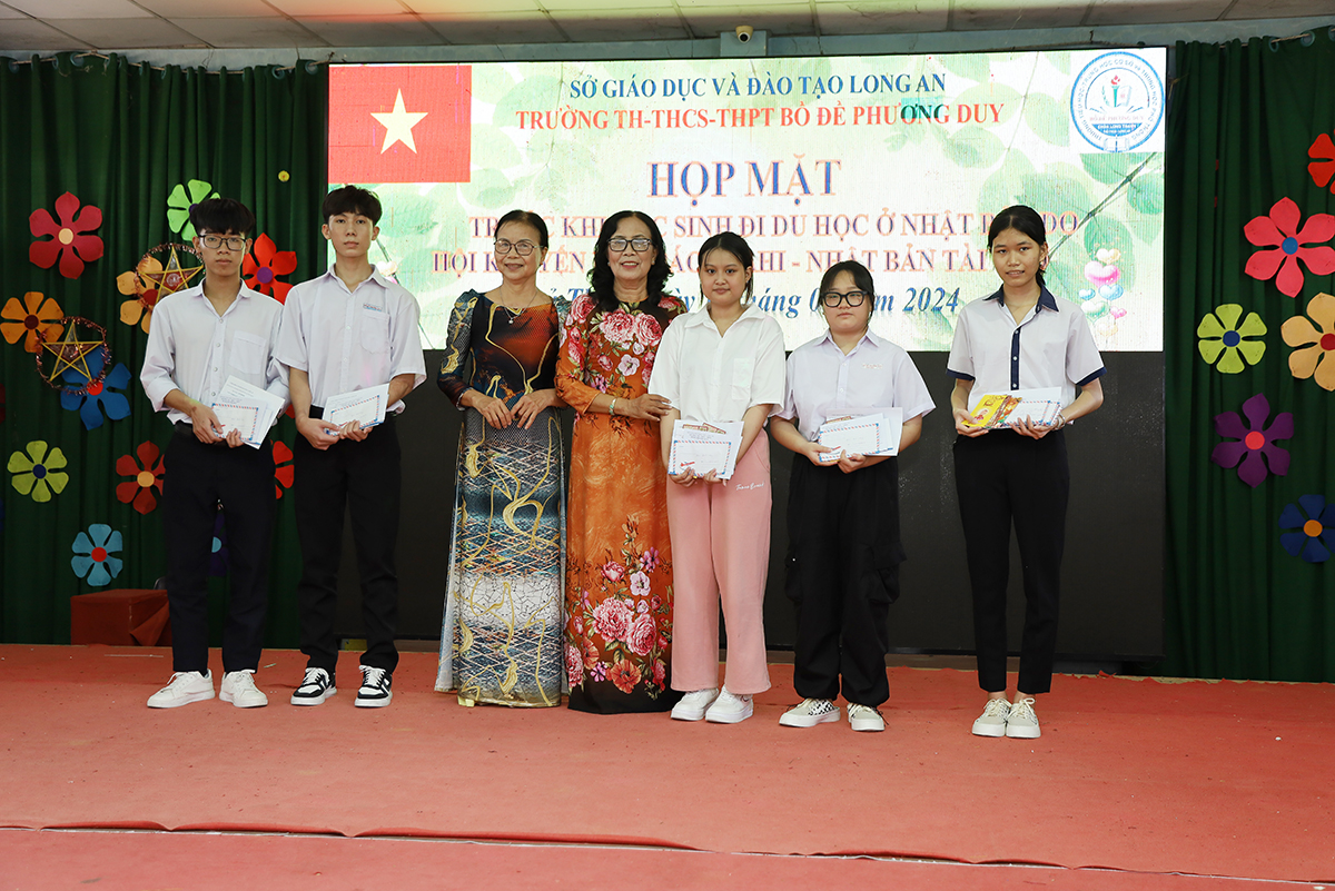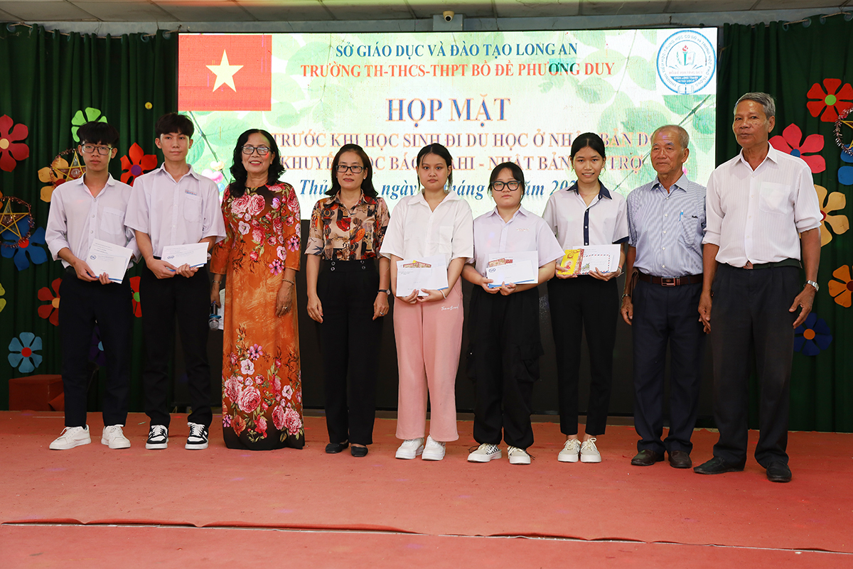 Về phía lãnh đạo nhà trường có cô Huỳnh Thị Thu Loan – Chủ tịch Hội Khuyến học huyện Thủ Thừa, Hiệu trưởng Trường Tiểu học – THCS – THPT Bồ Đề Phương Duy, cùng toàn thể các quý thầy cô là giáo viên đang giảng dạy tại trường, quý phụ huynh và các em học sinh chuẩn bị du học Nhật Bản trở về tham dự.