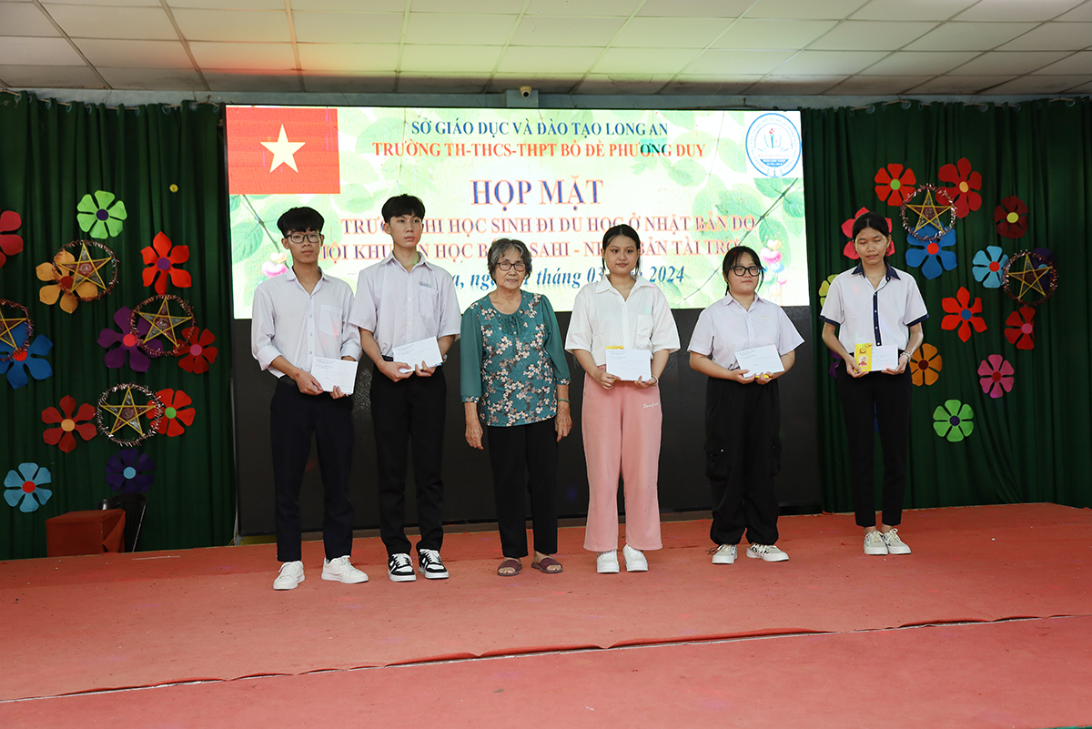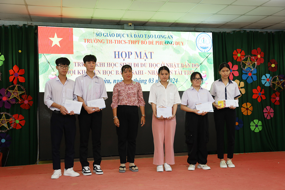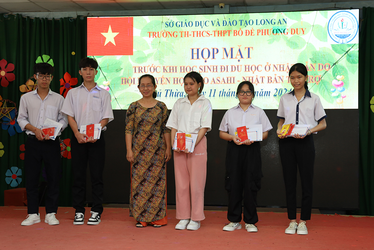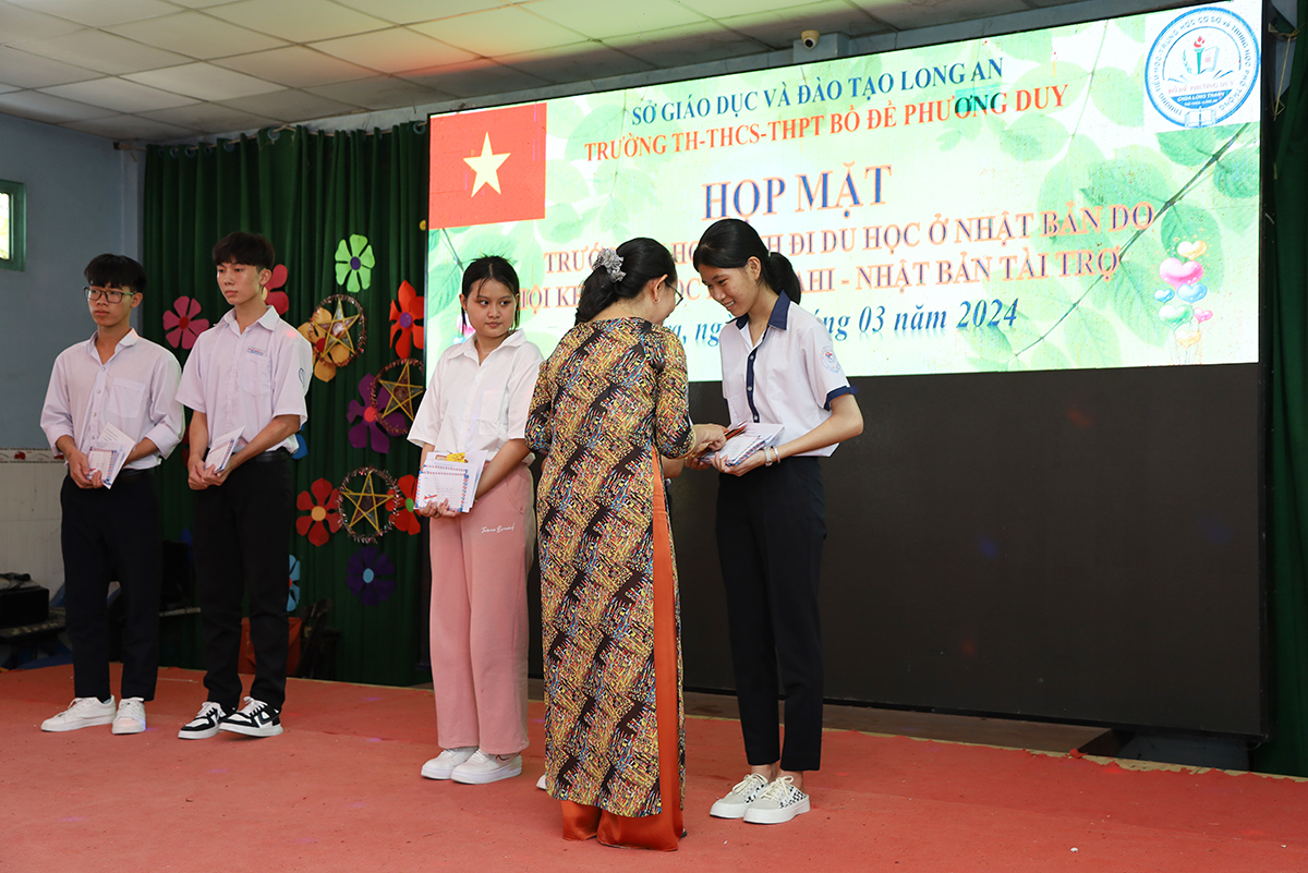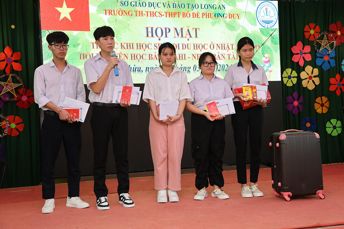 Về phía lãnh đạo nhà trường có cô Huỳnh Thị Thu Loan – Chủ tịch Hội Khuyến học huyện Thủ Thừa, Hiệu trưởng Trường Tiểu học – THCS – THPT Bồ Đề Phương Duy, cùng toàn thể các quý thầy cô là giáo viên đang giảng dạy tại trường, quý phụ huynh và các em học sinh chuẩn bị du học Nhật Bản trở về tham dự.