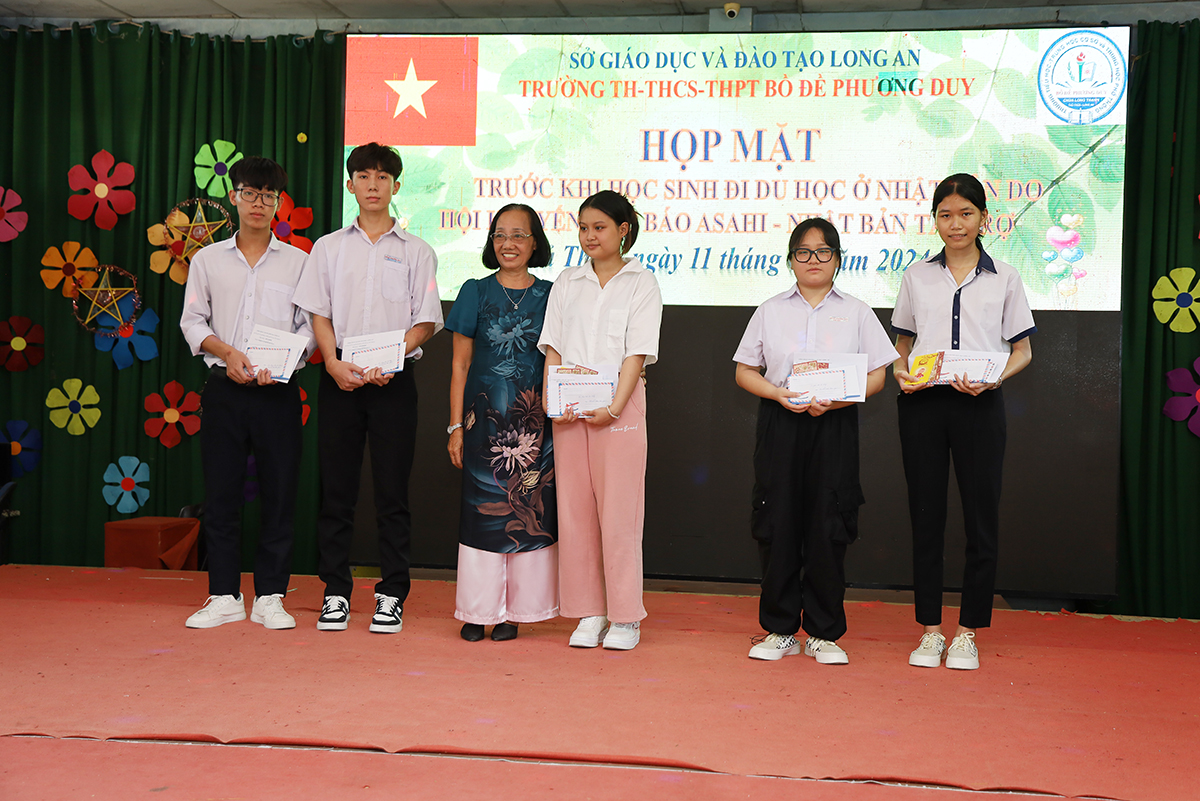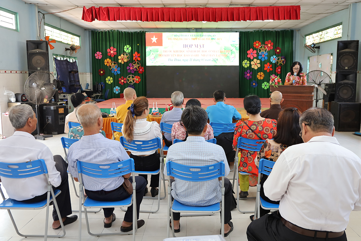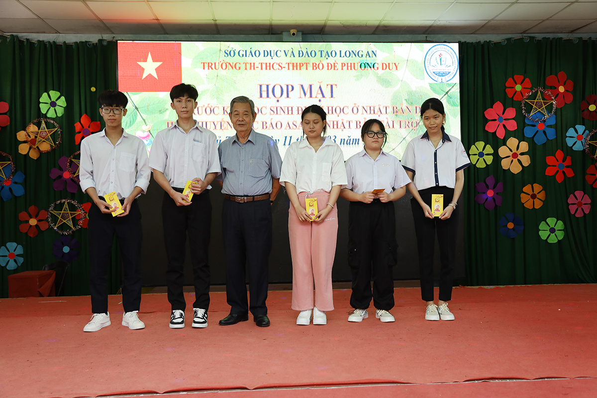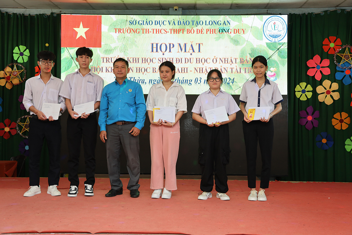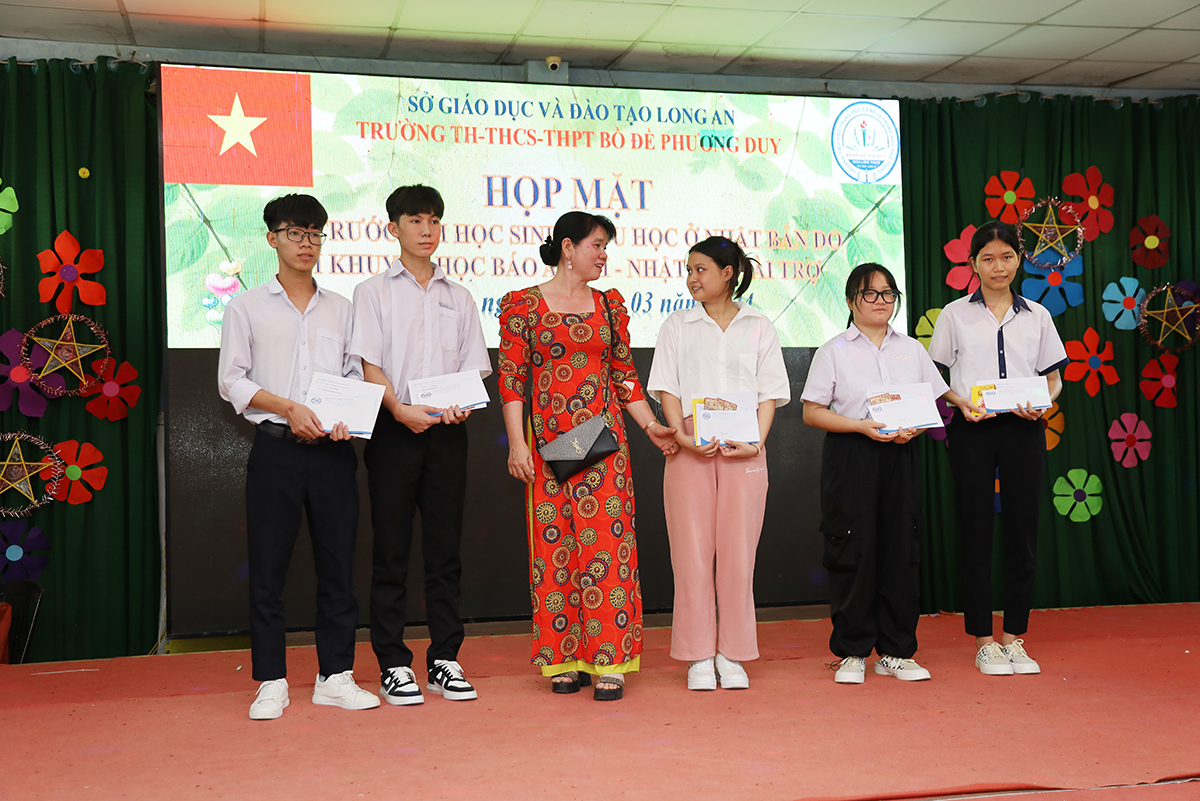 Về phía lãnh đạo nhà trường có cô Huỳnh Thị Thu Loan – Chủ tịch Hội Khuyến học huyện Thủ Thừa, Hiệu trưởng Trường Tiểu học – THCS – THPT Bồ Đề Phương Duy, cùng toàn thể các quý thầy cô là giáo viên đang giảng dạy tại trường, quý phụ huynh và các em học sinh chuẩn bị du học Nhật Bản trở về tham dự.