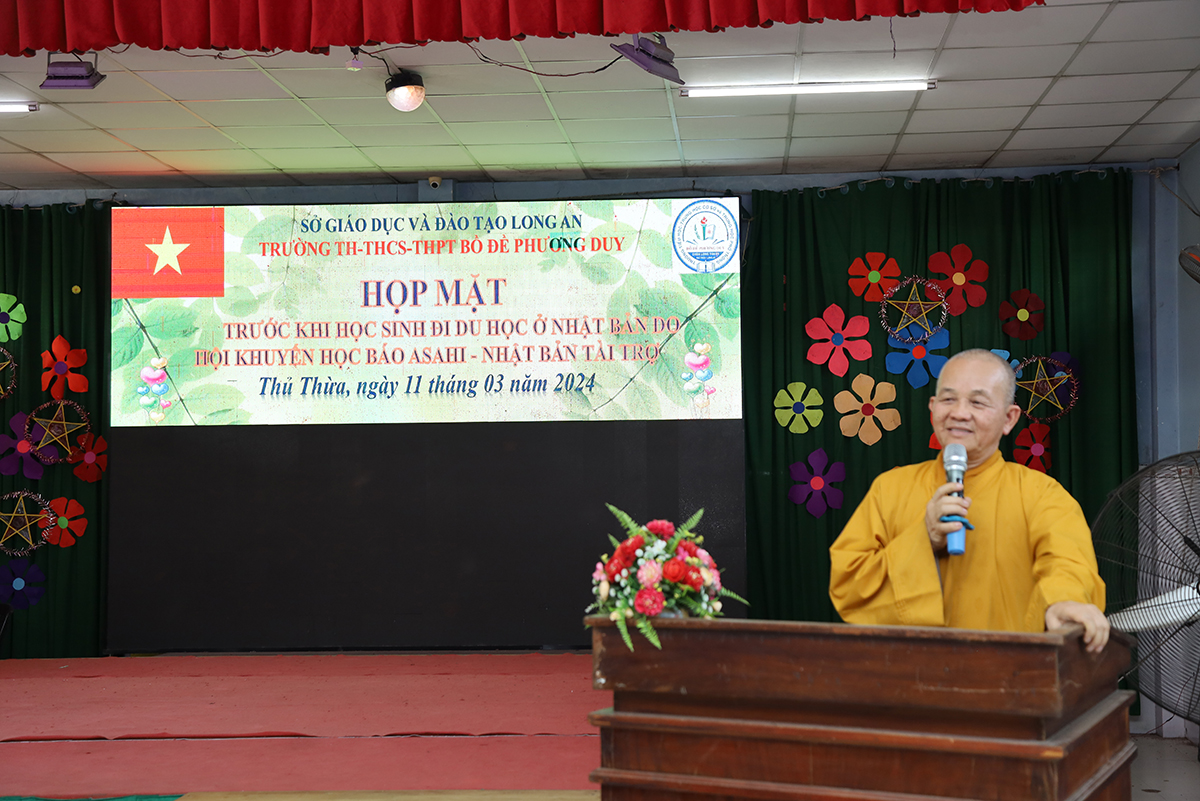 Đại diện lãnh đạo nhà trường, Cô Huỳnh Thị Thu Loan – Hiệu trưởng Trường Tiểu học – THCS – THPT Bồ Đề Phương Duy có lời phát biểu. Cô bày tỏ niềm hạnh phúc khi ước nguyện du học Nhật Bản của các em học sinh trường Bồ Đề Phương Duy đã thành hiện thực khi được Chính phủ Nhật Bản cấp visa chính thức. Cô có lời nhắn nhủ đến học sinh dù gặp nhiều khó khan, chướng ngại, rào cản phía trước nhưng các em cần phải cố gắng, quyết tâm cho sứ mệnh giáo dục phía trước. Dù khó khăn nhưng vẫn phải đặt danh dự Quốc gia, dân tộc lên hàng. Cuối lời, cô gửi lời chân thành cảm ơn đến Chư tôn đức, lãnh đạo chính quyền, mạnh thường quân và phụ huynh đã giành thời gian tham dự buổi lễ, kính chúc các em du học sinh có nhiều niềm tin, chăm ngoan học giỏi và vững bước vào chân trời mới.