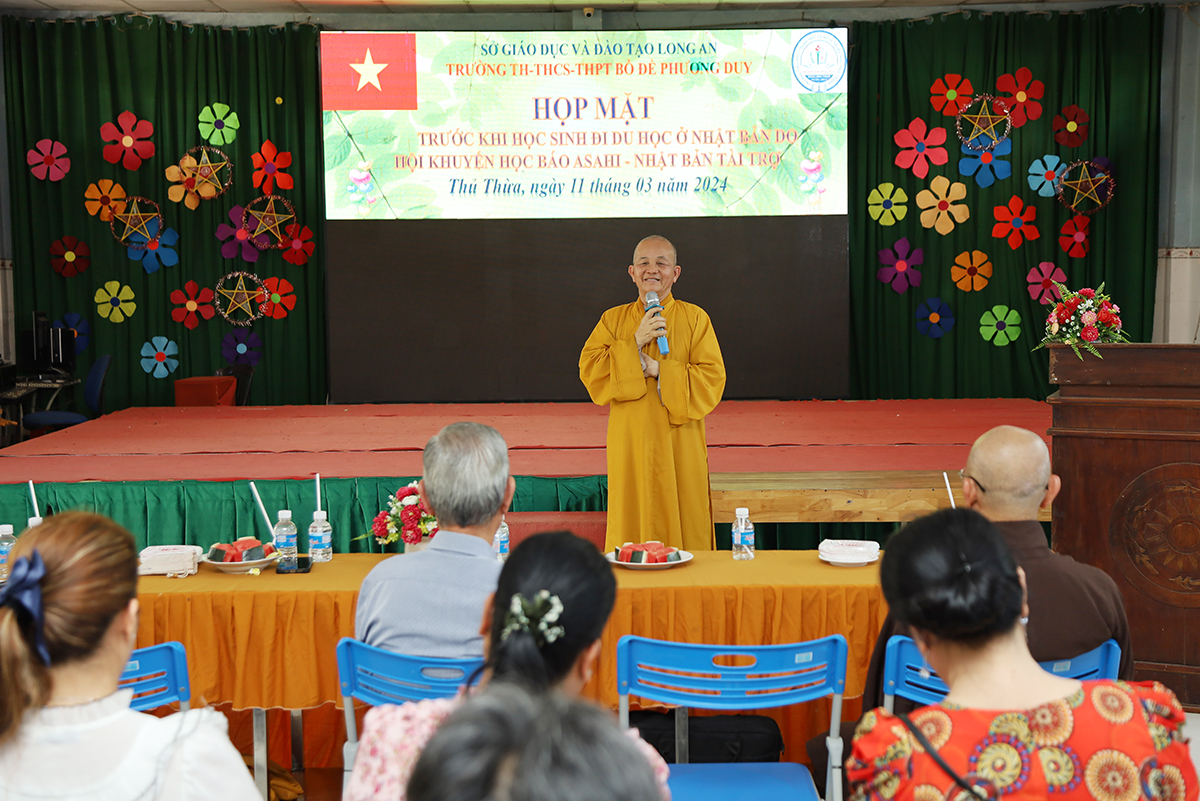 Đãi lao Chư tôn đức chứng minh, HT Thích Minh Thiện đã có lời phát biểu tại buổi lễ. Hòa thượng bày tỏ niềm hoan hỷ về suốt quá trình hình thành và phát triển của trường Bồ Đề Phương Duy, đặc biệt là nay đã có các em học sinh đủ điều kiện du học Nhật Bản. Lắng nghe lời báo cáo về tình hình giáo dục của lãnh đạo nhà trường, Hòa thượng bảy tỏ niềm hạnh phúc và tự hào, đồng thời chúc mừng các tân du học sinh, nhắc nhở về tinh thần hiếu học đã ăn sâu vào truyền thống người Việt Nam. Hòa thượng sách tấn các em du học sinh phải biết ơn đến quý chư tôn đức, quý lãnh đạo nhà trường, quý phụ huynh và quý mạnh thường quân đã tạo mọi điều kiện thuận lợi để các em tiếp tục con đường học vấn của mình. Cuối lời, Hòa thượng hy vọng các em học sinh trong tương lai sẽ có nhiều cống hiến, trở thành những người con gương mẫu của đất nước.