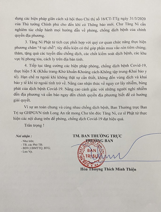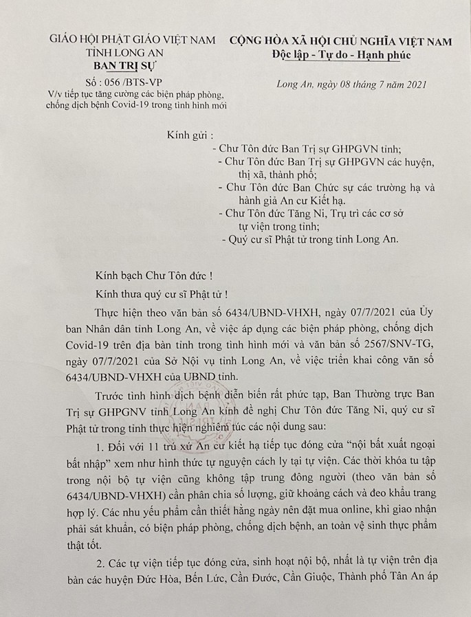 Trước tình hình diễn biến rất phức tạp, Ban Thường trực Ban Trị sự GHPGNV tỉnh Long An kính đề nghị Chư Tôn đức Tăng Ni, quý cư sĩ Phật tử trong tỉnh thực hiện nghiêm túc các nội dung sau: