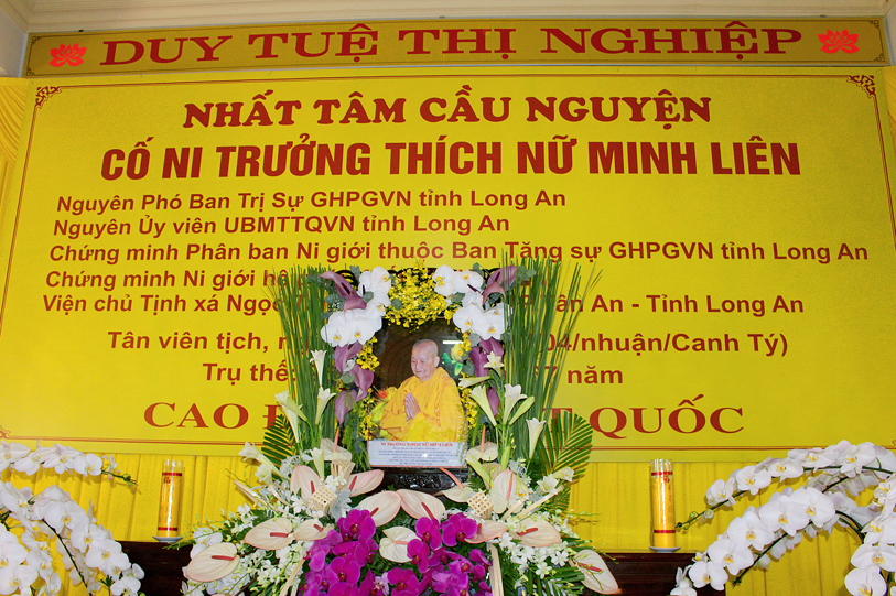 Ngày 01/06/2020 (nhằm 10/4/nhuần Canh Tý), phái đoàn Tỉnh ủy tỉnh Long An do ông Nguyễn Văn Út – Ủy viên Ban Thường vụ Tỉnh ủy, Phó Chủ tịch UBND tỉnh Long An làm trưởng đoàn đã đến viếng lễ tang Ni trưởng Minh Liên – Nguyên Phó Trưởng Ban Trị sự GHPGVN tỉnh Long An – Nguyên Ủy viên UBMTTQVN tỉnh Long An – Chứng minh Phân Ban Ni giới GHPGVN tỉnh Long An – Chứng minh Giáo phẩm Ni giới Hệ phái Khất sĩ Việt Nam – Viện chủ Tịnh xá Ngọc Tâm viên tịch.