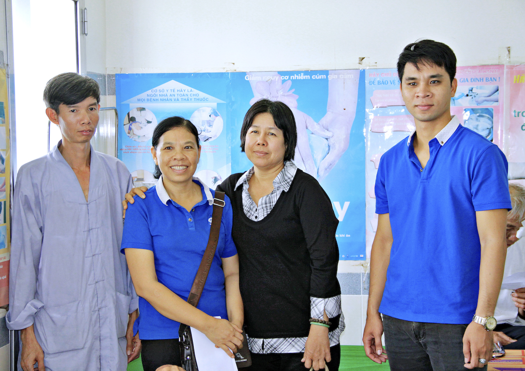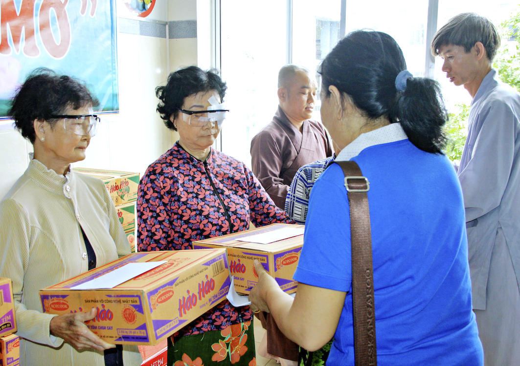 Hướng dẫn đoàn từ thiện có ĐĐ. Thích An Phúc – Phó ban Thông tin & Truyền thông GHPGVN tỉnh Long An – Ban từ thiện Tổ đình Kim Cang; ĐĐ. Thích An Minh – Ủy viên Ban Thông tin & Truyền thông GHPGVN tỉnh Long An, cùng quý ông bà: ông Trương Văn Sanh – chủ tịch Hội Chữ Thập Đỏ bệnh viện huyện Lấp Vò; bà Lê Thị Sáu – Trưởng phòng nhân sự đại diện cho Cty Vĩnh Hoàn…