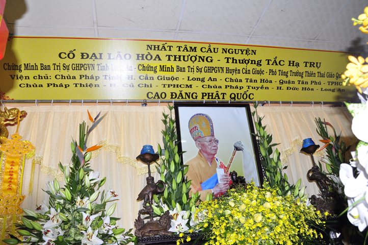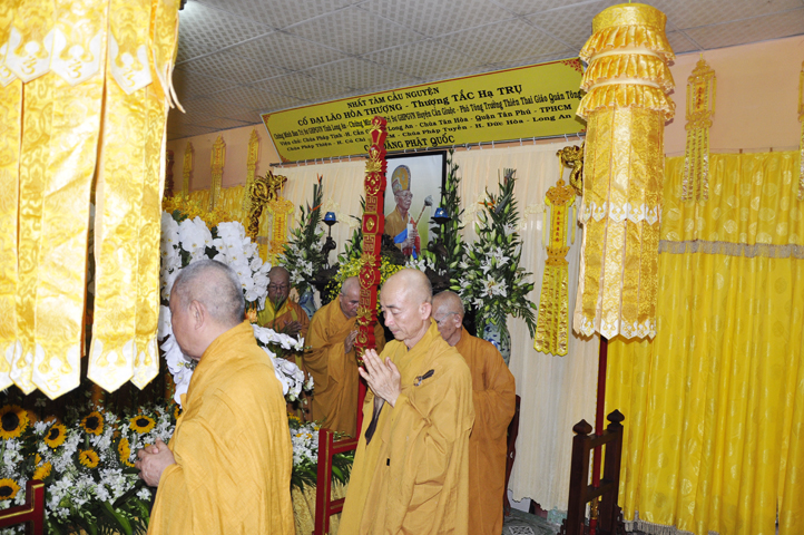 Chiều ngày 23/7/ Đinh Dậu (nhằm ngày 13/9/2017), chư Tăng Ni từ thành phố Hồ Chí Minh, các tỉnh Long An, Tiền Giang, huyện Cần Giuộc, Cần Đước v.v. thuộc hệ phái Thiên Thai Giáo Quán Tông (gần 200 vị) đồng vân tập tại chùa Pháp Tịnh, thị trấn Cần Giuộc long trọng tiến hành lễ Truy niệm, kính viếng Giác linh Cố Hòa thượng Thích Tắc Trụ – Phó tông trưởng phái Thiên Thai.