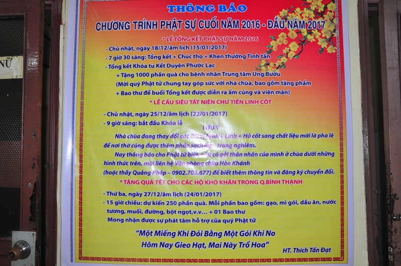 Hôm nay, ngày 15/1/2017, lễ tổng kết Phật sự năm 2016 của chùa Hoà Khánh được tổ chức trọng thể tại giảng đường chùa Hoà Khánh.