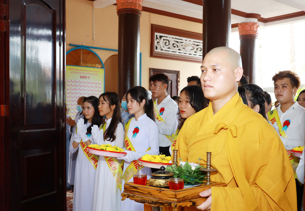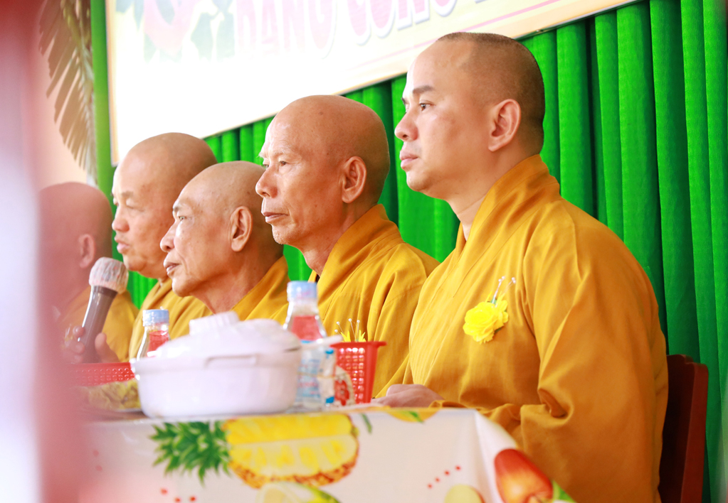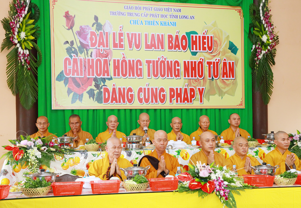 Buổi lễ được cung nghinh sự quang lâm chứng minh của Hòa thượng Thích Thiện Huệ – Chứng minh BTS GHPGVN tỉnh Long An và TP Tân An – Trụ trì Chùa Thiên Khánh, Hòa thượng Thích Huệ Hồng – Chứng Minh BTS GHPGVN tỉnh Long An, Hòa thượng Thích Minh Thiện – UV HĐTS – Phó Trưởng Ban Hoằng pháp TW – Trưởng BTS GHPGVN tỉnh Long An – Hiệu trưởng Trường trung cấp Phật học tỉnh Long An, cùng chư tôn đức Tăng, Ni, Ban Thường trực BTS GHPGVN tỉnh Long An và Thành phố Tân An, Ban giám hiệu trường Trung cấp Phật học tỉnh Long An, cùng hơn 200 quý Phật tử trở về vân tập tham dự.