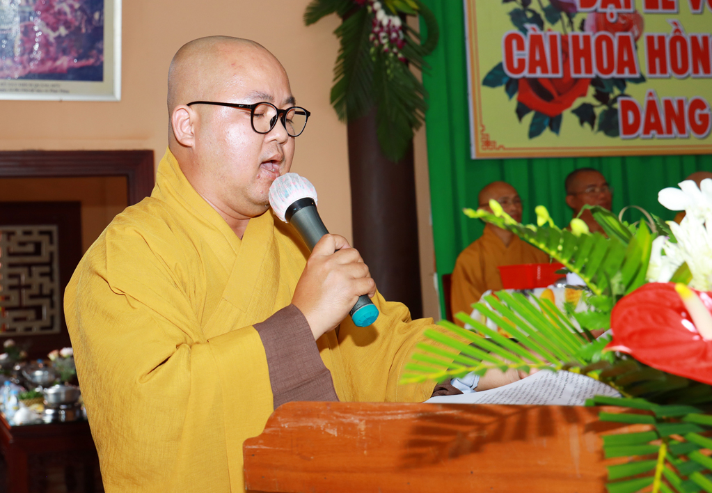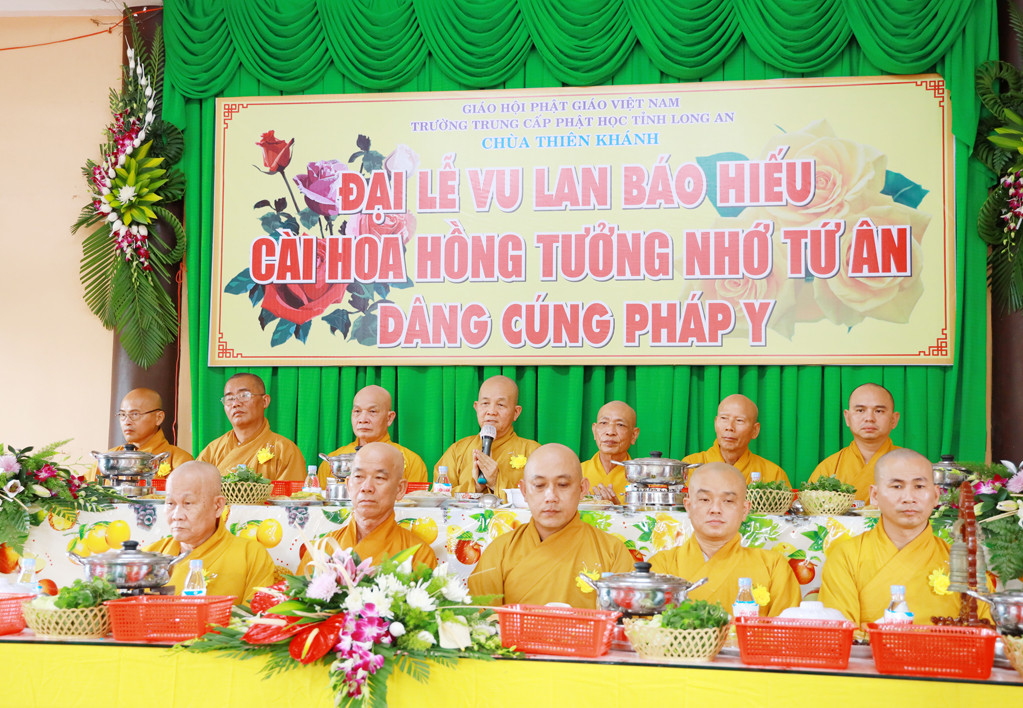 Toàn thể đại chúng được lắng lòng từ lời pháp âm ban đạo từ của Hòa thượng Thích Minh Thiện – UV HĐTS – Trưởng BTS GHPGVN tỉnh Long An- Hiệu trưởng Trường Trung cấp Phật học tỉnh Long An chứng minh, trong lời đạo từ, Hòa thượng đã lần nữa nhắc lại tinh thần tri ân, báo ân, của dân tộc Việt Nam, đặc biệt đề cao giá trị hiếu ân của người bổn phận người Phật tử đối với Thầy Tổ và cha mẹ, Ngài đã sách tấn hội chúng cần siêng năng, tinh tấn học Phật, phụng dưỡng cha mẹ bằng sự nhiệt tâm chuyên nhất, để báo đáp công lao to lớn mà cha mẹ đã hy sinh thầm lặng cả cuộc đời cho ta được lớn khôn đến tận hôm nay.