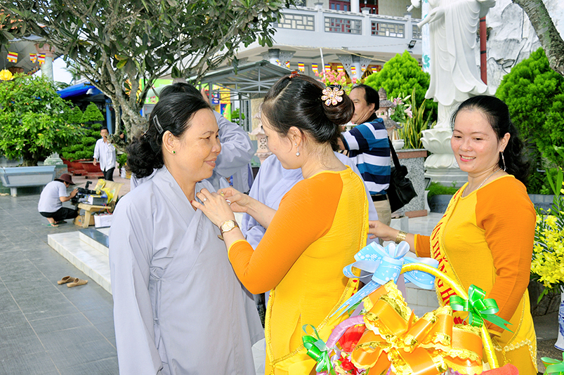 Tiếp đến là nghi thức cài hoa hồng tưởng nhớ tứ trọng ân. Những đóa hoa hồng vàng, đỏ và trắng lần lượt được cài lên ngực áo chư Tôn đức và quý Phật tử.