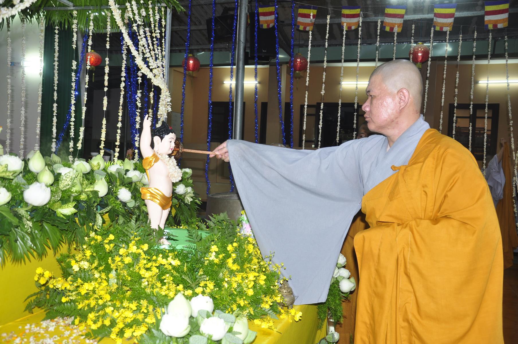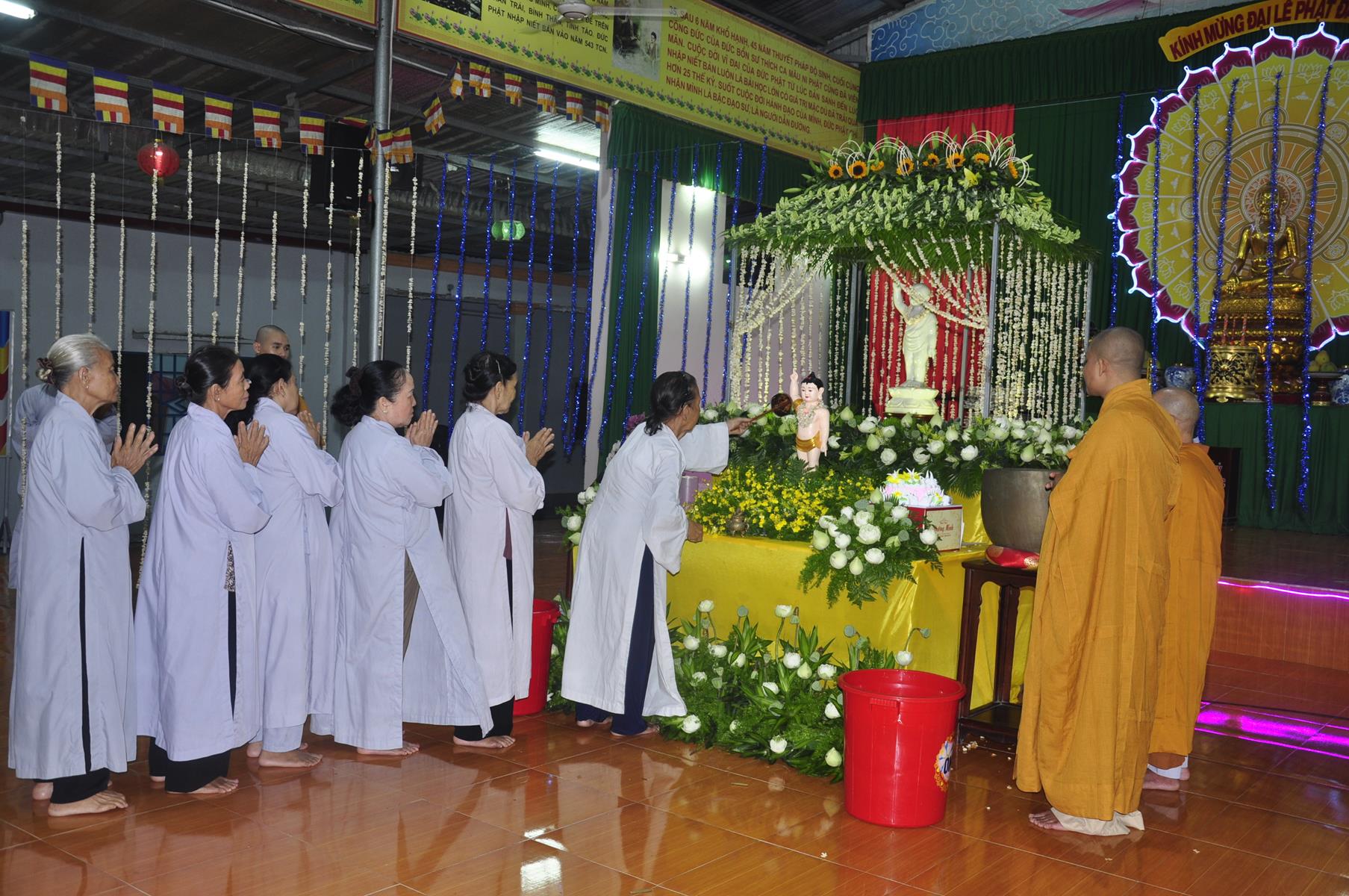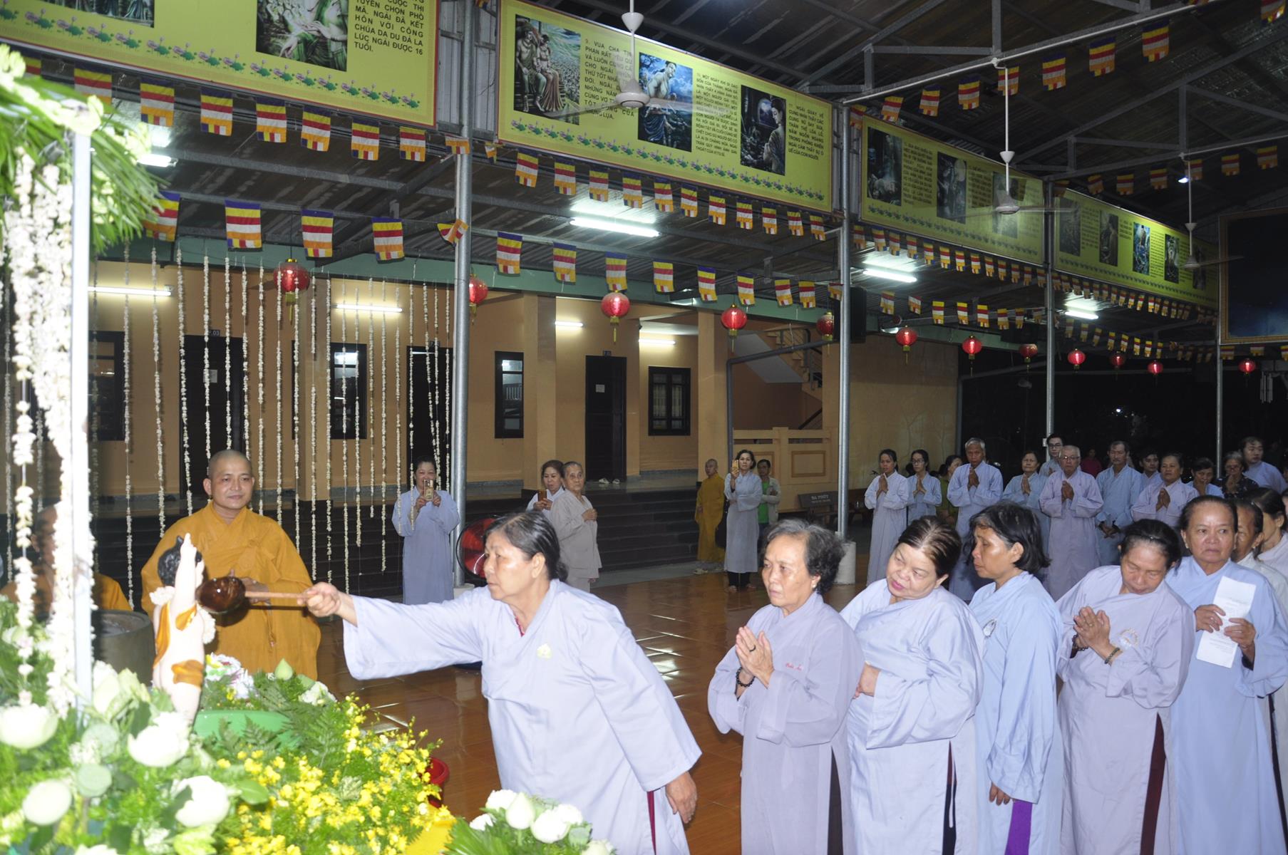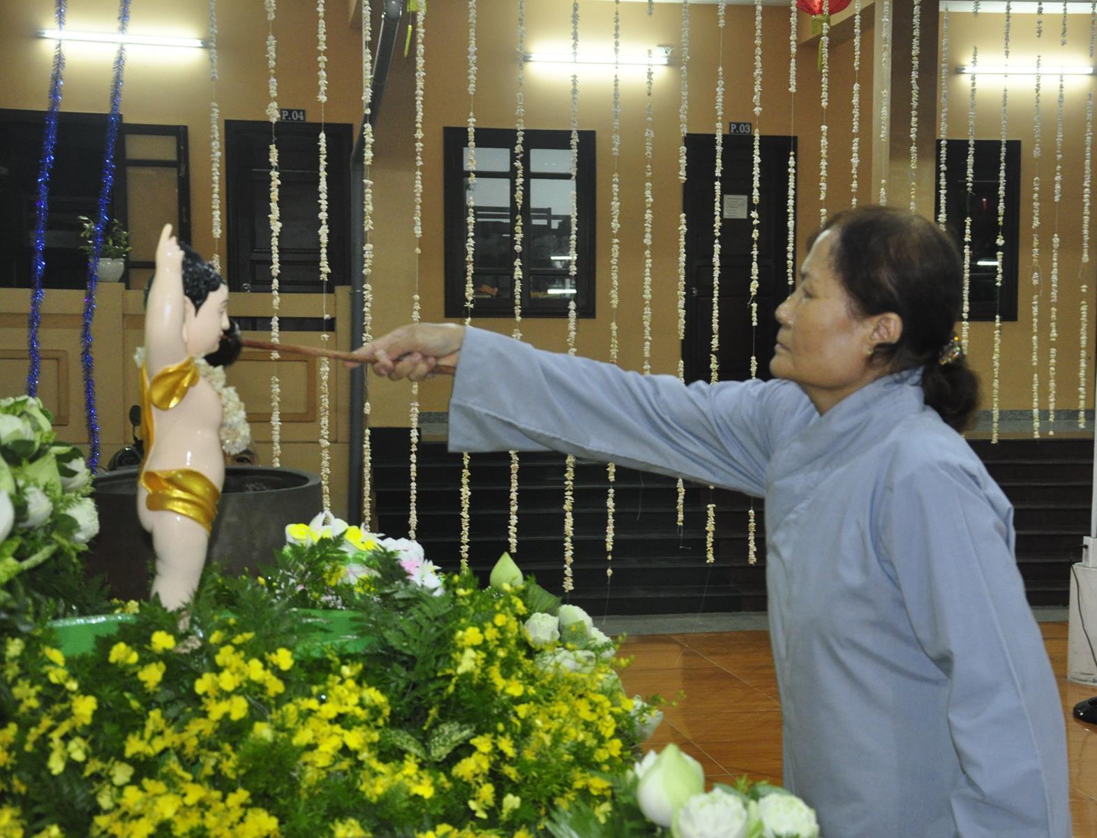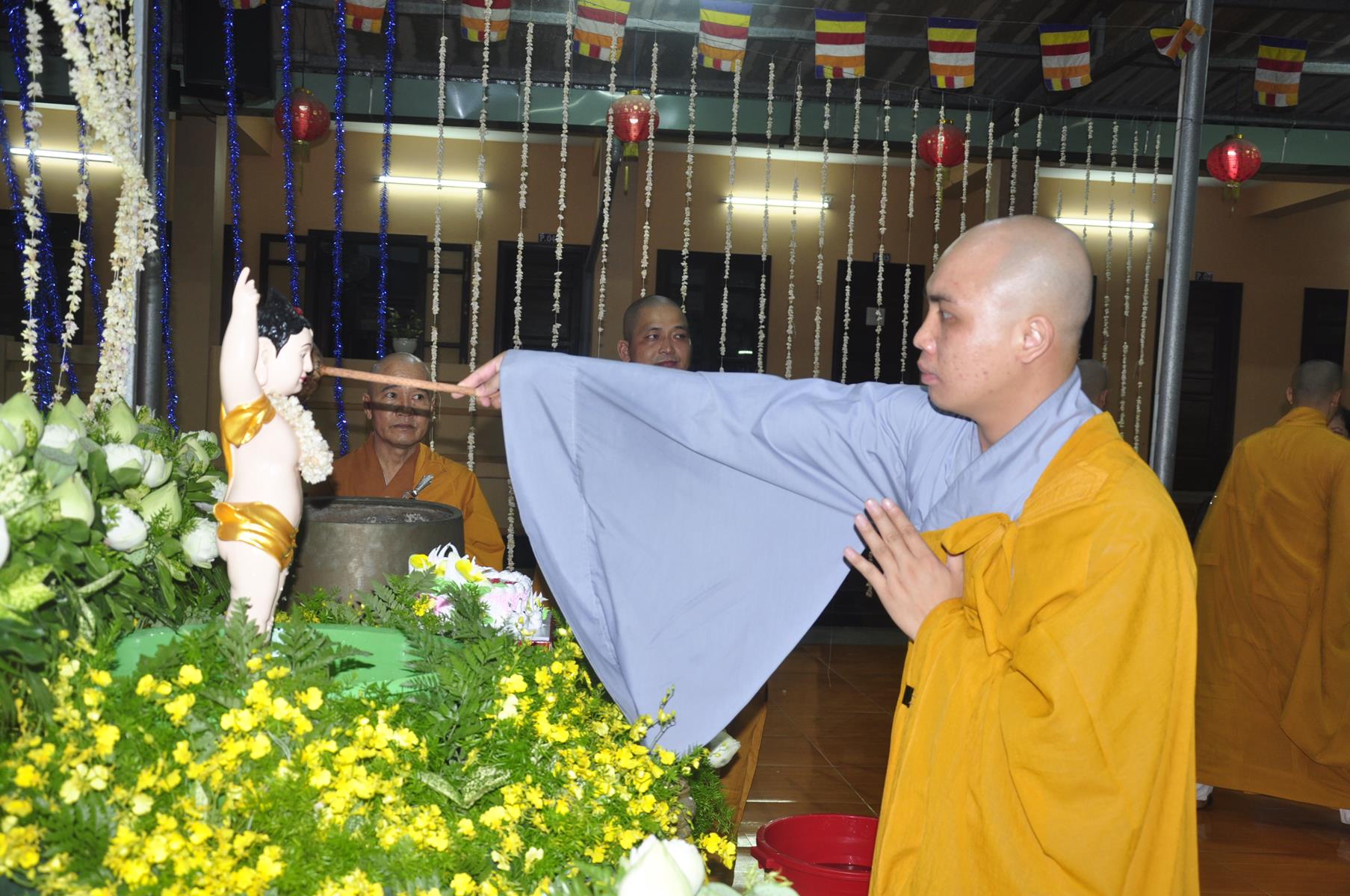 Tối cùng ngày, Ban Chủ Nhiệm cử hành nghi lễ tắm Phật để kính mừng Đại lễ Phật đản PL 2563 cho Tăng sinh Lớp Sơ cấp Phật học Long An và Phật tử chùa Pháp Minh.