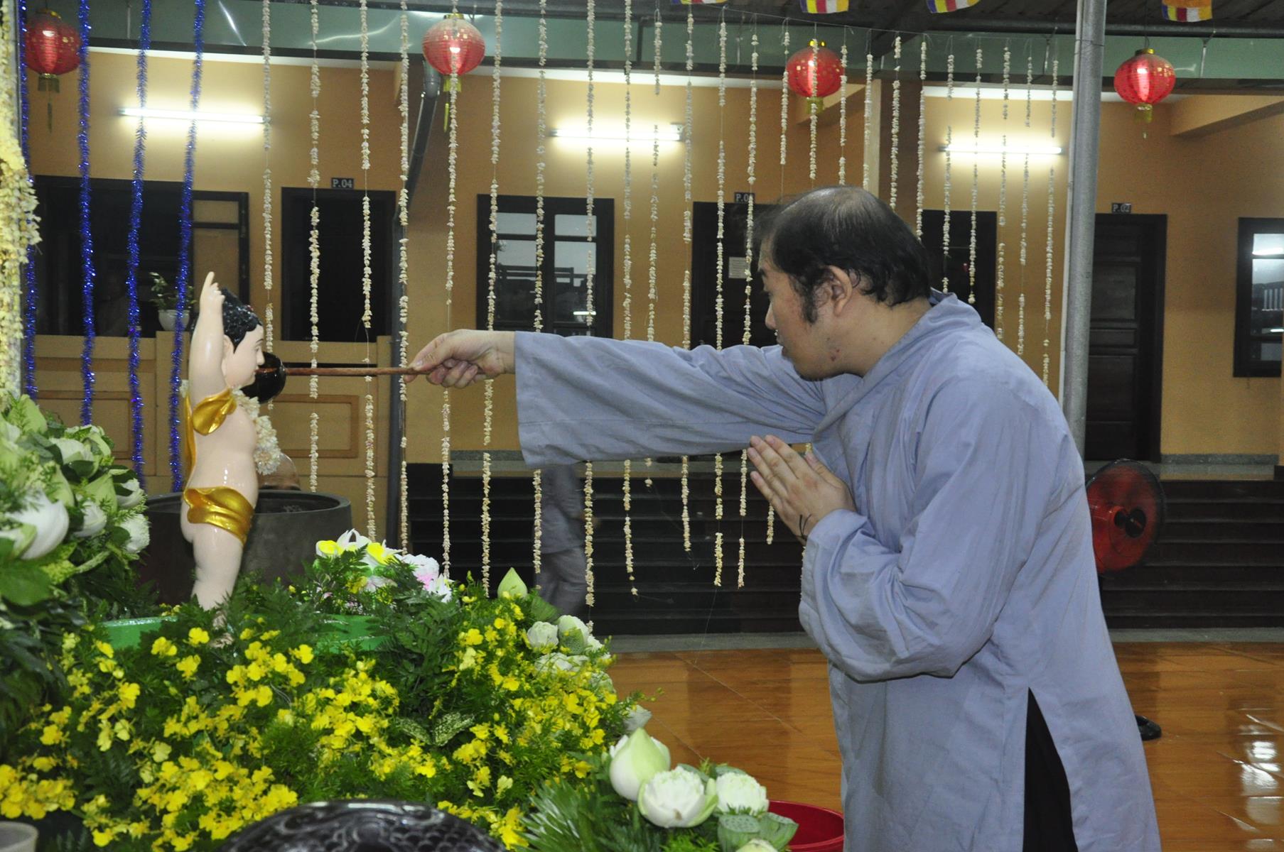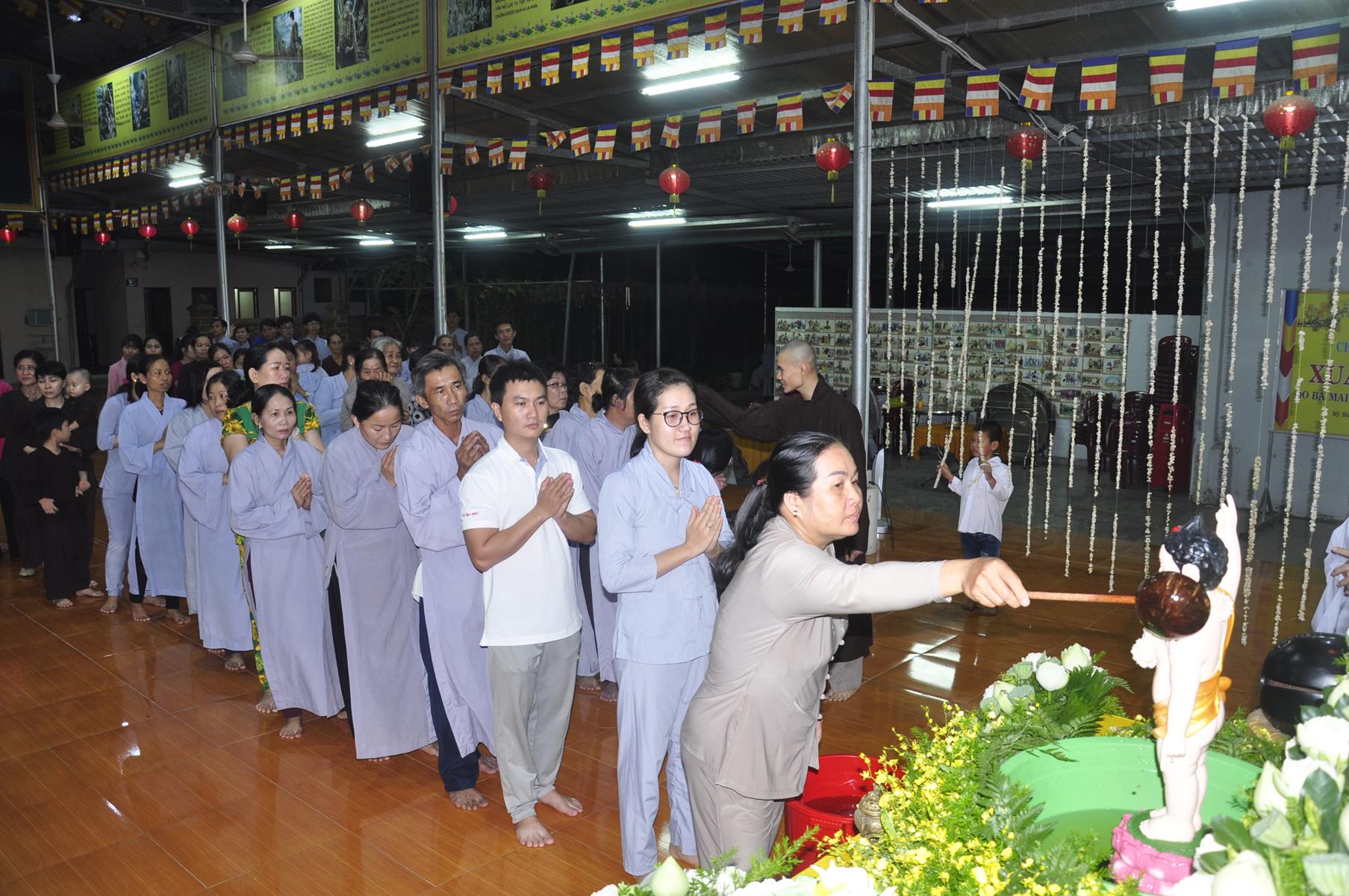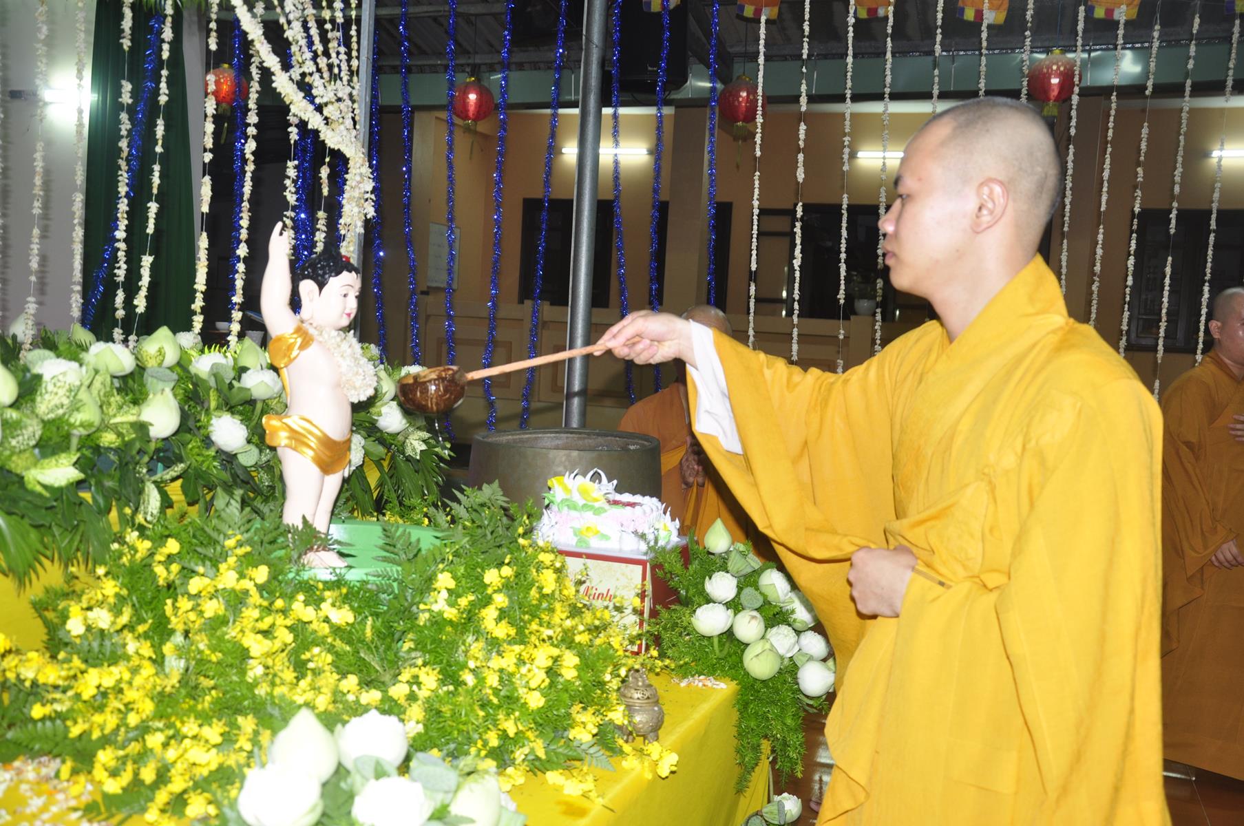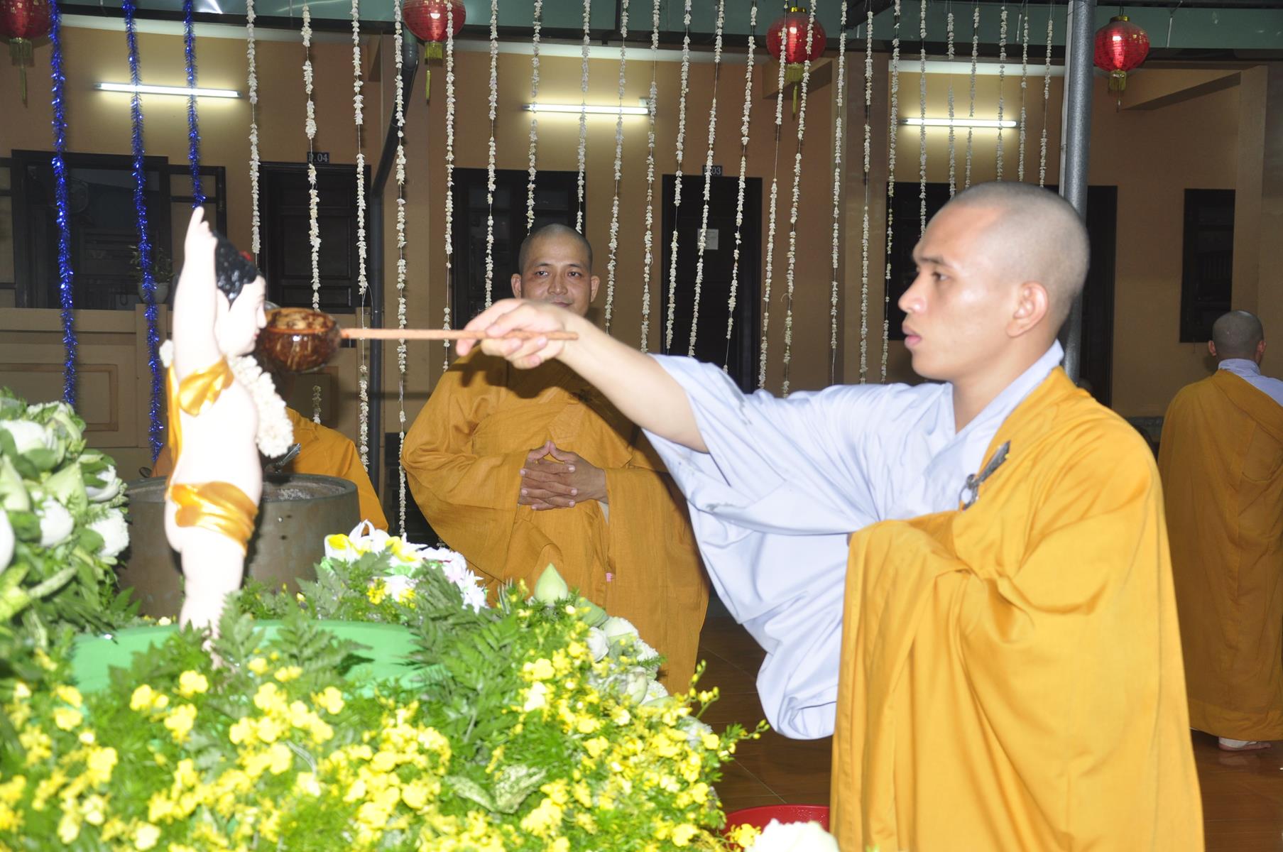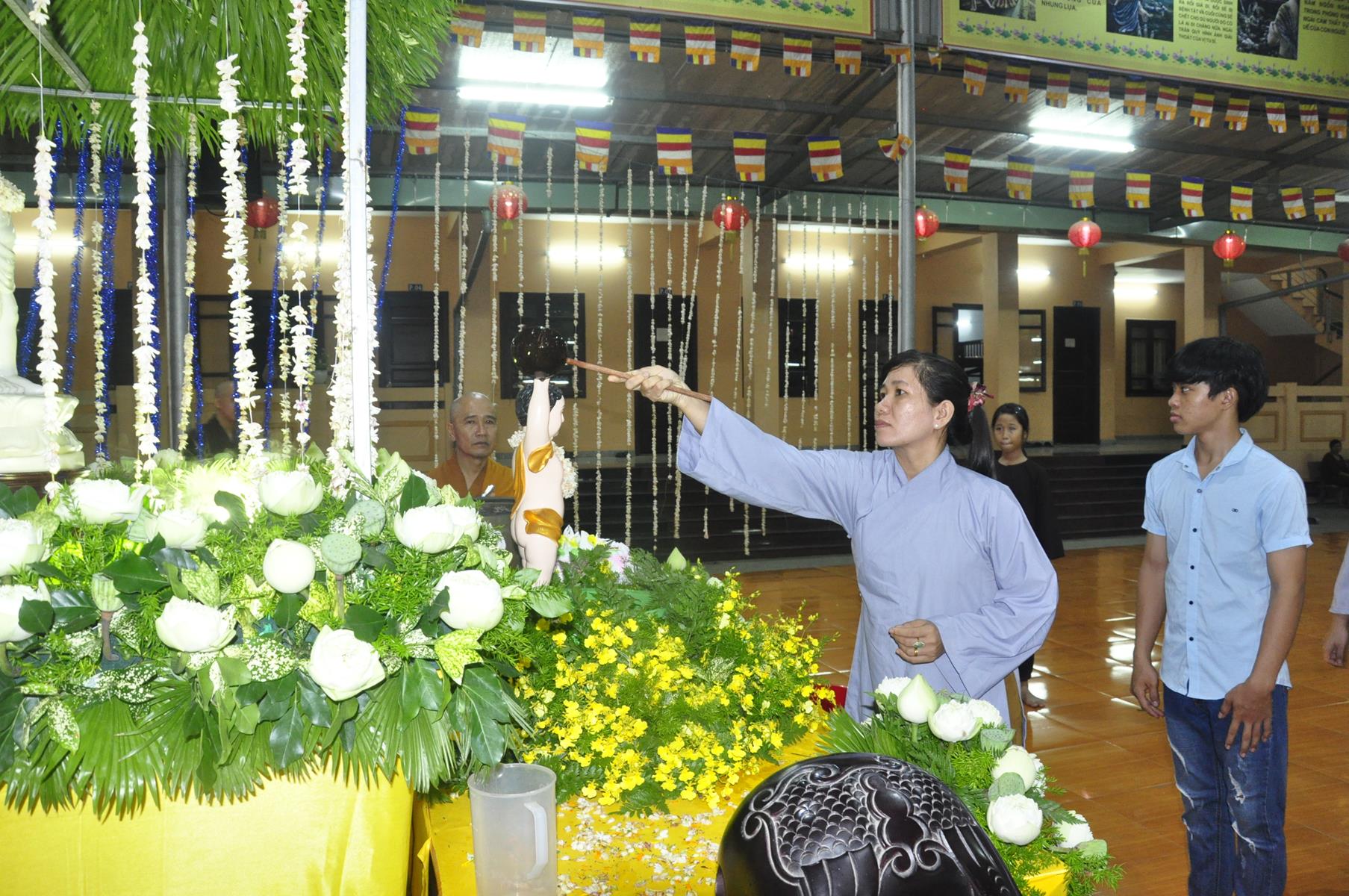 Tối cùng ngày, Ban Chủ Nhiệm cử hành nghi lễ tắm Phật để kính mừng Đại lễ Phật đản PL 2563 cho Tăng sinh Lớp Sơ cấp Phật học Long An và Phật tử chùa Pháp Minh.