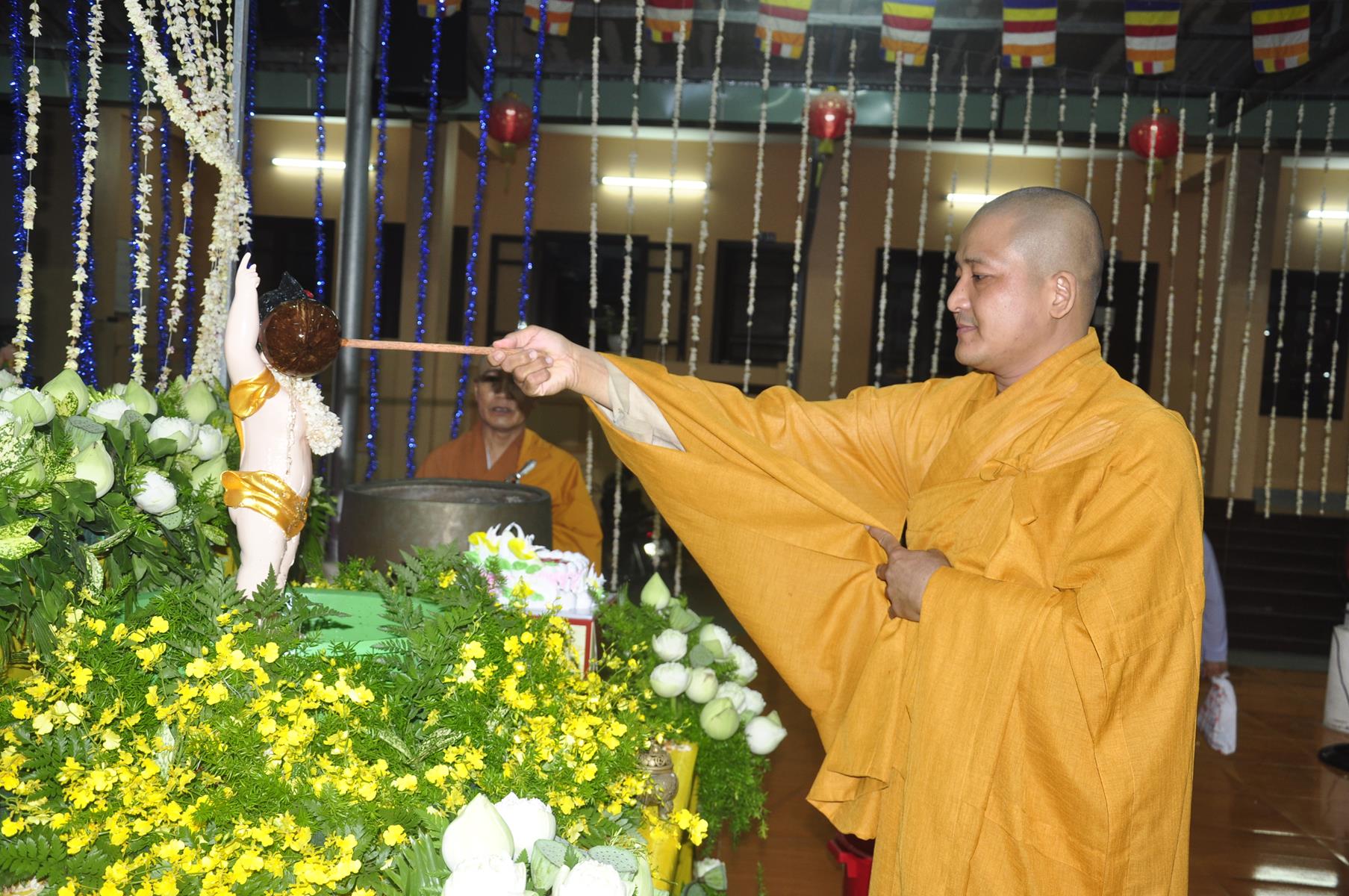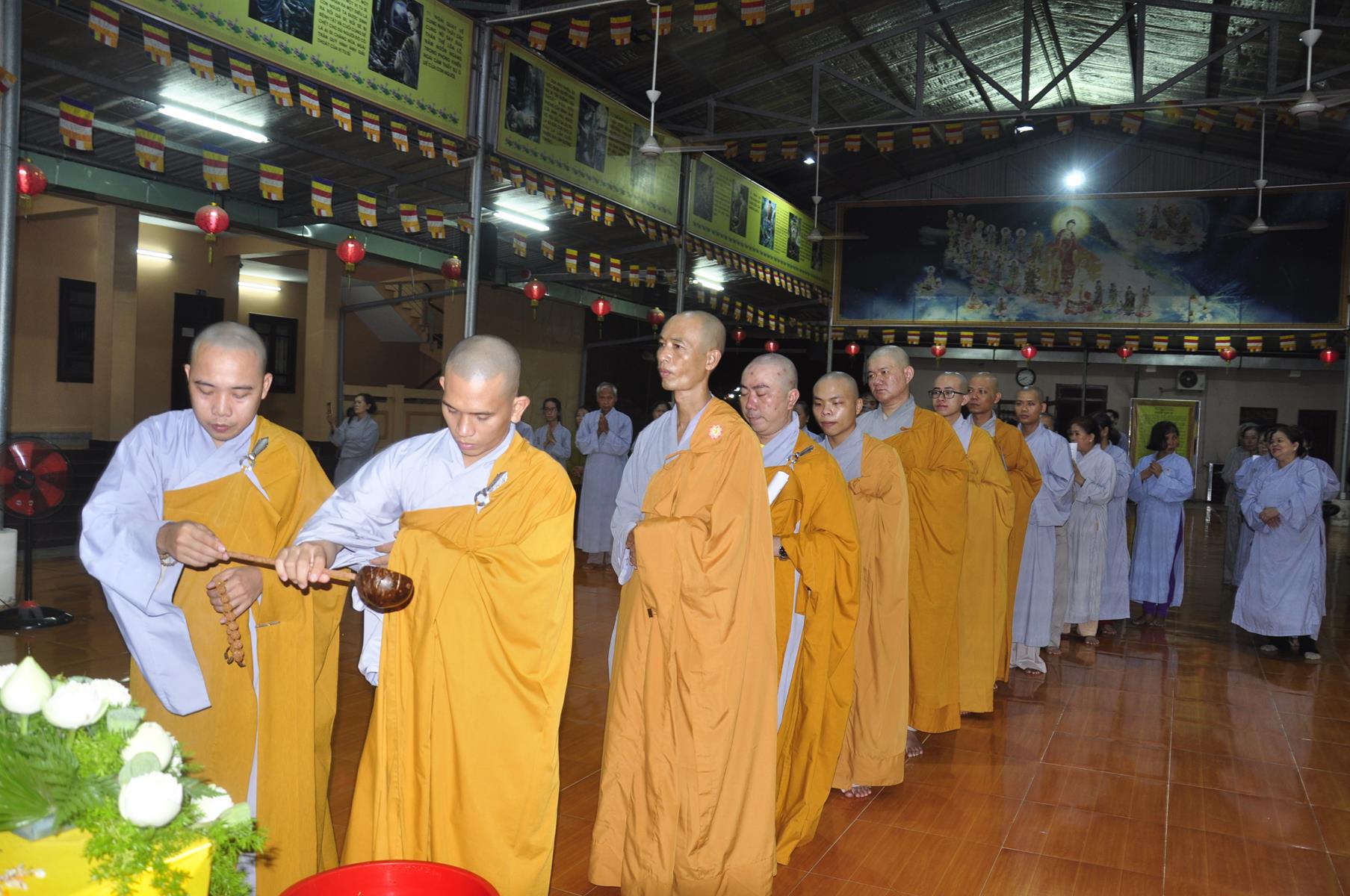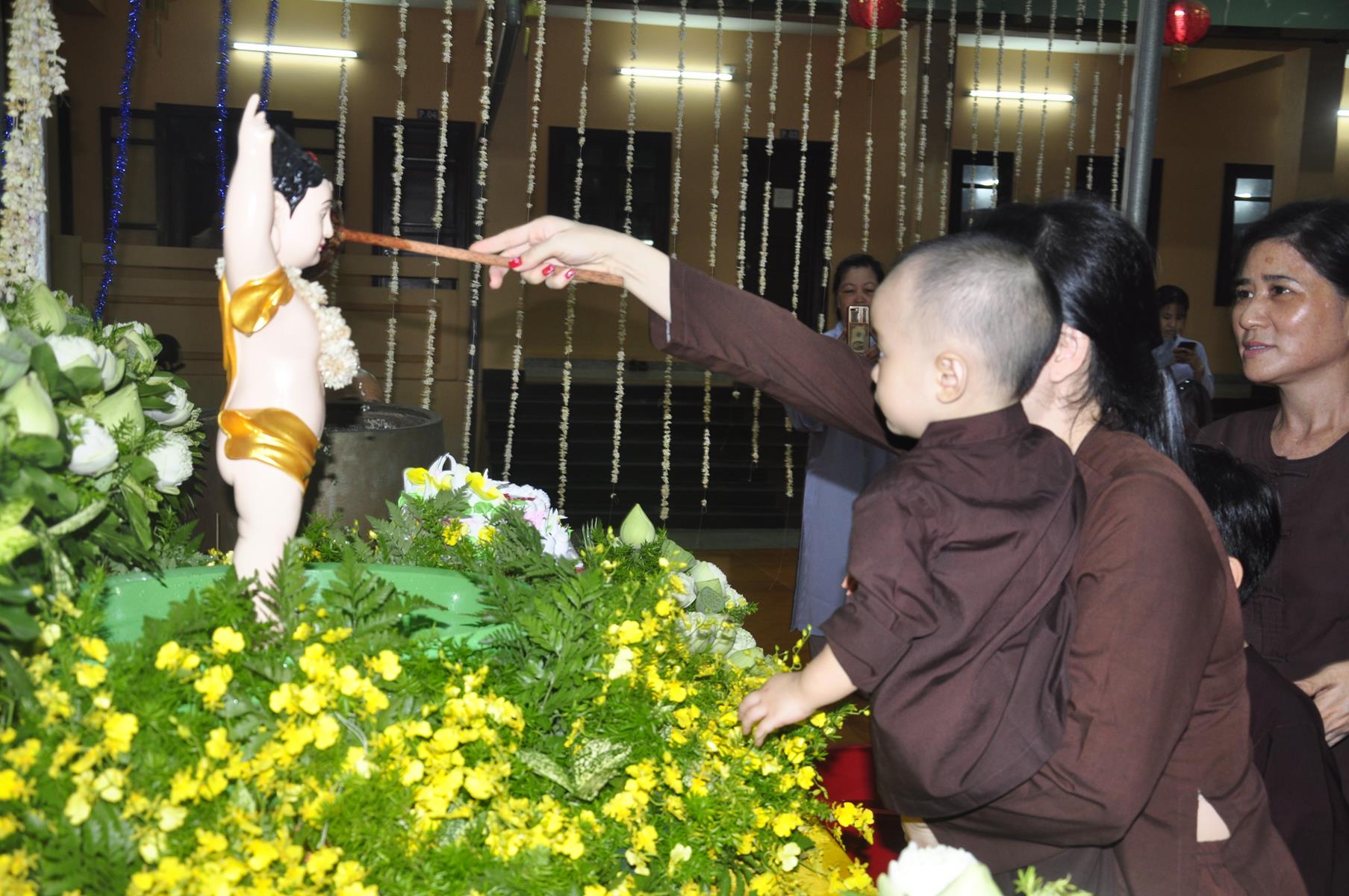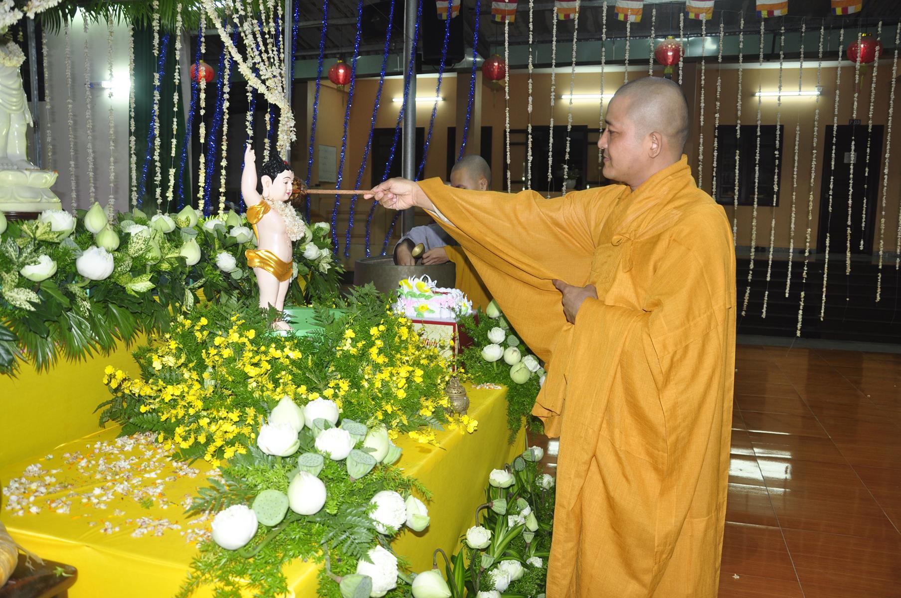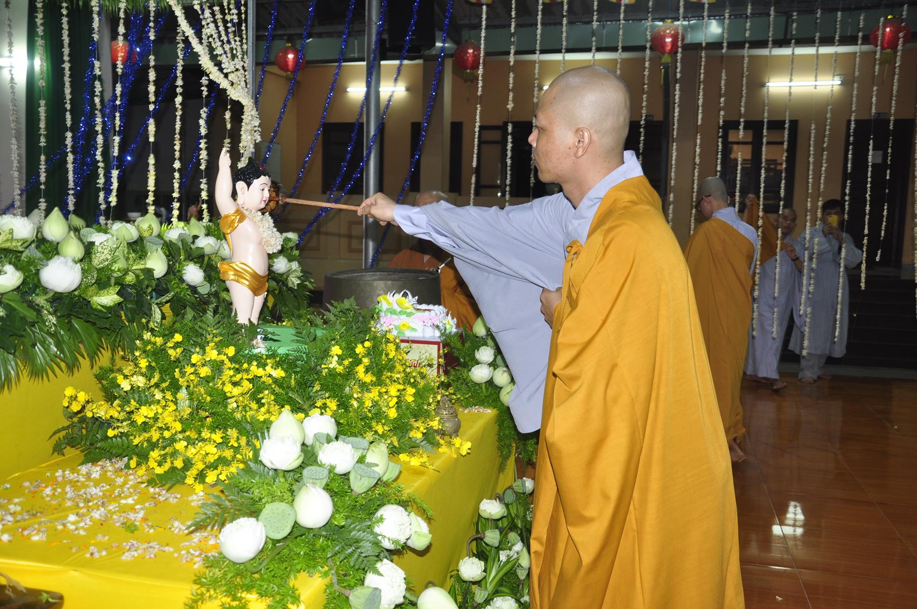 Tối cùng ngày, Ban Chủ Nhiệm cử hành nghi lễ tắm Phật để kính mừng Đại lễ Phật đản PL 2563 cho Tăng sinh Lớp Sơ cấp Phật học Long An và Phật tử chùa Pháp Minh.