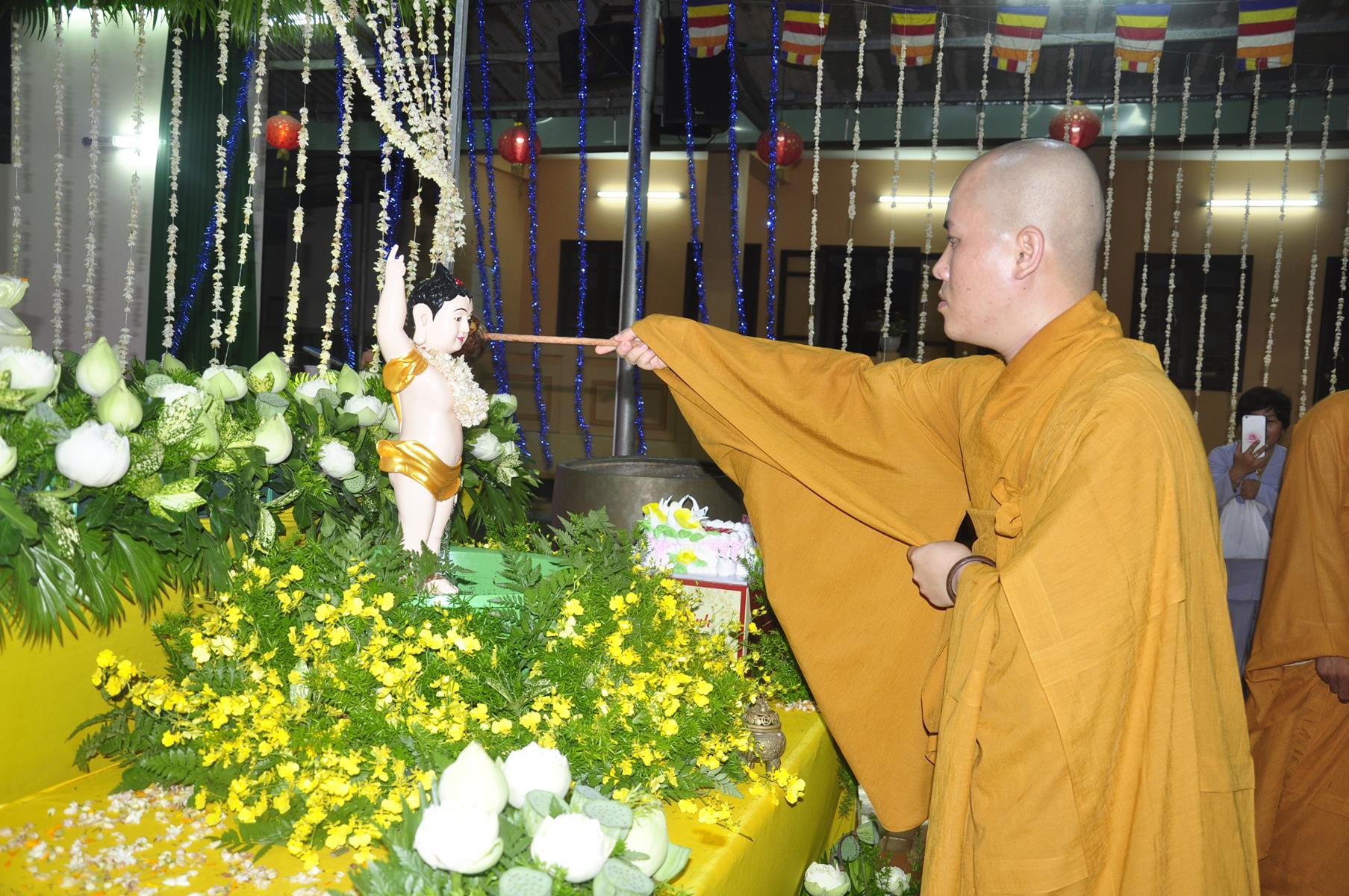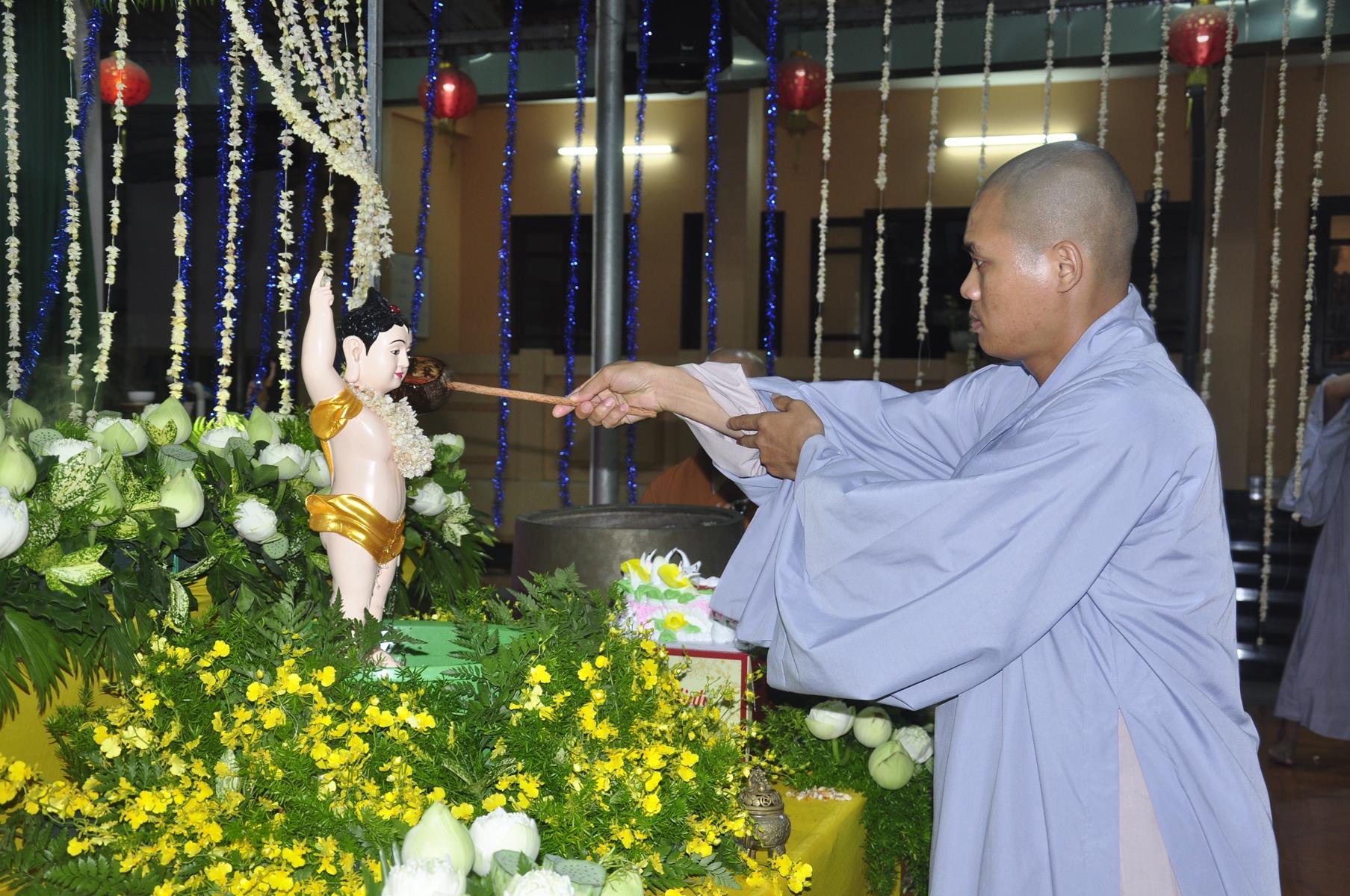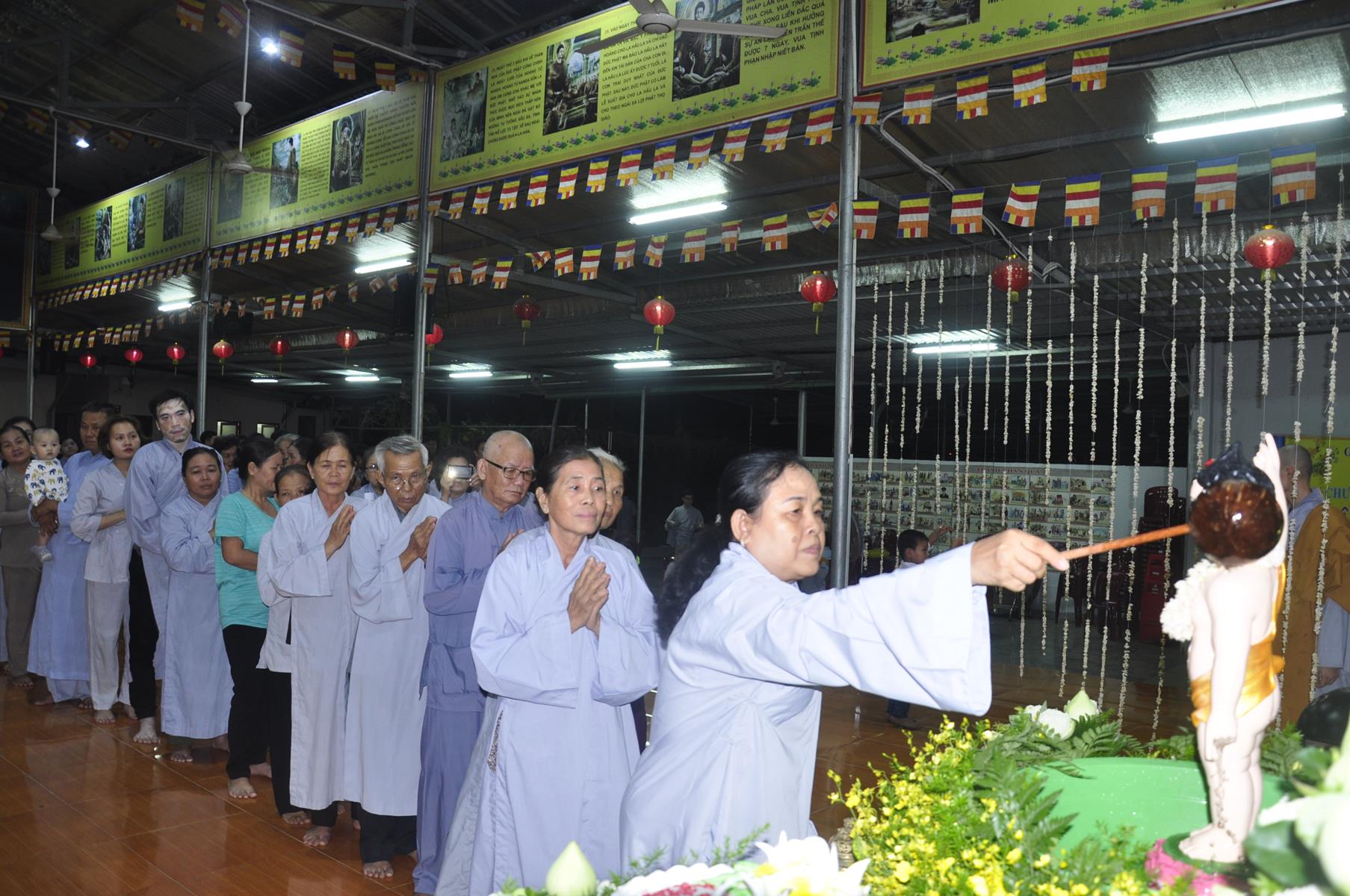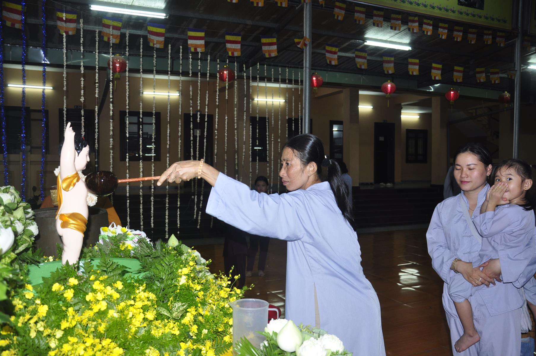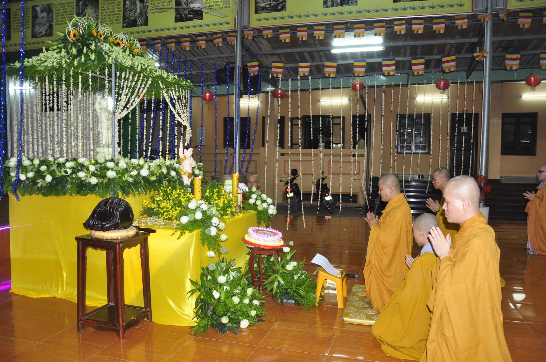Tối cùng ngày, Ban Chủ Nhiệm cử hành nghi lễ tắm Phật để kính mừng Đại lễ Phật đản PL 2563 cho Tăng sinh Lớp Sơ cấp Phật học Long An và Phật tử chùa Pháp Minh.