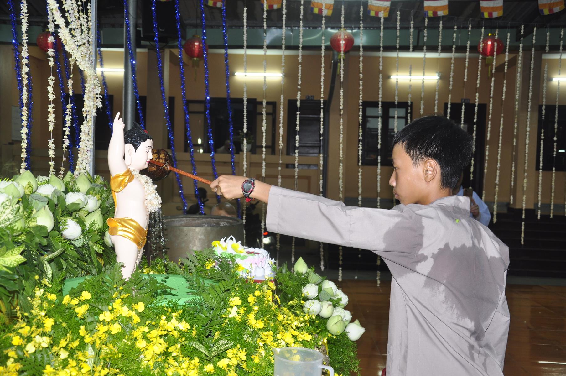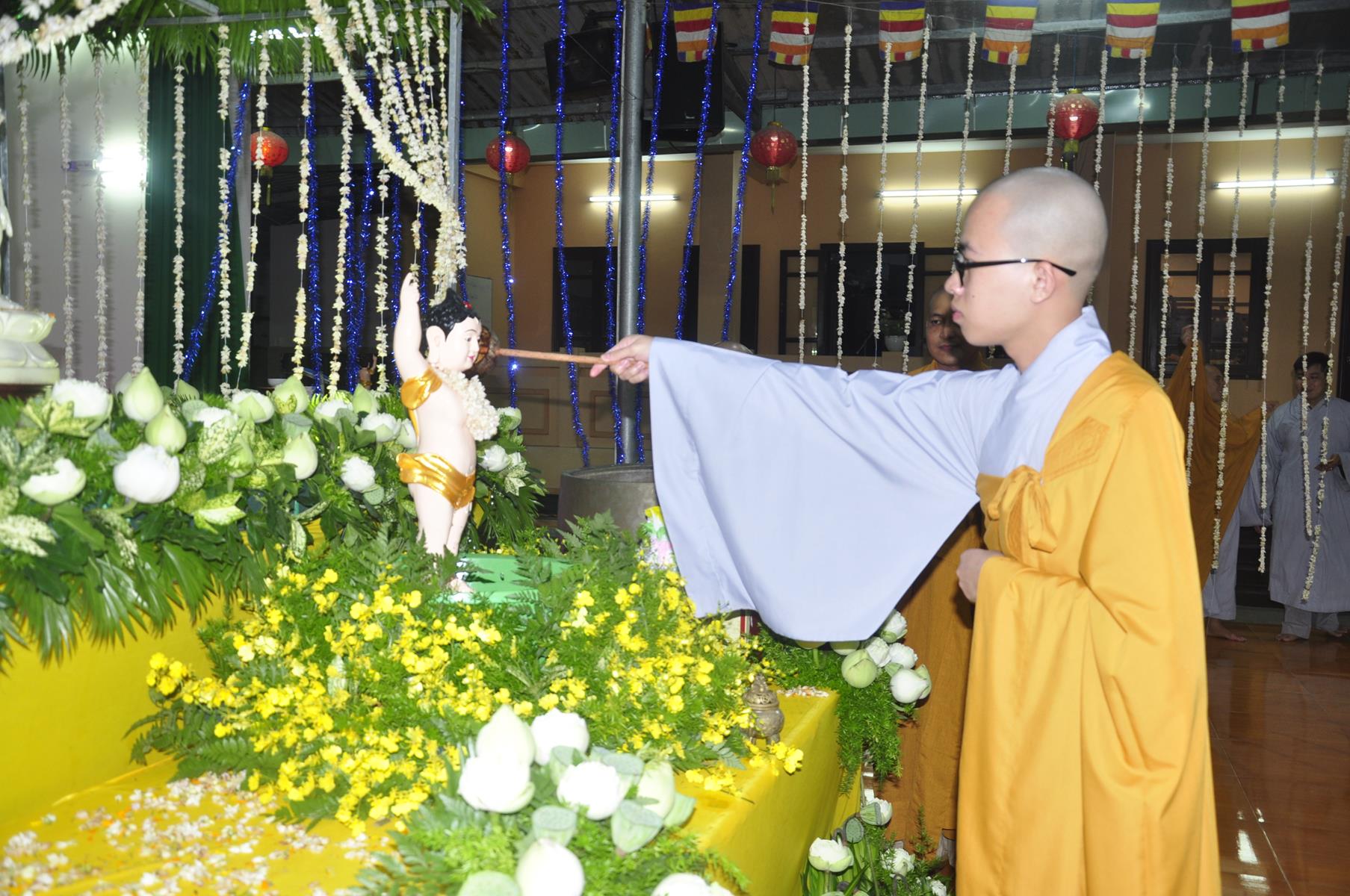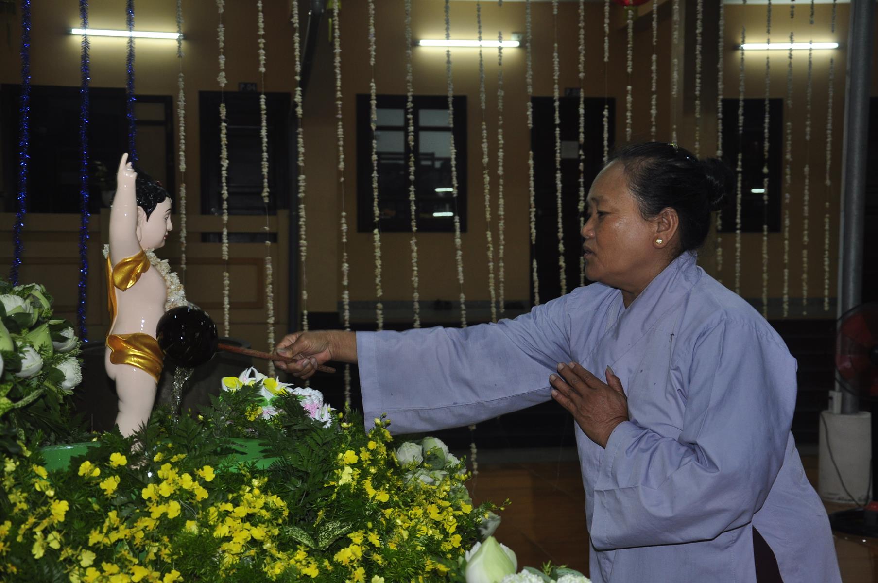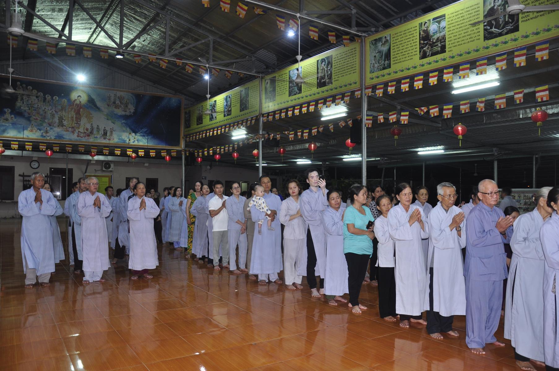 Tối cùng ngày, Ban Chủ Nhiệm cử hành nghi lễ tắm Phật để kính mừng Đại lễ Phật đản PL 2563 cho Tăng sinh Lớp Sơ cấp Phật học Long An và Phật tử chùa Pháp Minh.