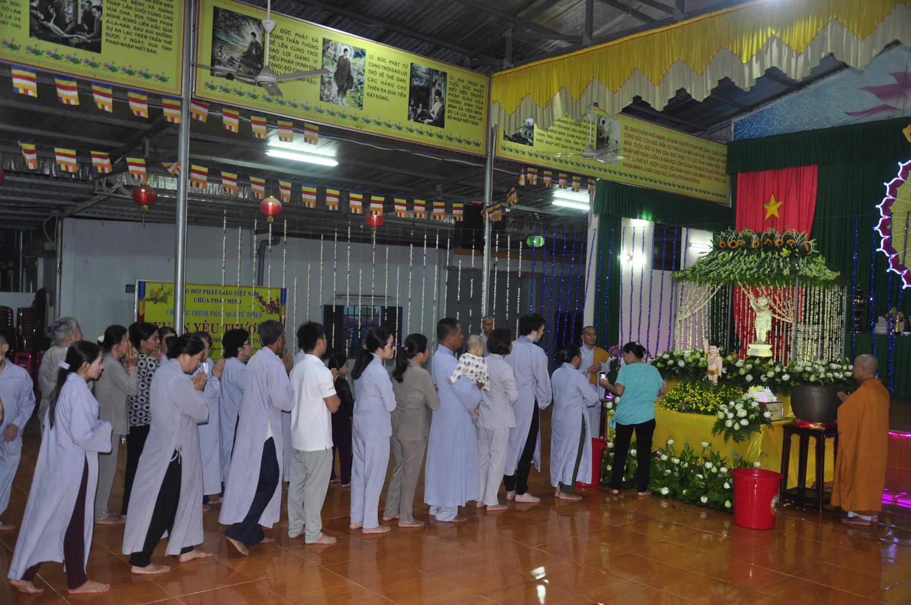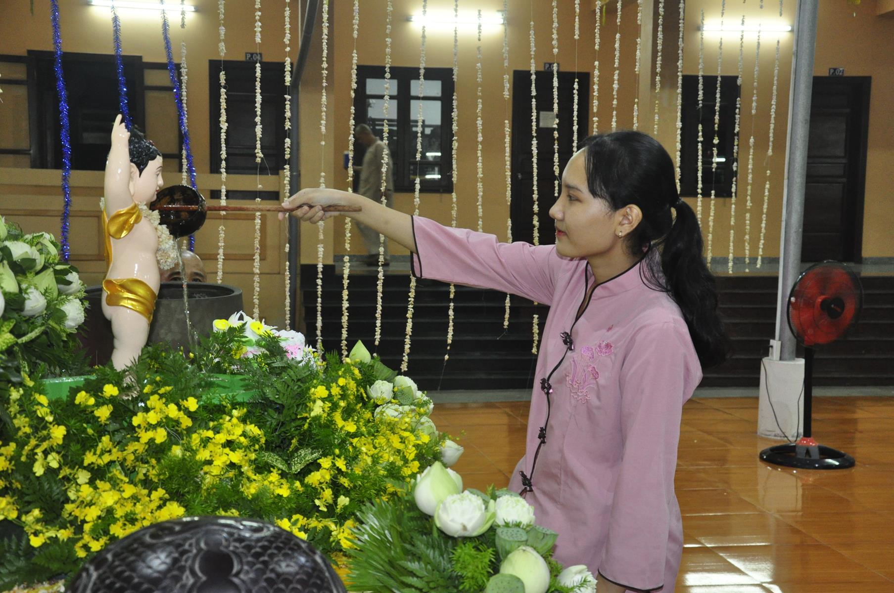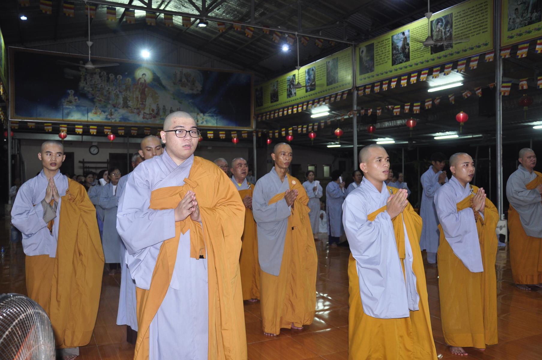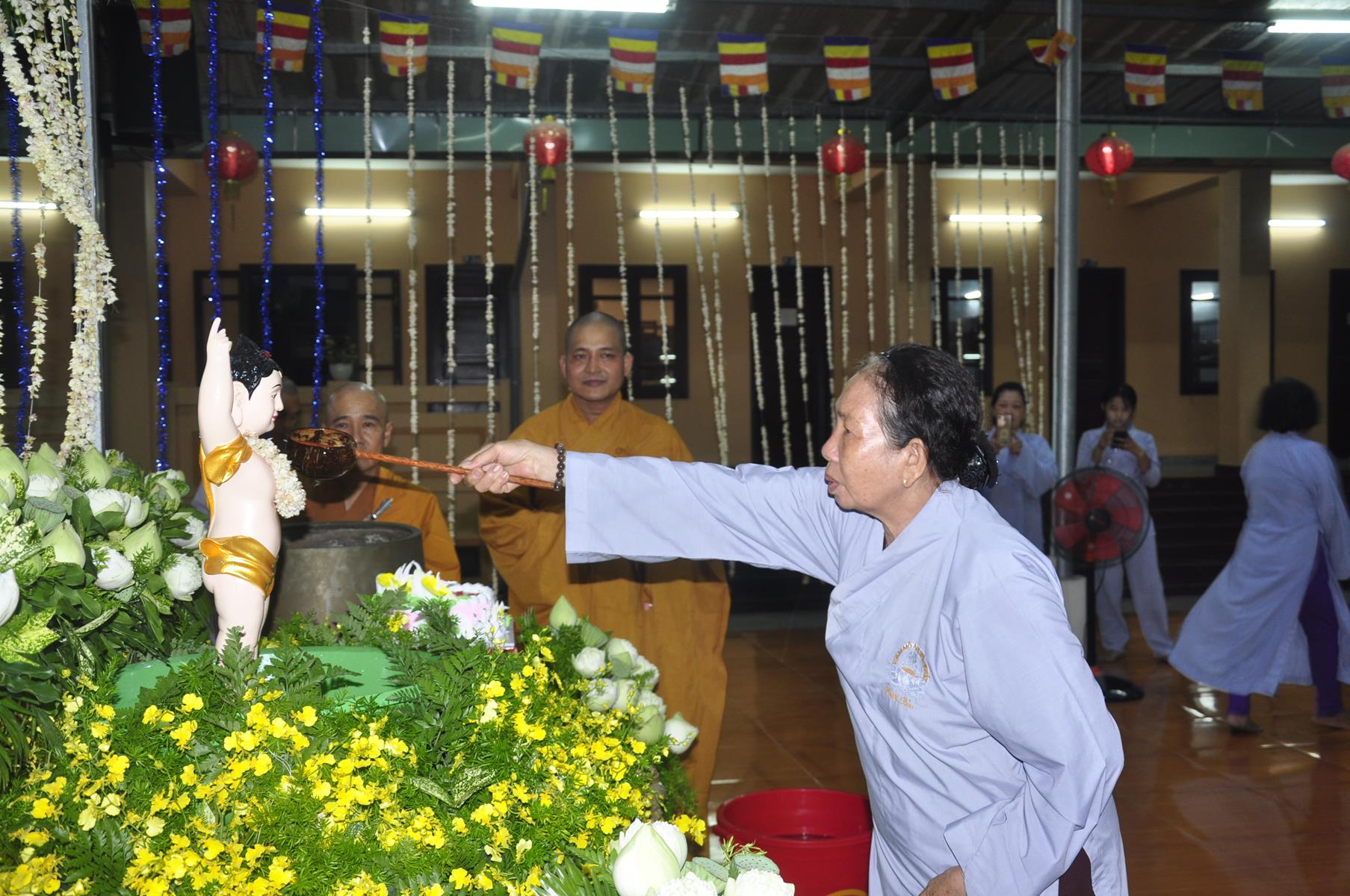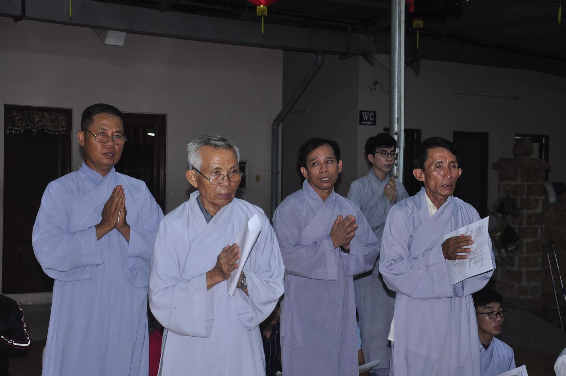 Tối cùng ngày, Ban Chủ Nhiệm cử hành nghi lễ tắm Phật để kính mừng Đại lễ Phật đản PL 2563 cho Tăng sinh Lớp Sơ cấp Phật học Long An và Phật tử chùa Pháp Minh.