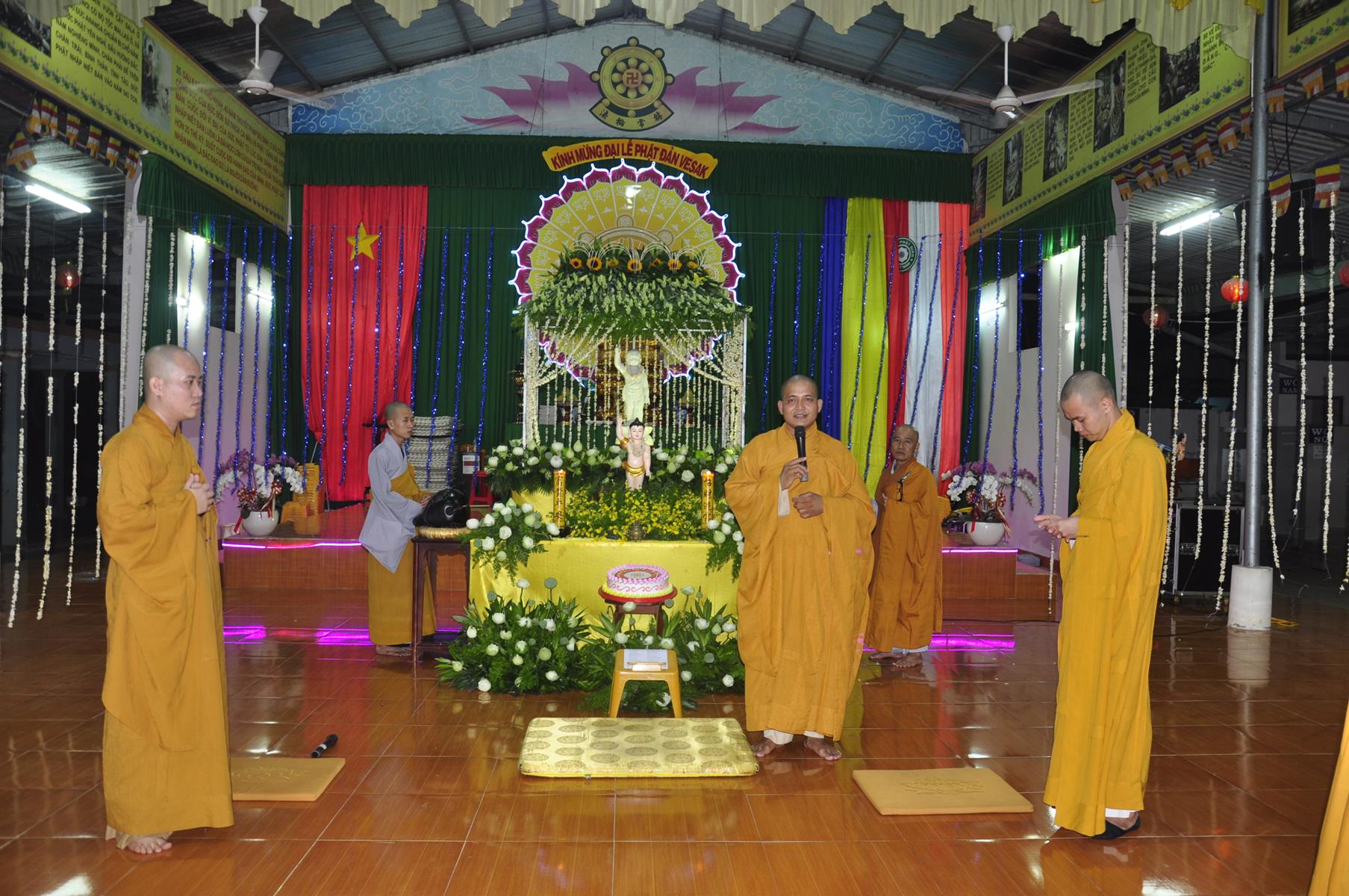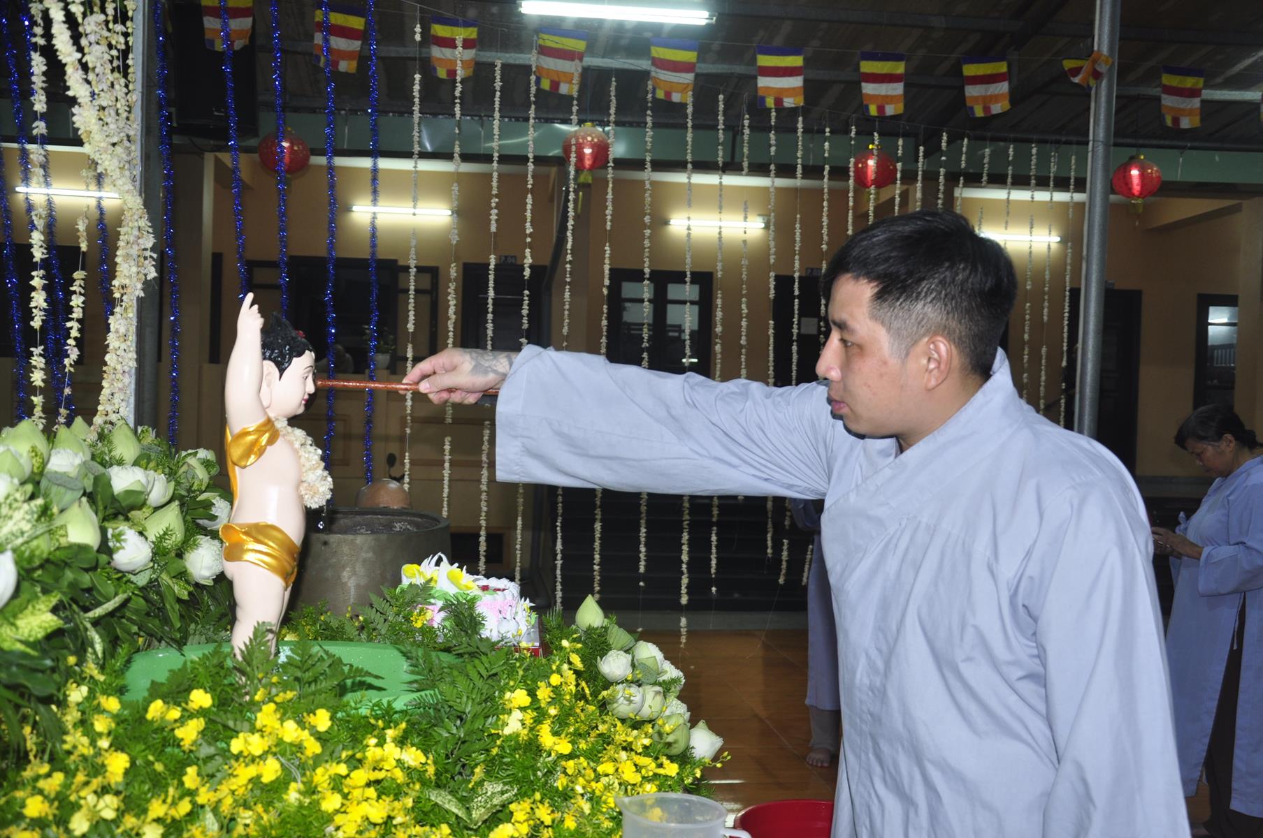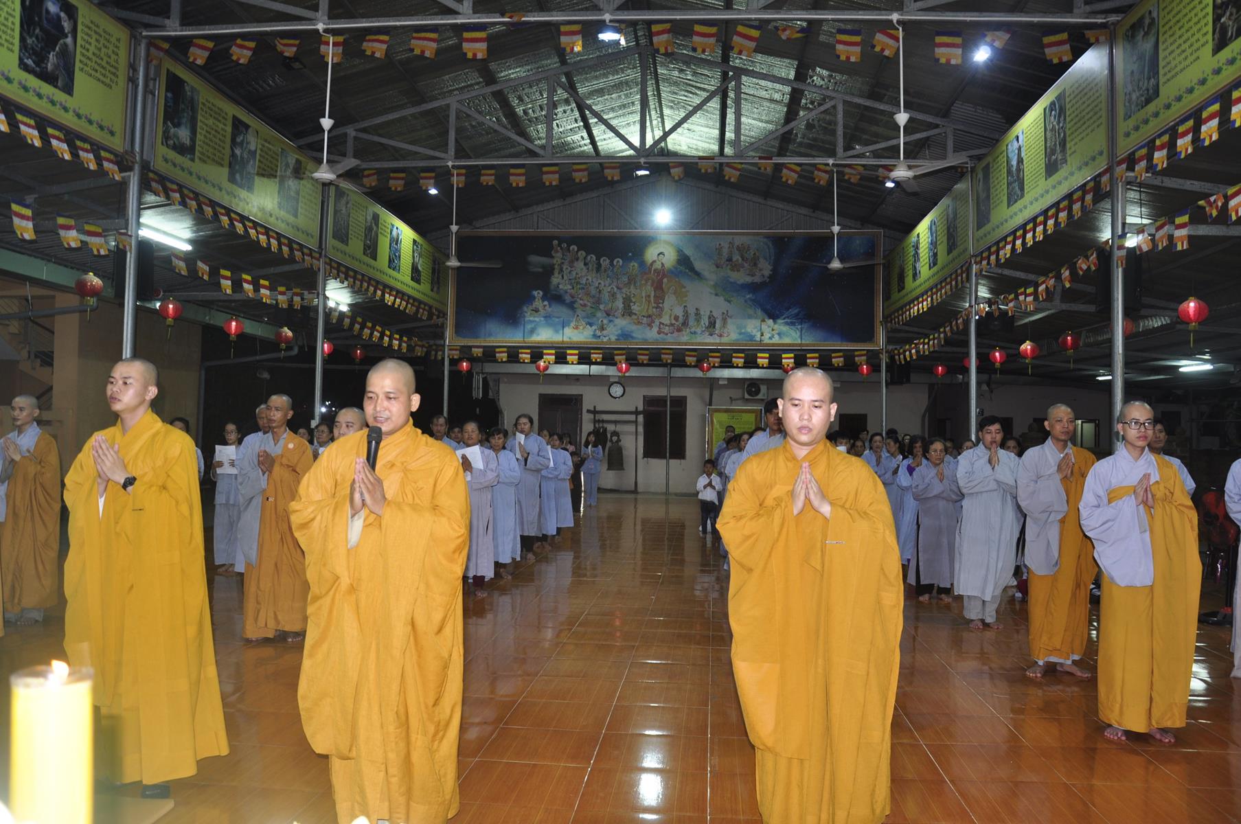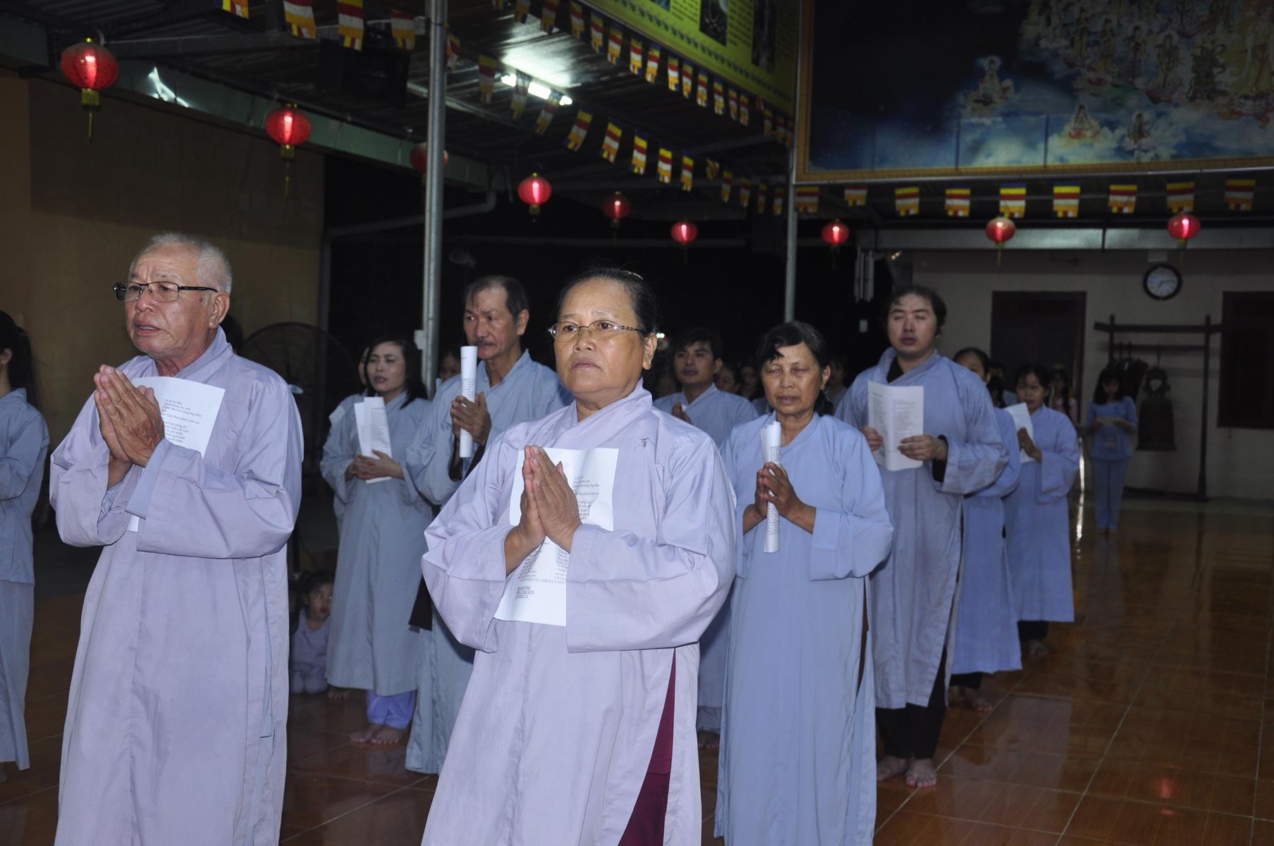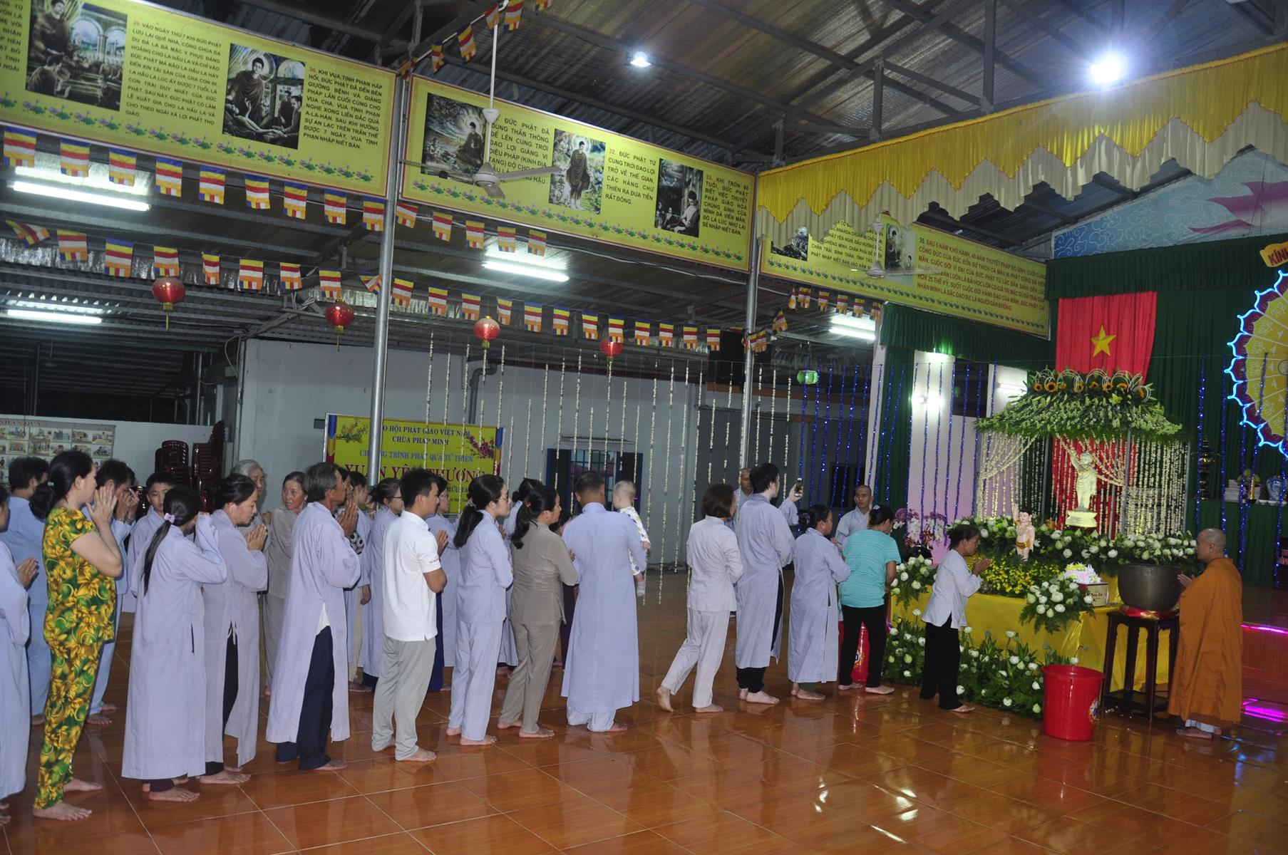 Tối cùng ngày, Ban Chủ Nhiệm cử hành nghi lễ tắm Phật để kính mừng Đại lễ Phật đản PL 2563 cho Tăng sinh Lớp Sơ cấp Phật học Long An và Phật tử chùa Pháp Minh.