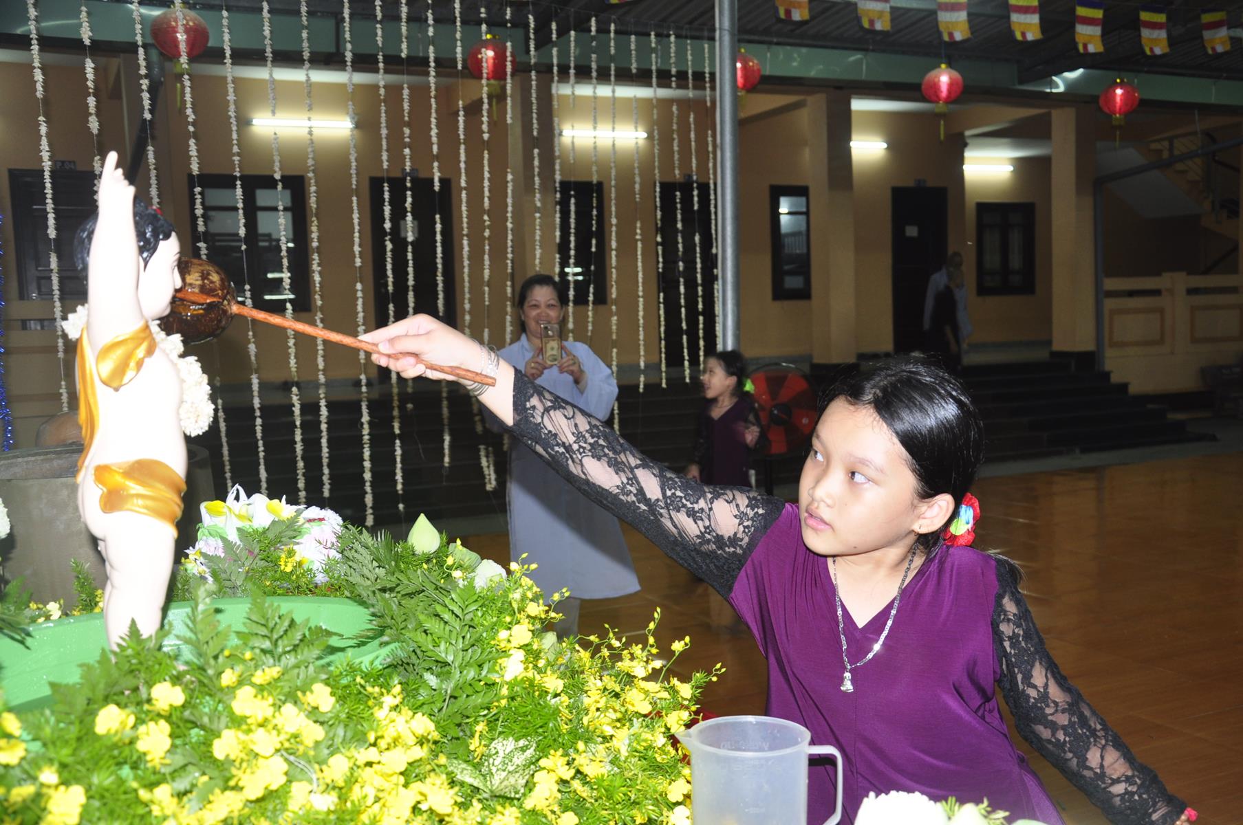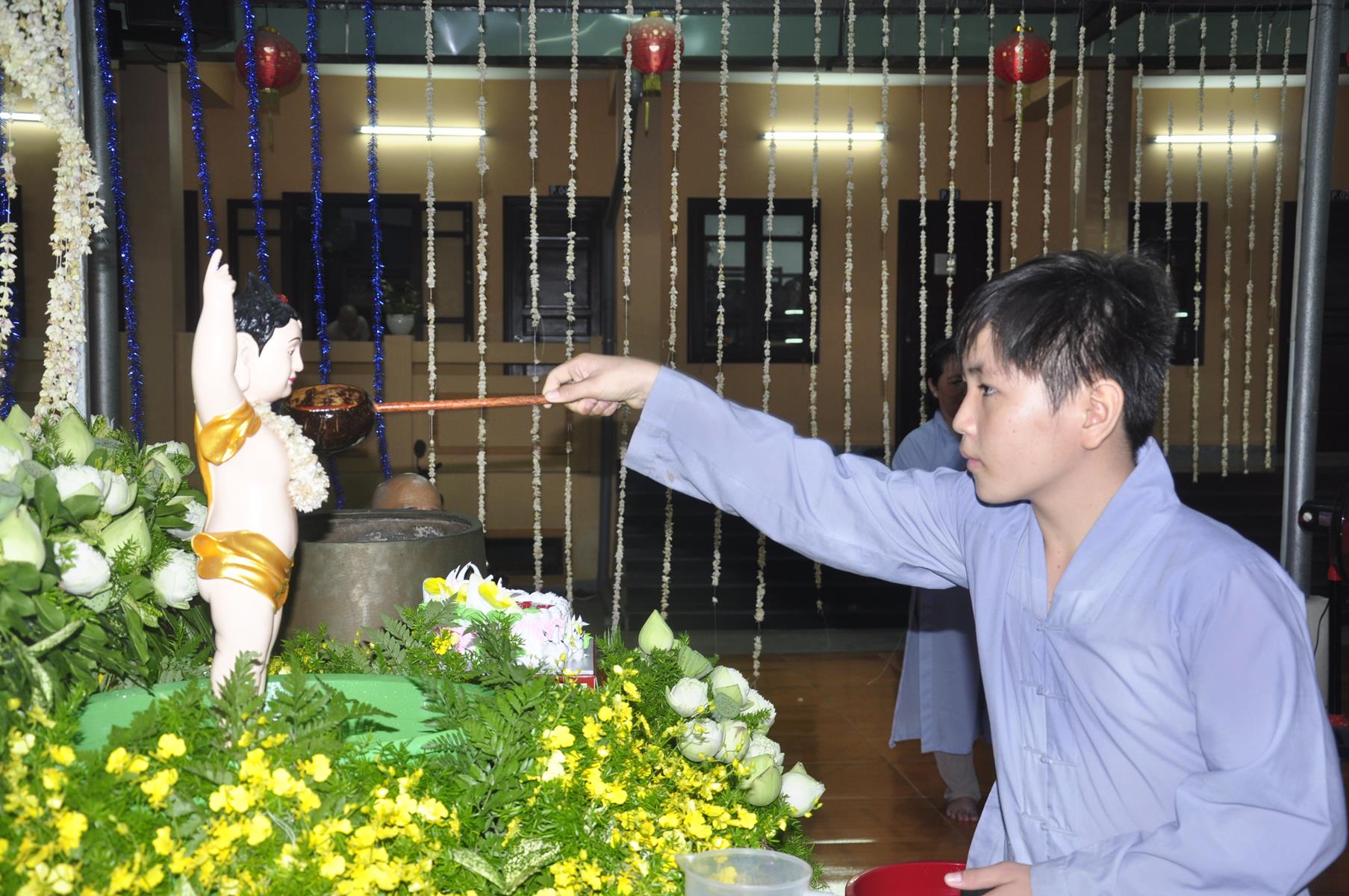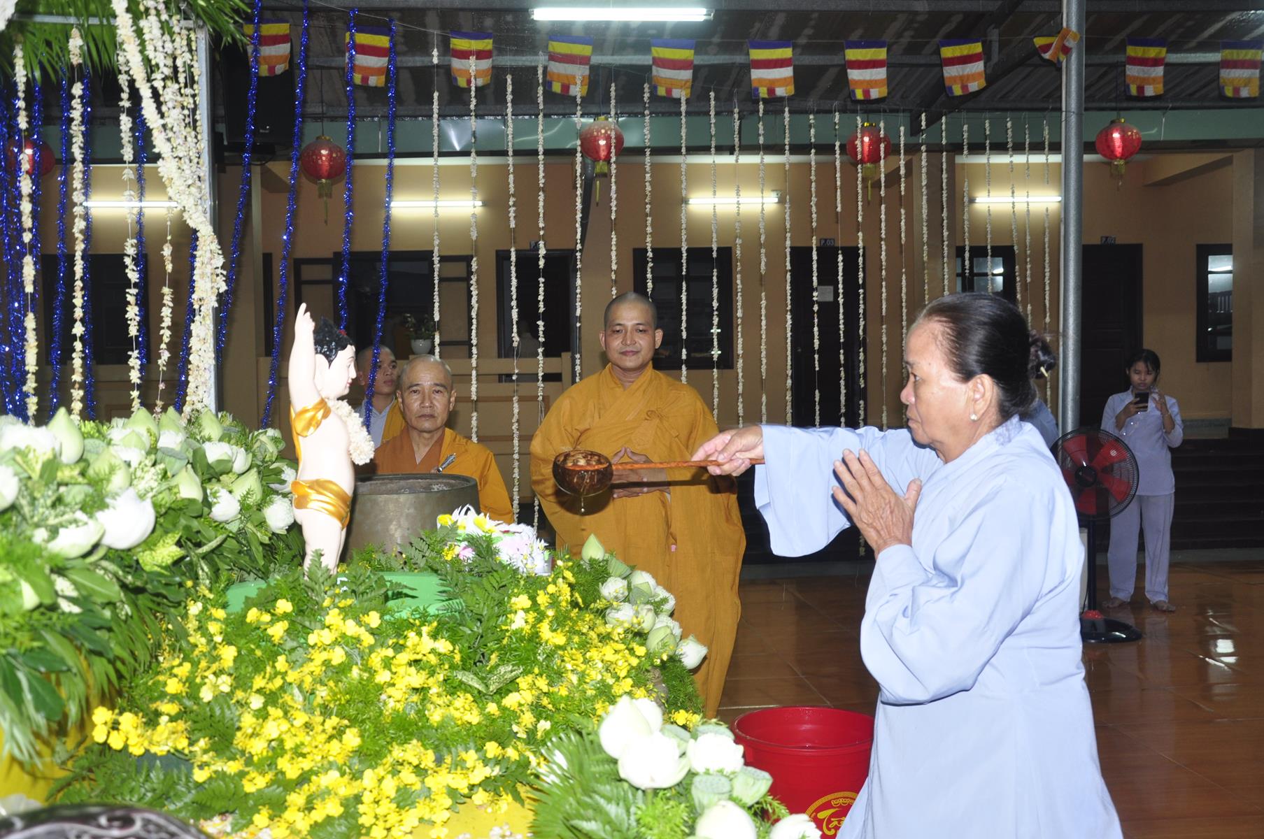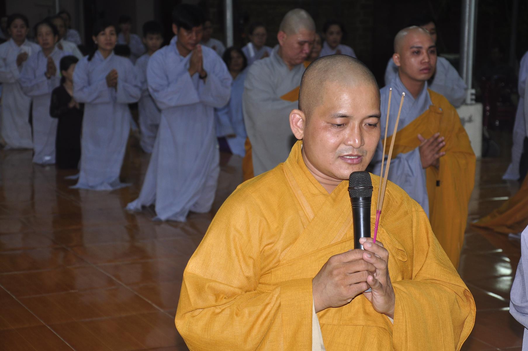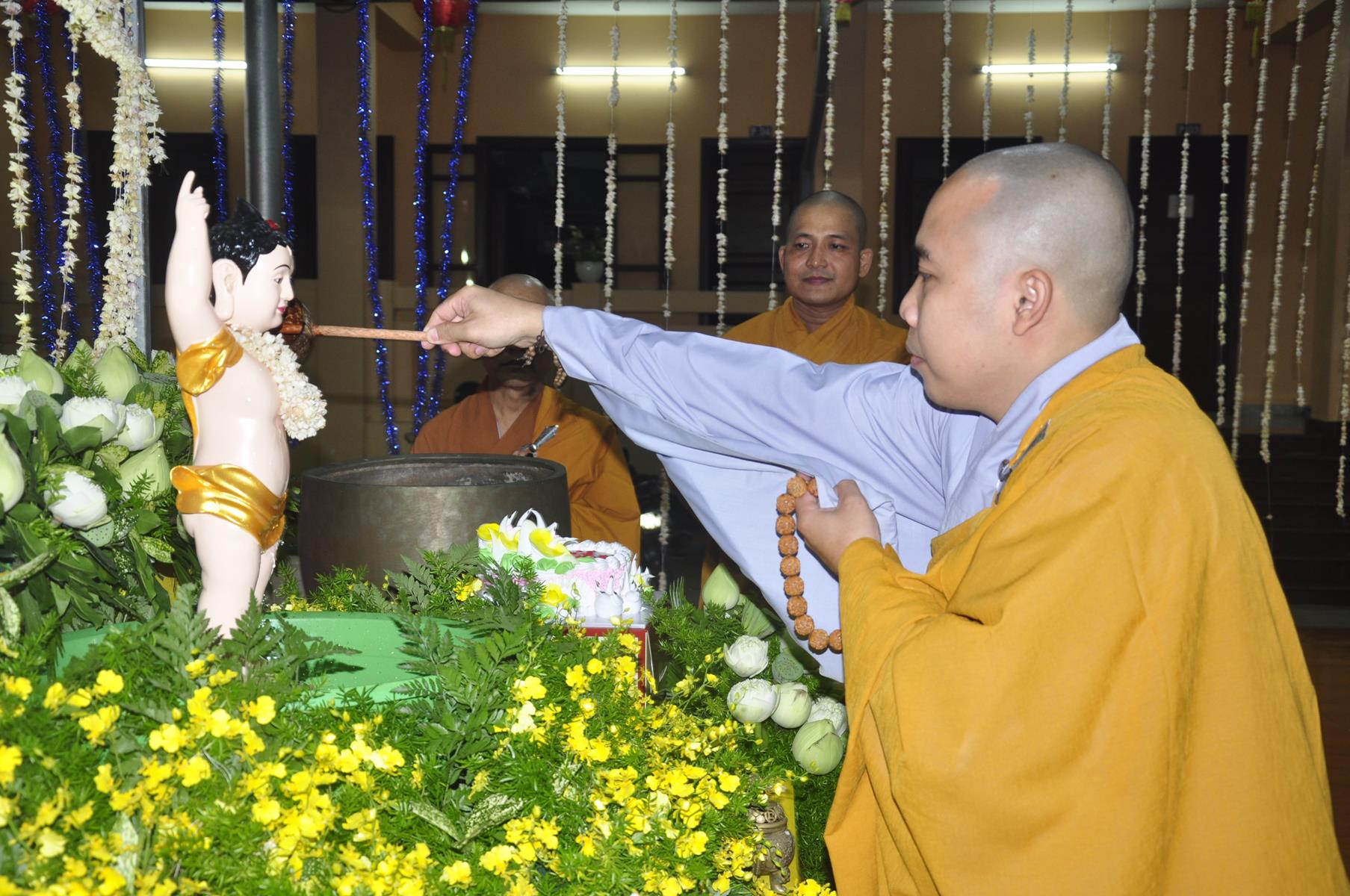 Tối cùng ngày, Ban Chủ Nhiệm cử hành nghi lễ tắm Phật để kính mừng Đại lễ Phật đản PL 2563 cho Tăng sinh Lớp Sơ cấp Phật học Long An và Phật tử chùa Pháp Minh.