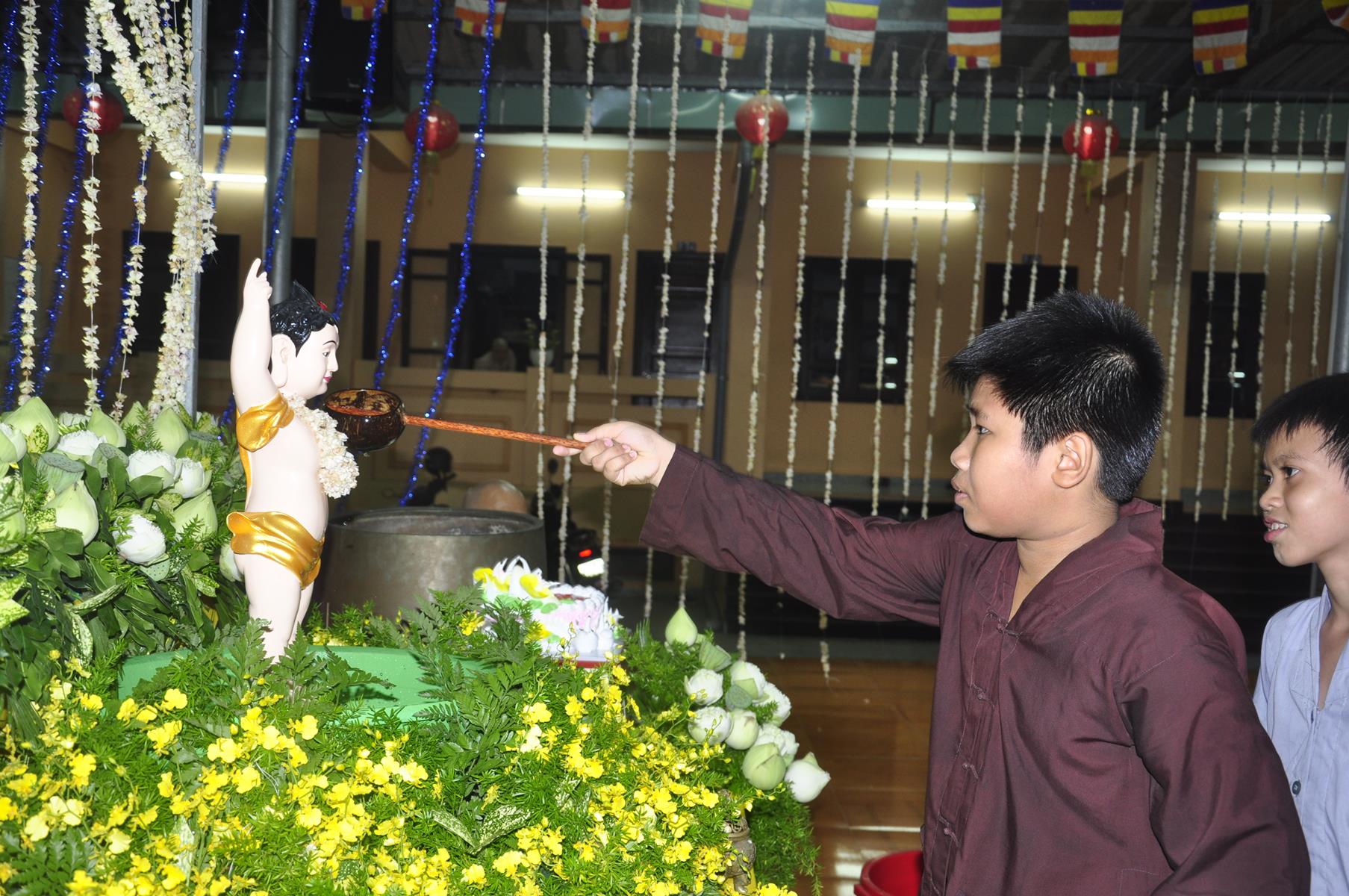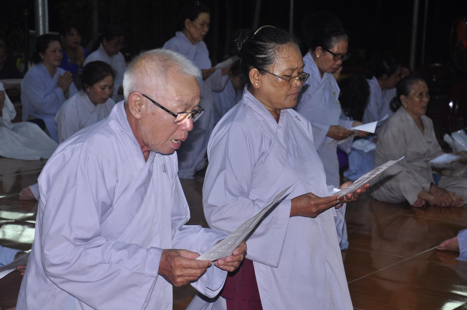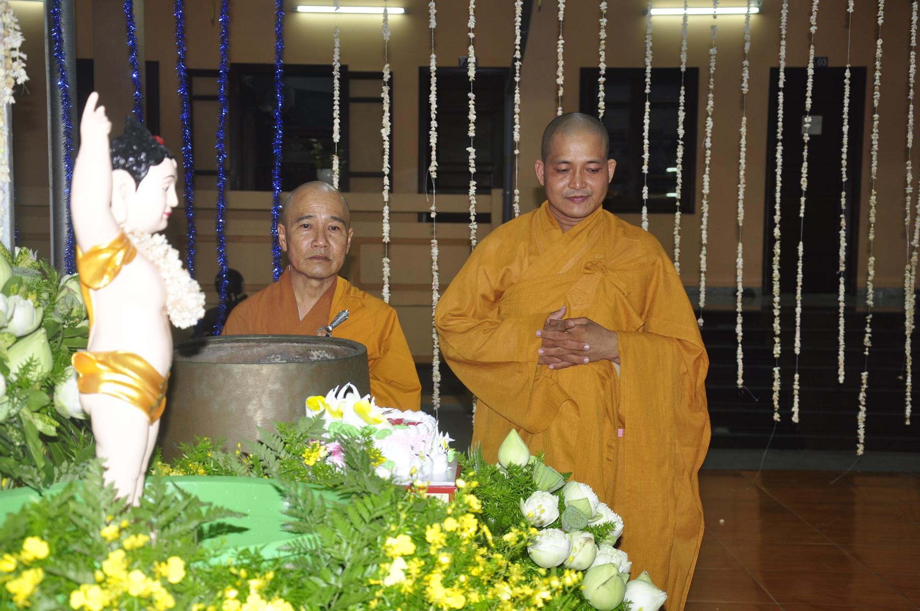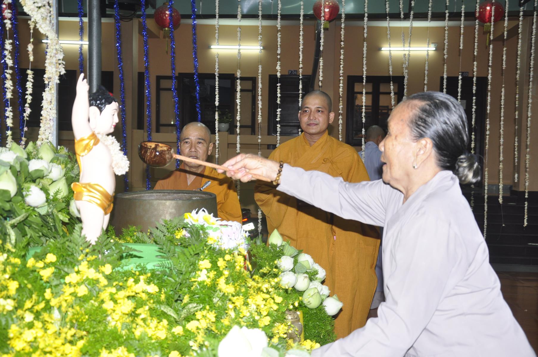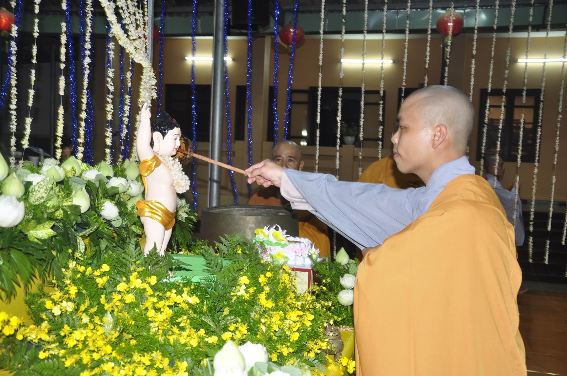 Tối cùng ngày, Ban Chủ Nhiệm cử hành nghi lễ tắm Phật để kính mừng Đại lễ Phật đản PL 2563 cho Tăng sinh Lớp Sơ cấp Phật học Long An và Phật tử chùa Pháp Minh.