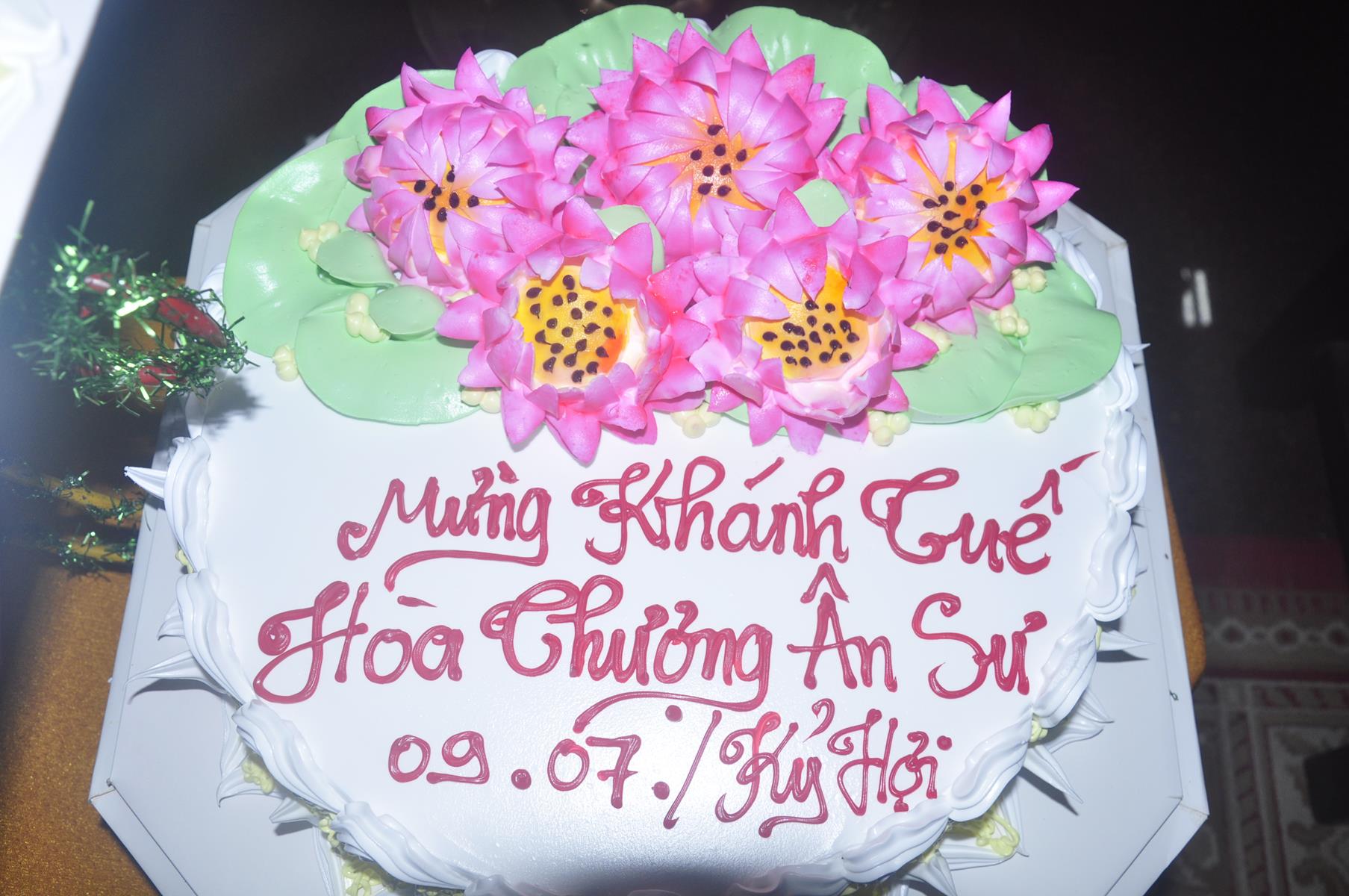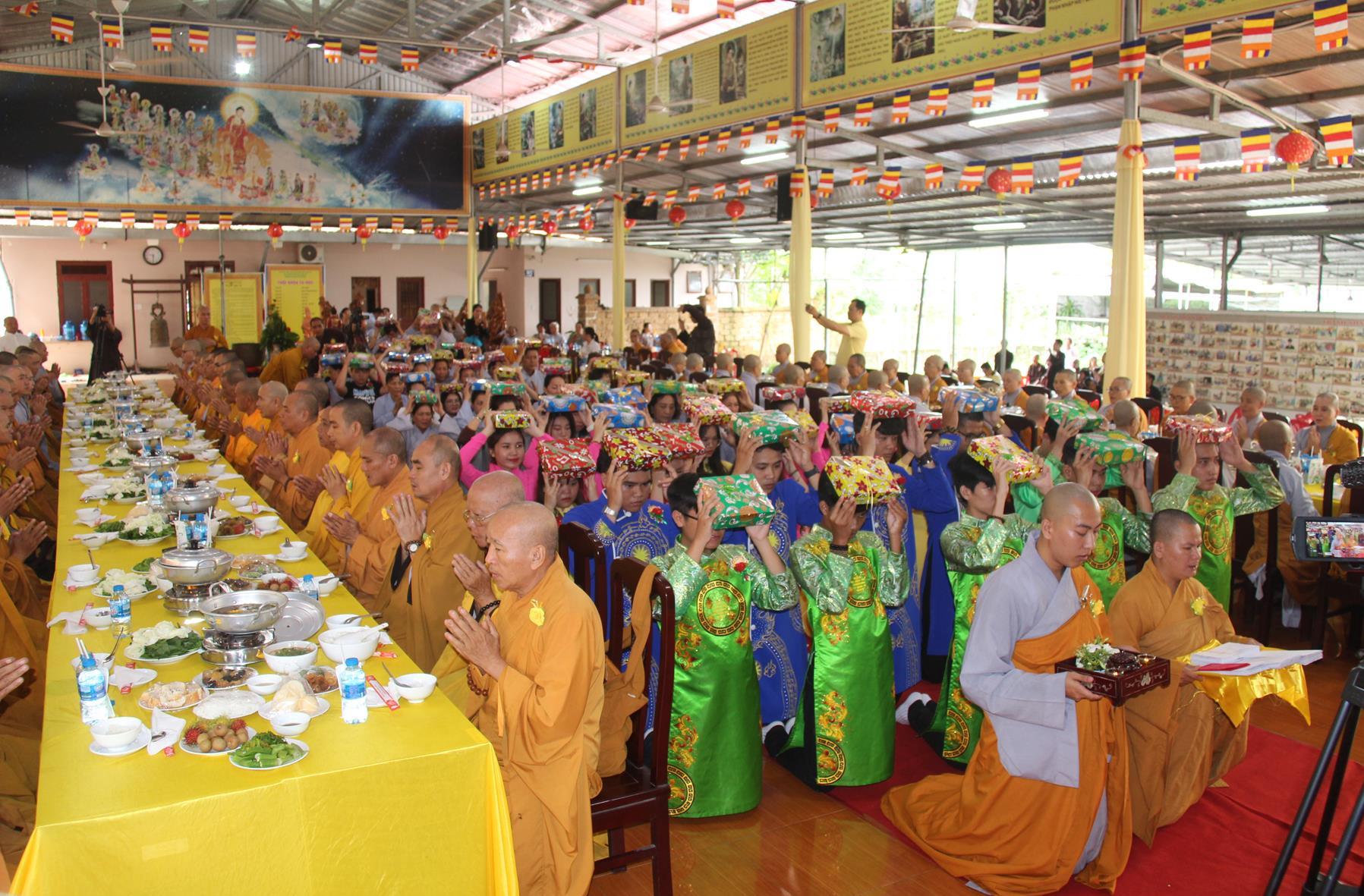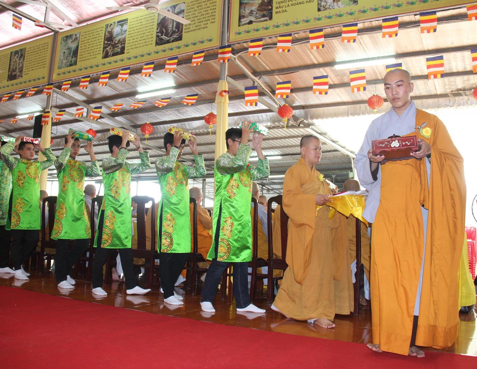Sau nghi thức niệm Phật cầu gia bị, giới thiệu chương trình và thành phần tham dự, chương trình, ĐĐ Thích Minh Trí: Thư ký Ban Trị sự GHPGVN liên huyện Đức Hòa Đức Huệ thuyết minh ý nghĩa cài hoa hồng. Tăng sinh trung nhân, thay lời Tăng Ni sinh lớp sơ cấp PHLA khóa VI và Phật tử dâng lời khánh tuế Chư Tôn đức và tác bạch cúng dường, dâng pháp y ca sa.