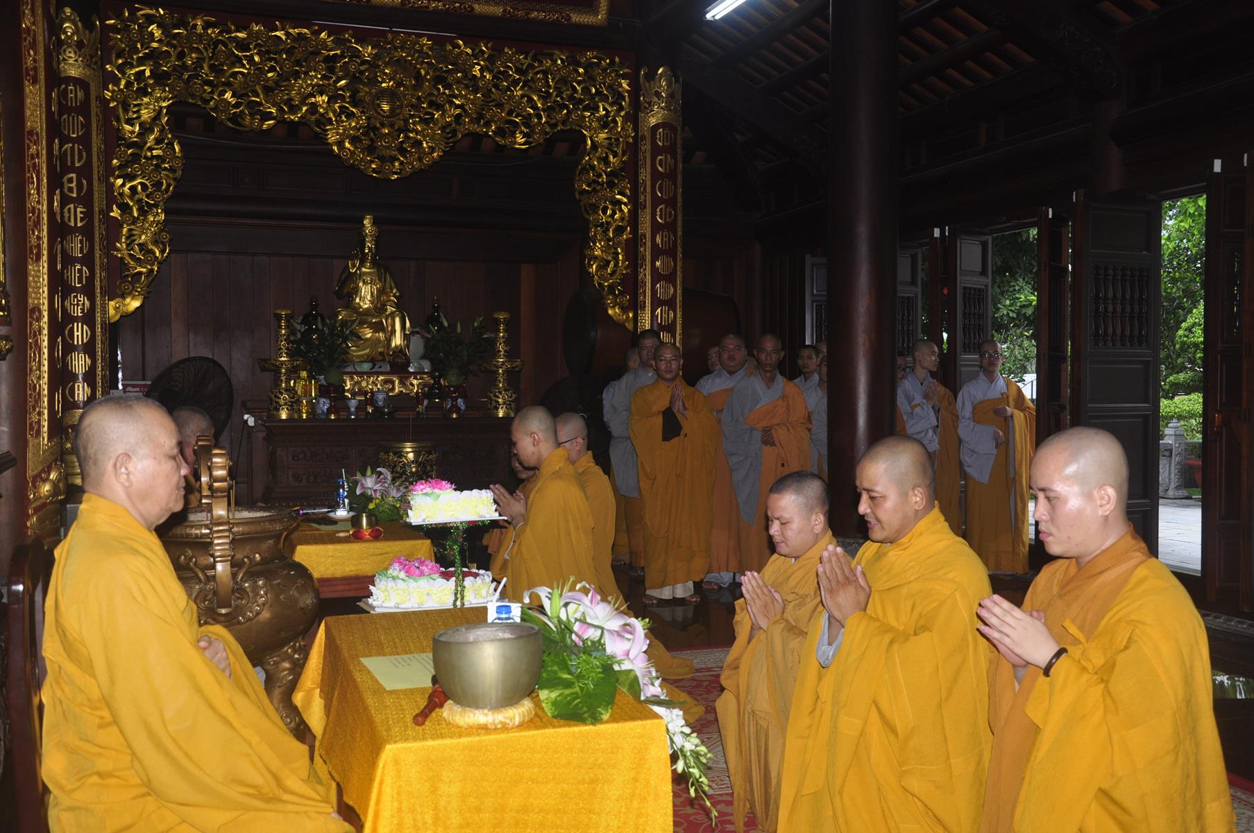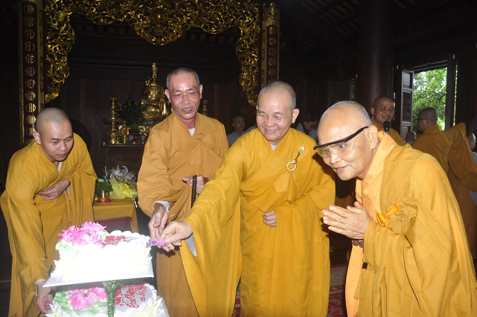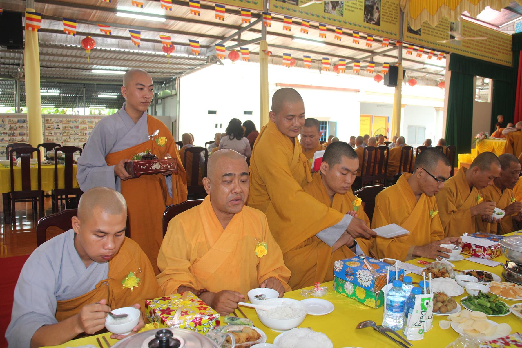 Sau nghi thức niệm Phật cầu gia bị, giới thiệu chương trình và thành phần tham dự, chương trình, ĐĐ Thích Minh Trí: Thư ký Ban Trị sự GHPGVN liên huyện Đức Hòa Đức Huệ thuyết minh ý nghĩa cài hoa hồng. Tăng sinh trung nhân, thay lời Tăng Ni sinh lớp sơ cấp PHLA khóa VI và Phật tử dâng lời khánh tuế Chư Tôn đức và tác bạch cúng dường, dâng pháp y ca sa.