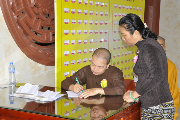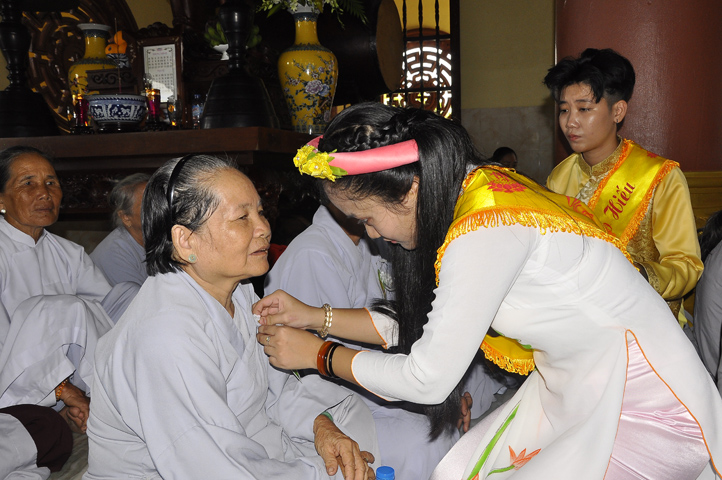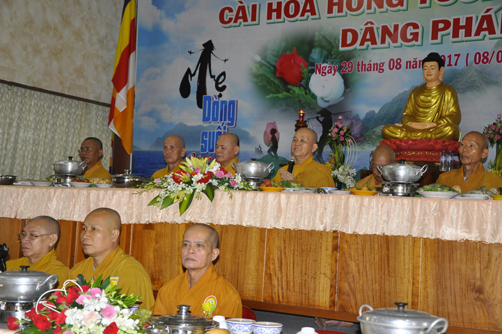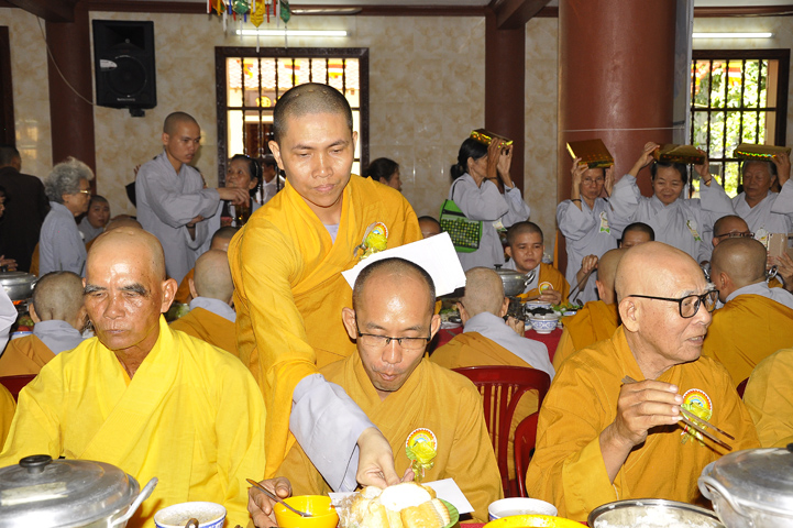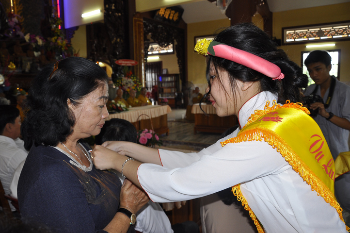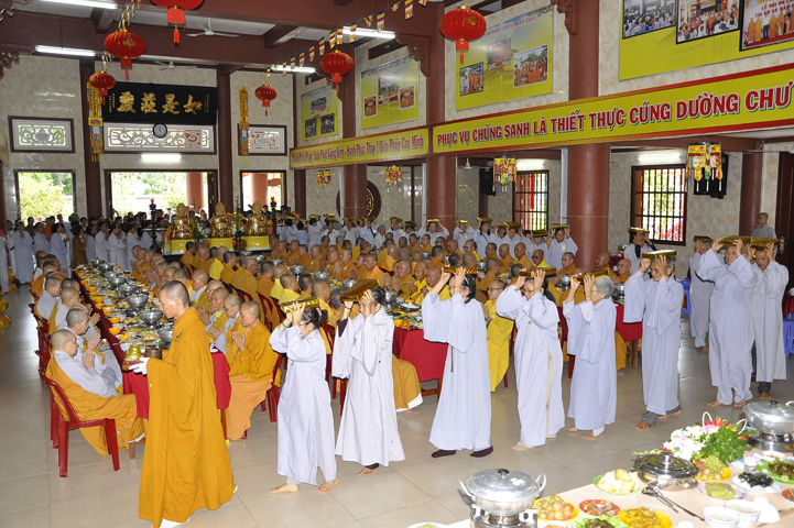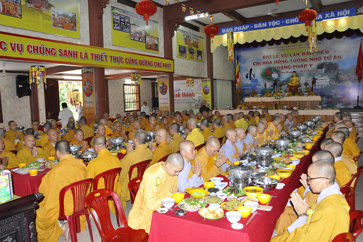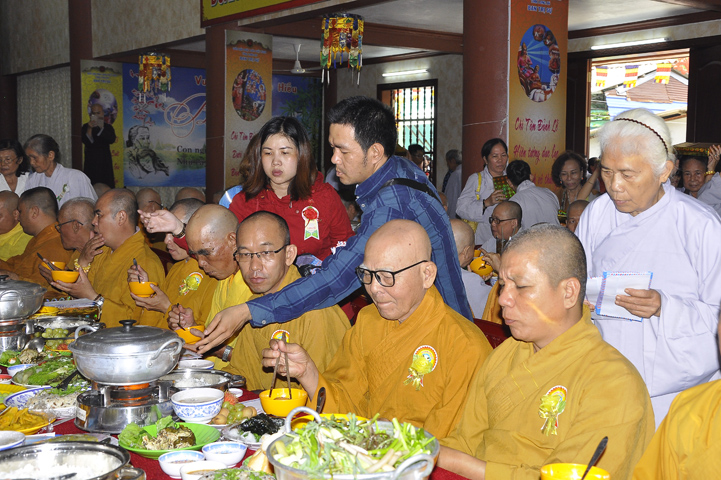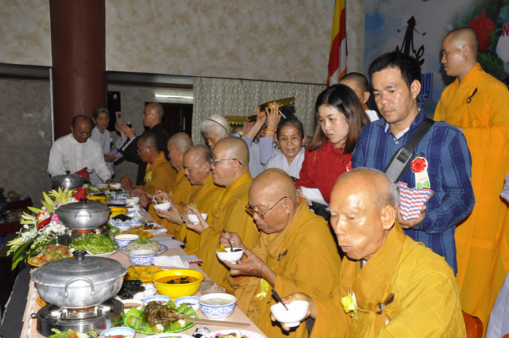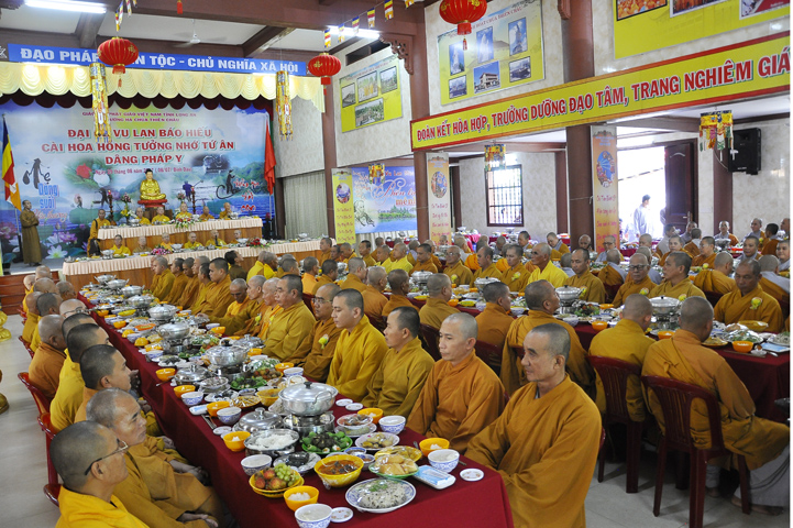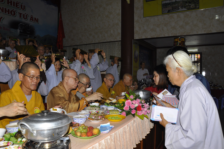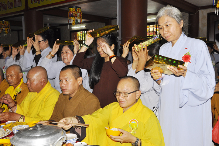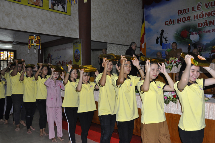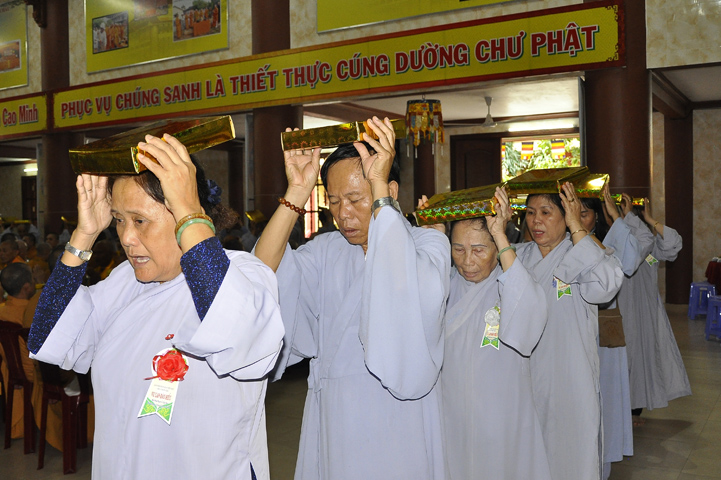 Sau lễ cài hoa hồng ban tổ chức hướng dẫn Phật tử cúng dường trai Tăng và dâng cúng pháp y.