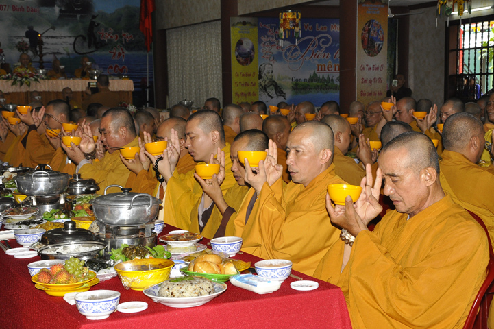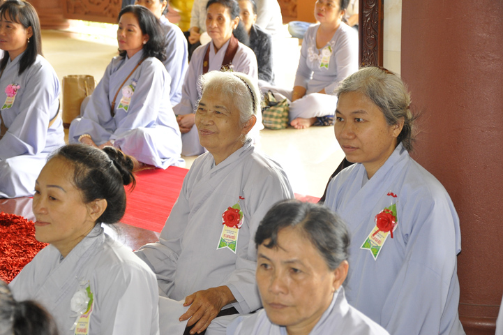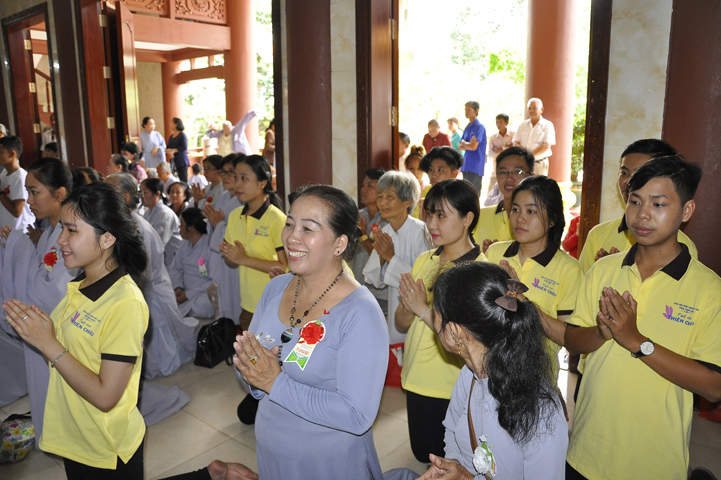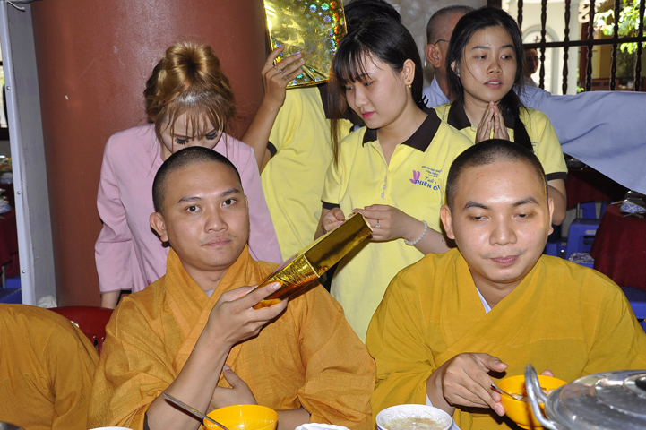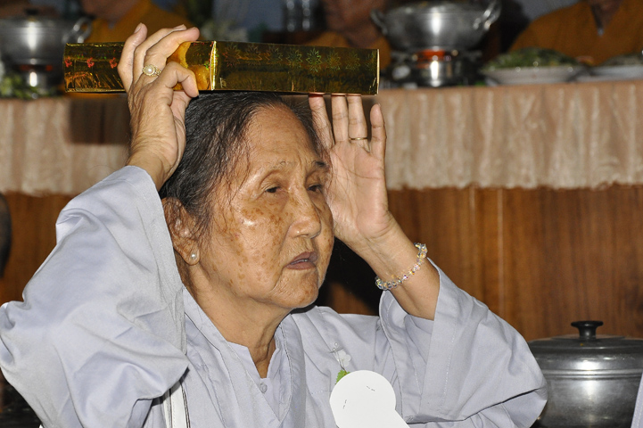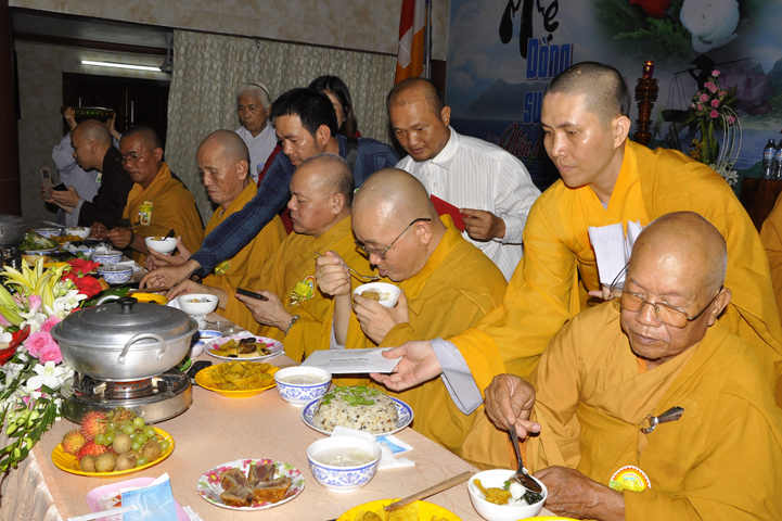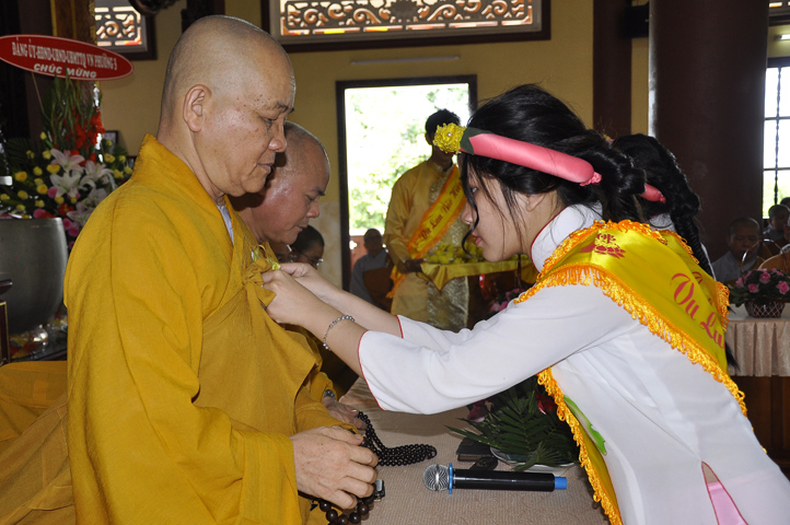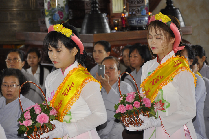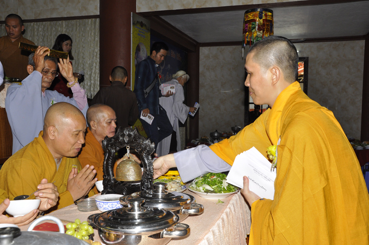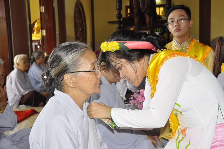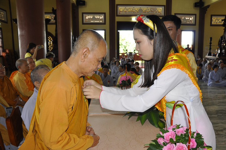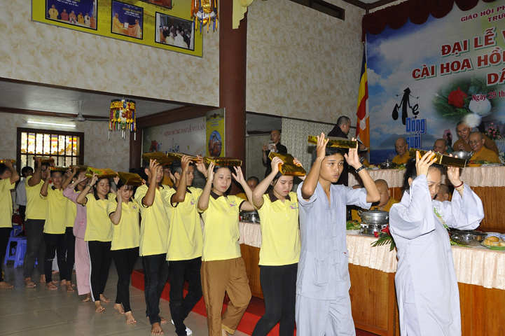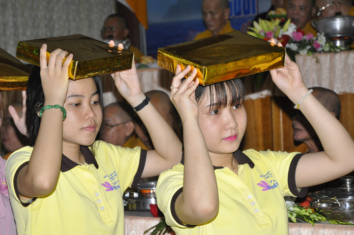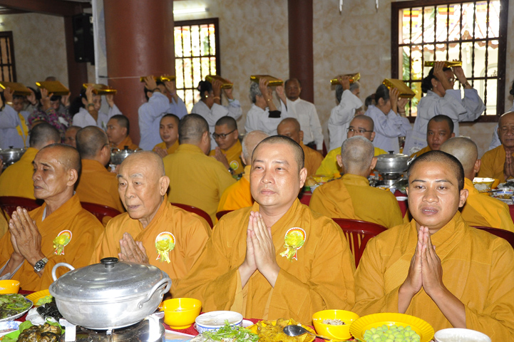 Sau lễ cài hoa hồng ban tổ chức hướng dẫn Phật tử cúng dường trai Tăng và dâng cúng pháp y.