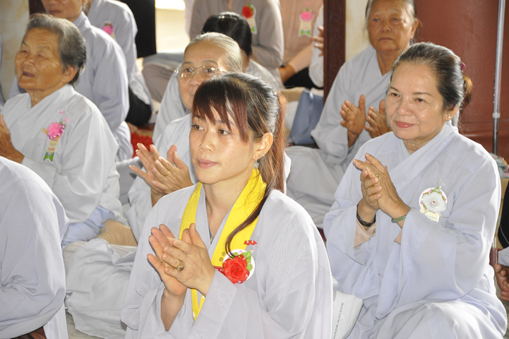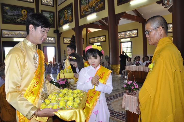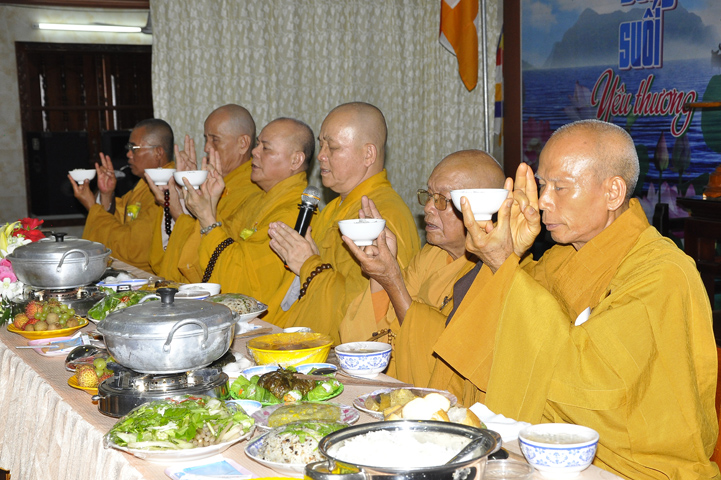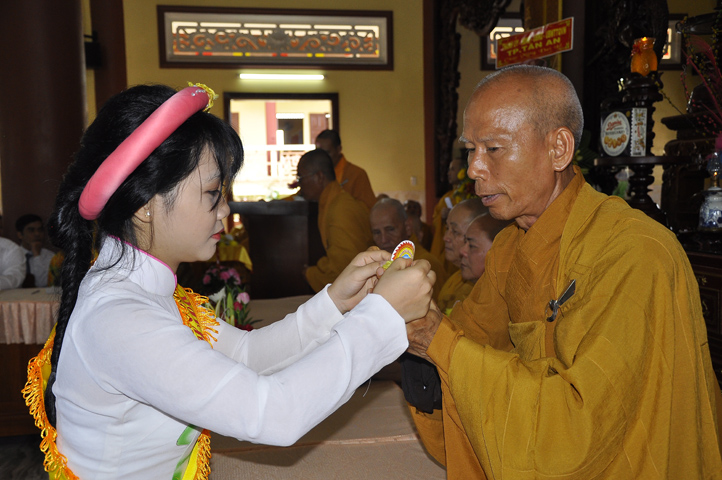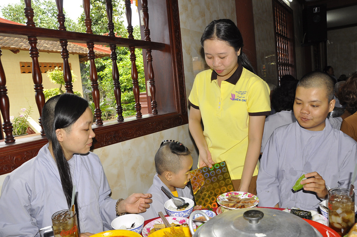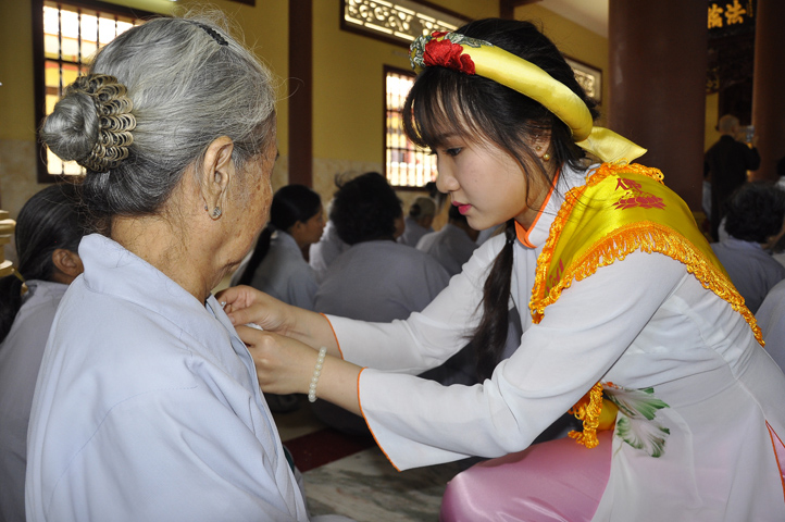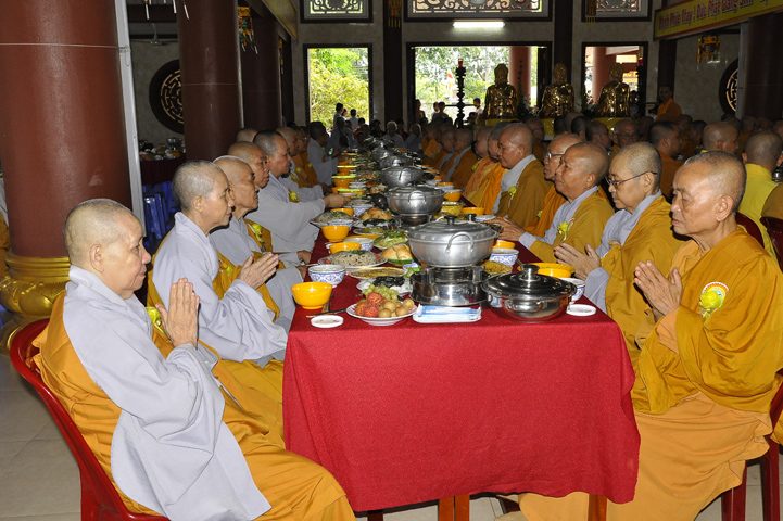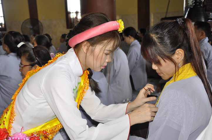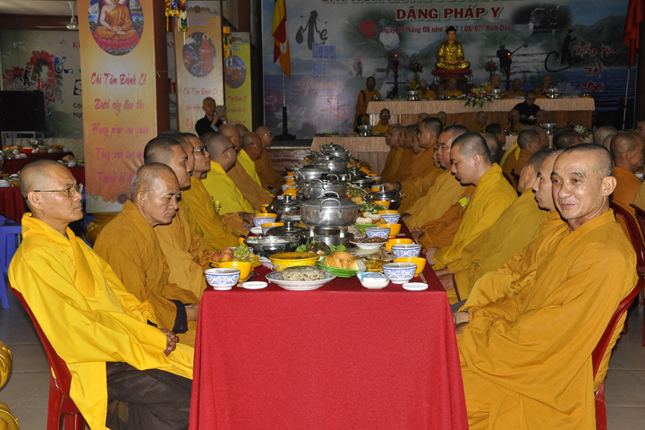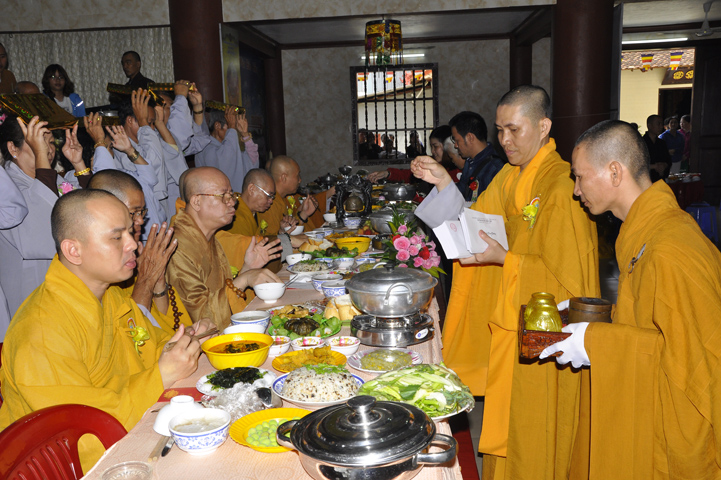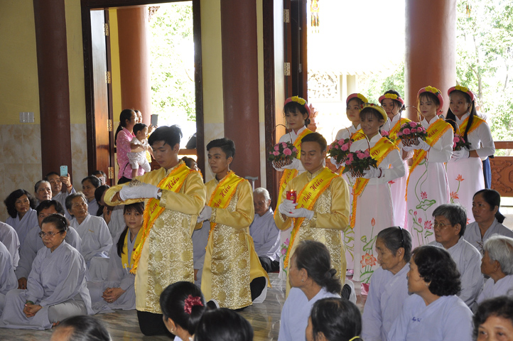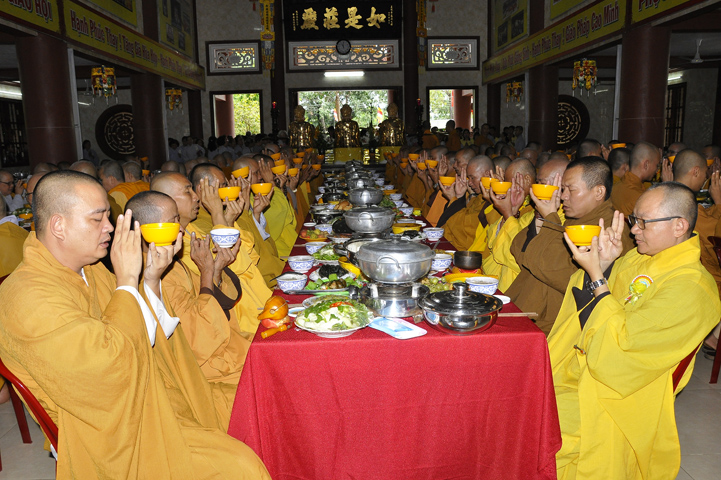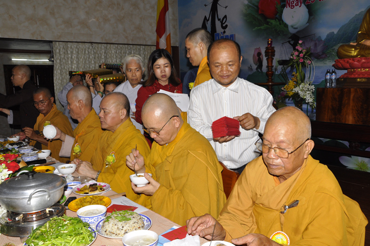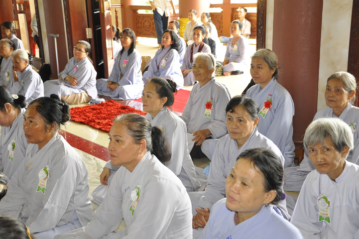 Sau lễ cài hoa hồng ban tổ chức hướng dẫn Phật tử cúng dường trai Tăng và dâng cúng pháp y.