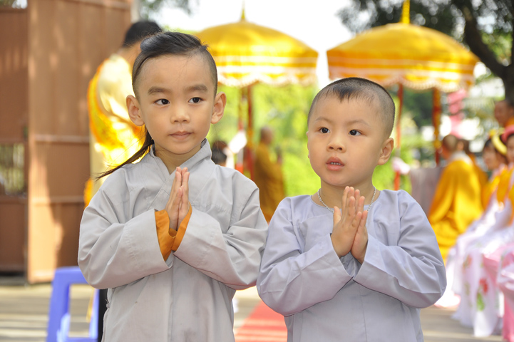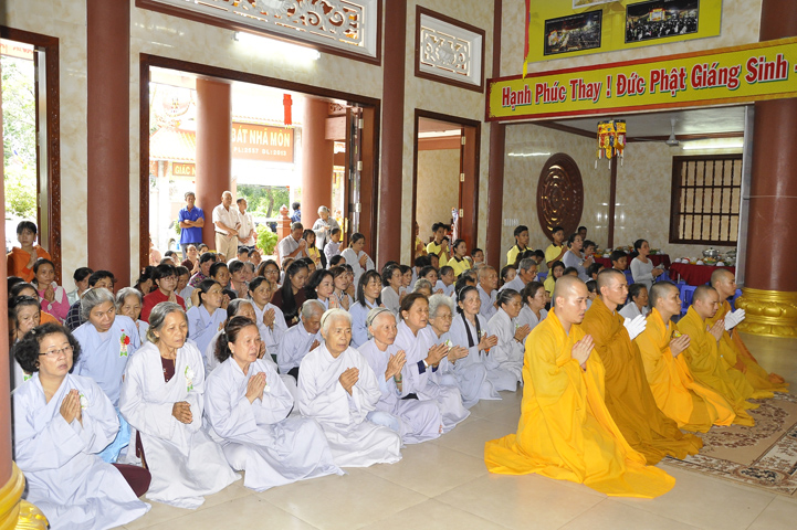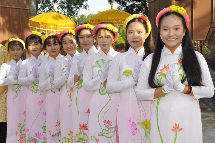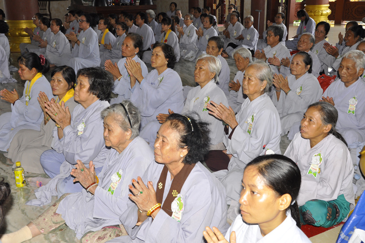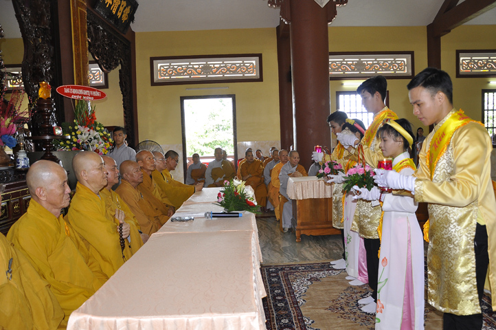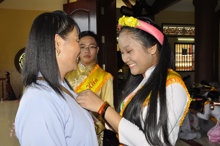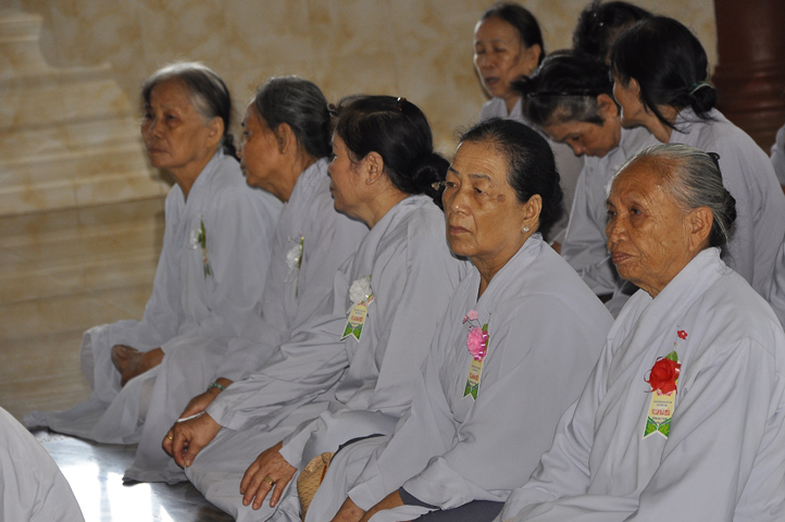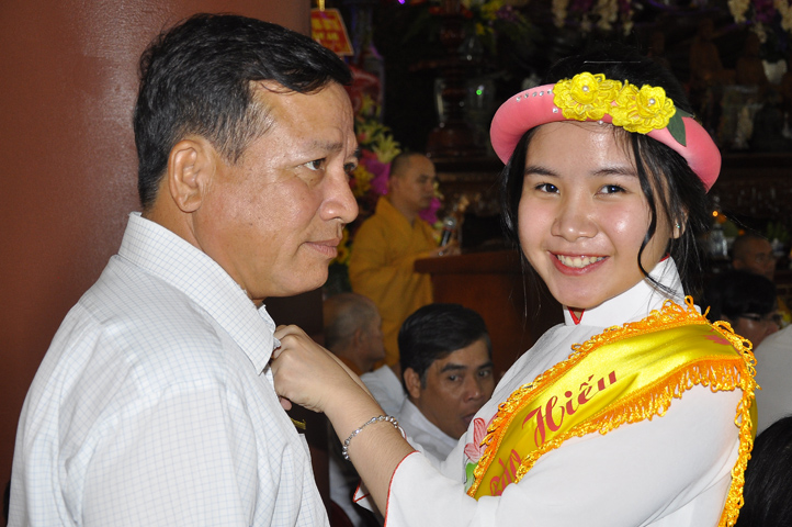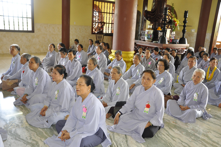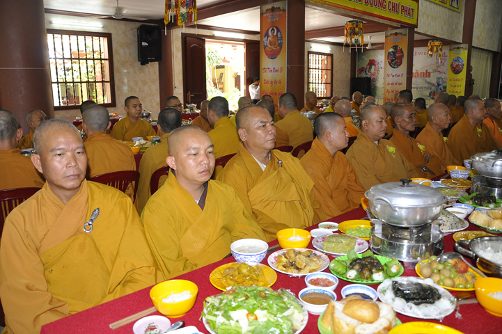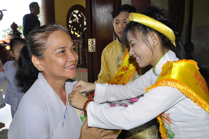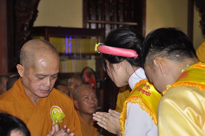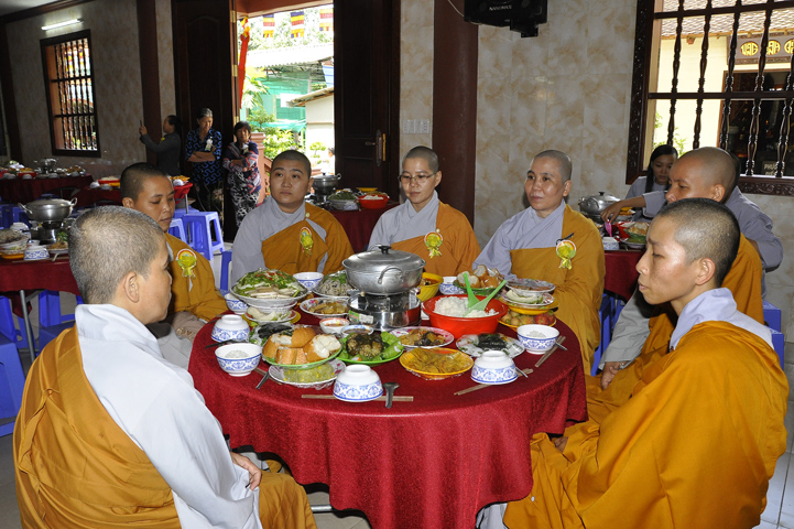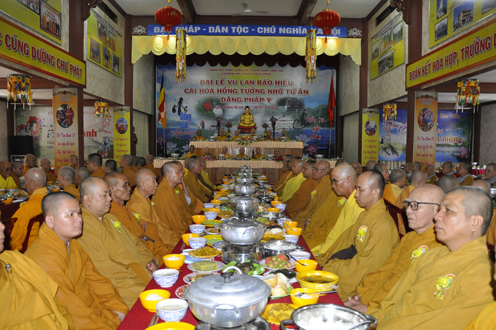 Sau lễ cài hoa hồng ban tổ chức hướng dẫn Phật tử cúng dường trai Tăng và dâng cúng pháp y.