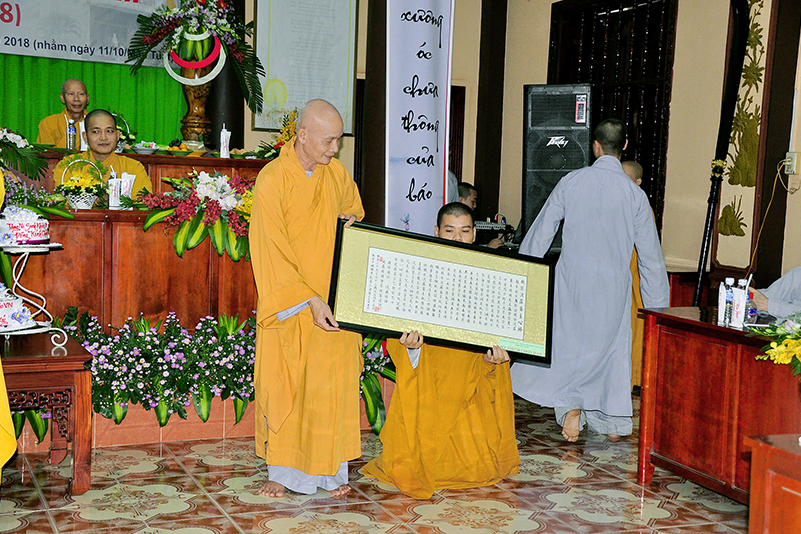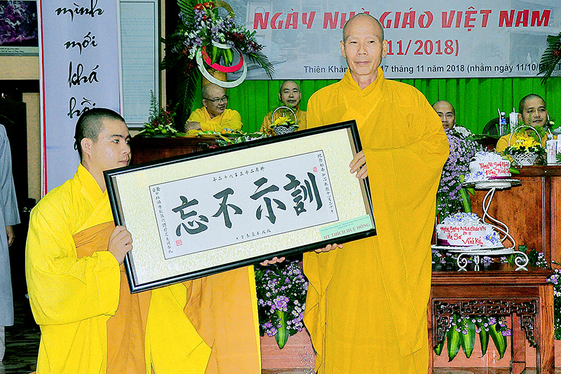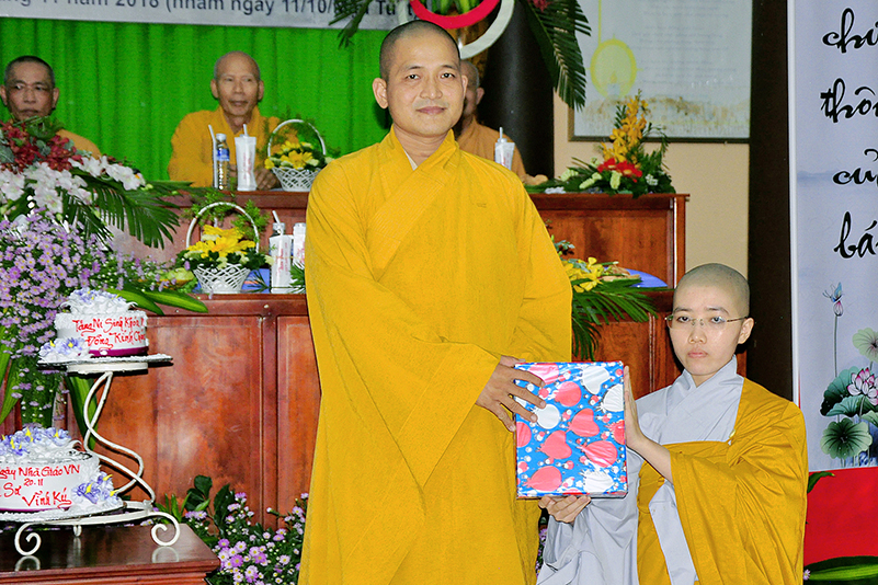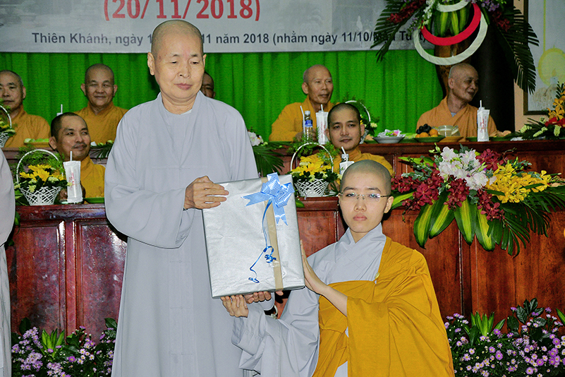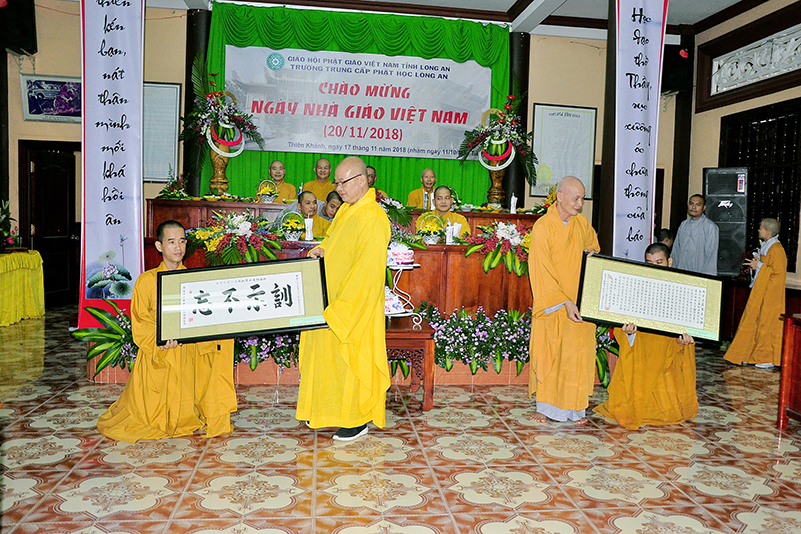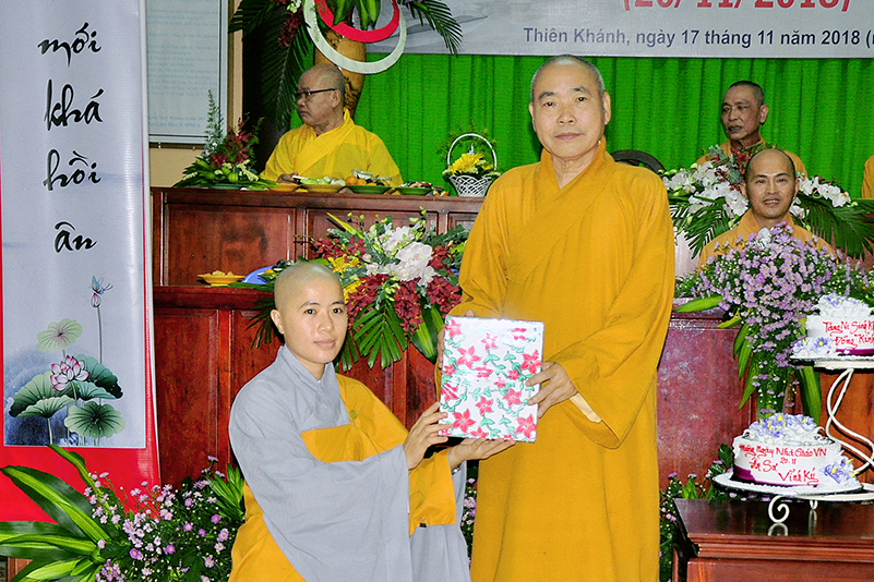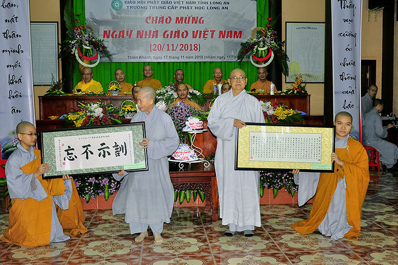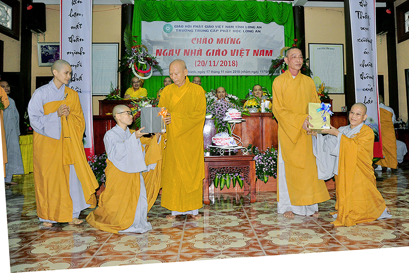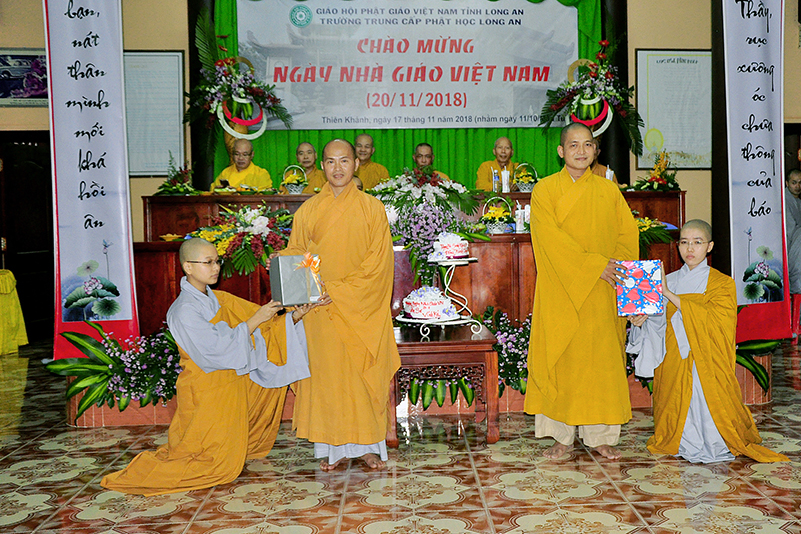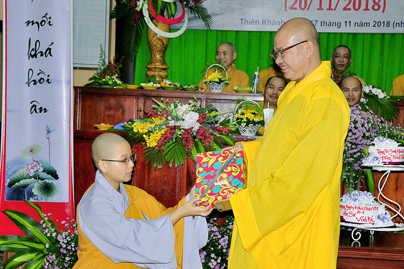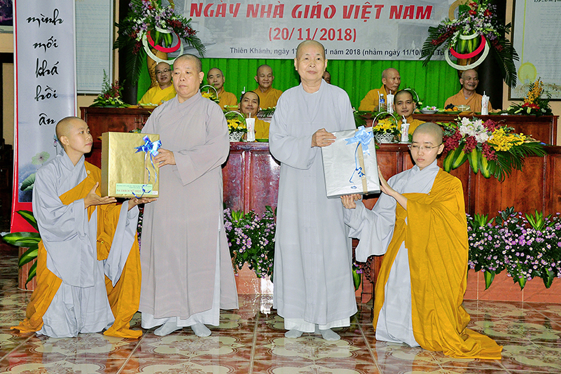 Buổi lễ kết thúc bằng những phần quà, lời chúc tụng từ các Tăng Ni sinh trân trọng gởi đên Thầy Cô. Ngày 20/11 2018, thật hạnh phúc biết bao khi nghe lời cảm khái ngọt ngào, ca ngợi nghề Nhà giáo. “Cao quý chi bằng nghề Nhà giáo, Vinh quang chi bằngsự nghiệp trồng người.”