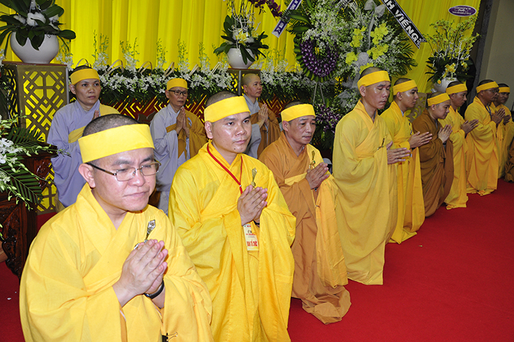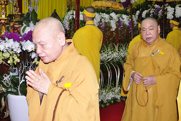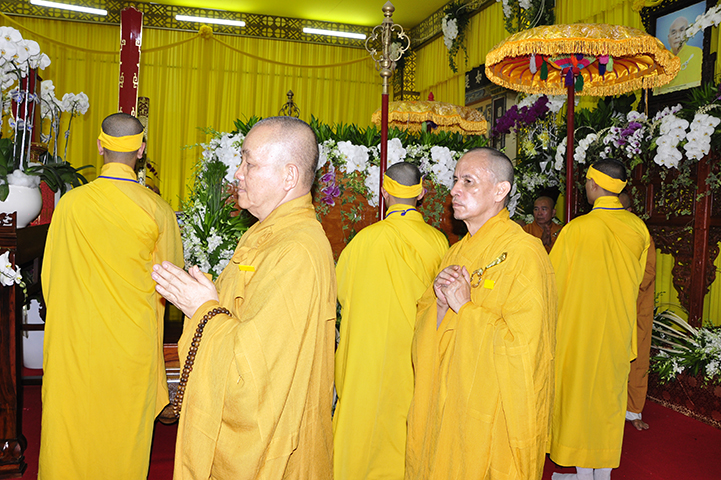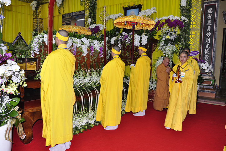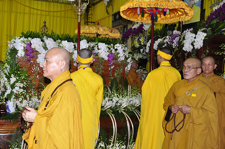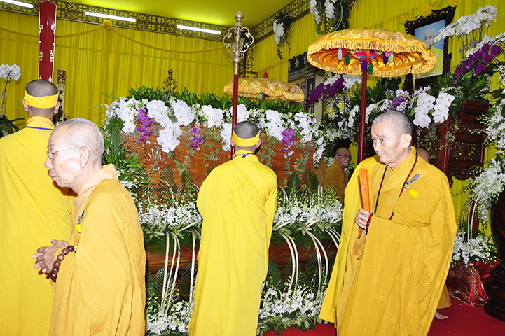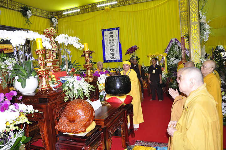 Sau khi dâng hương tham lễ Giác linh Cố Hoà thượng xong, Hoà thượng Chủ tịch cùng chư tôn Giáo phẩm trong đoàn đã hữu nhiễu kim quan Cố Giác linh Hoà thượng và sau đó đến bàn ký sổ tang ghi để vào những dòng lưu niệm.