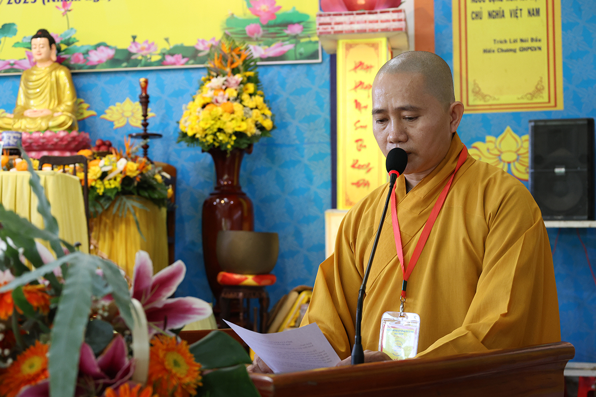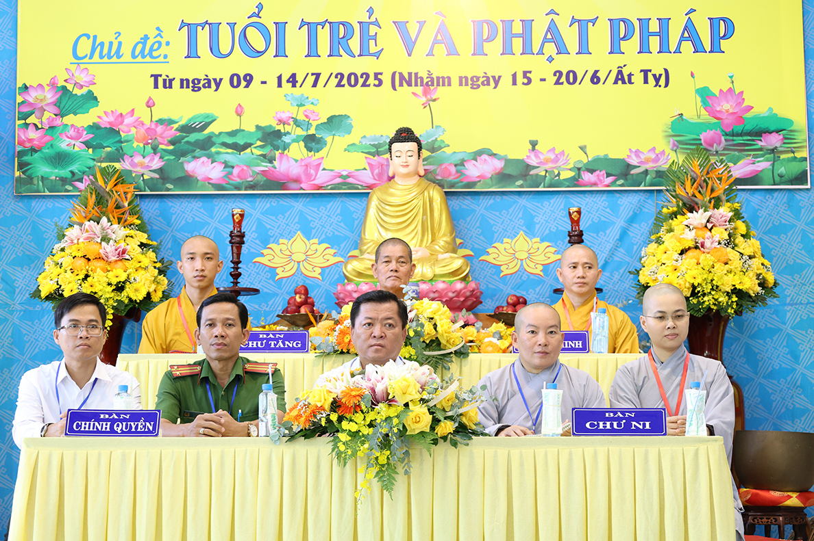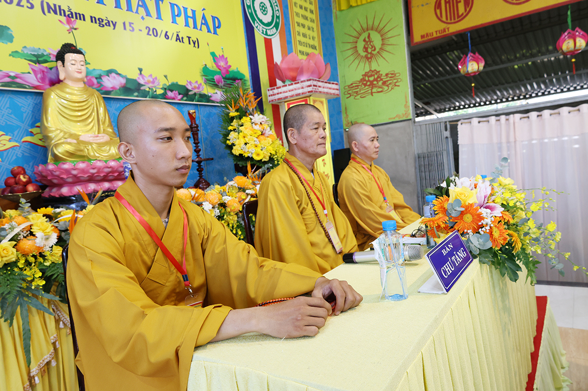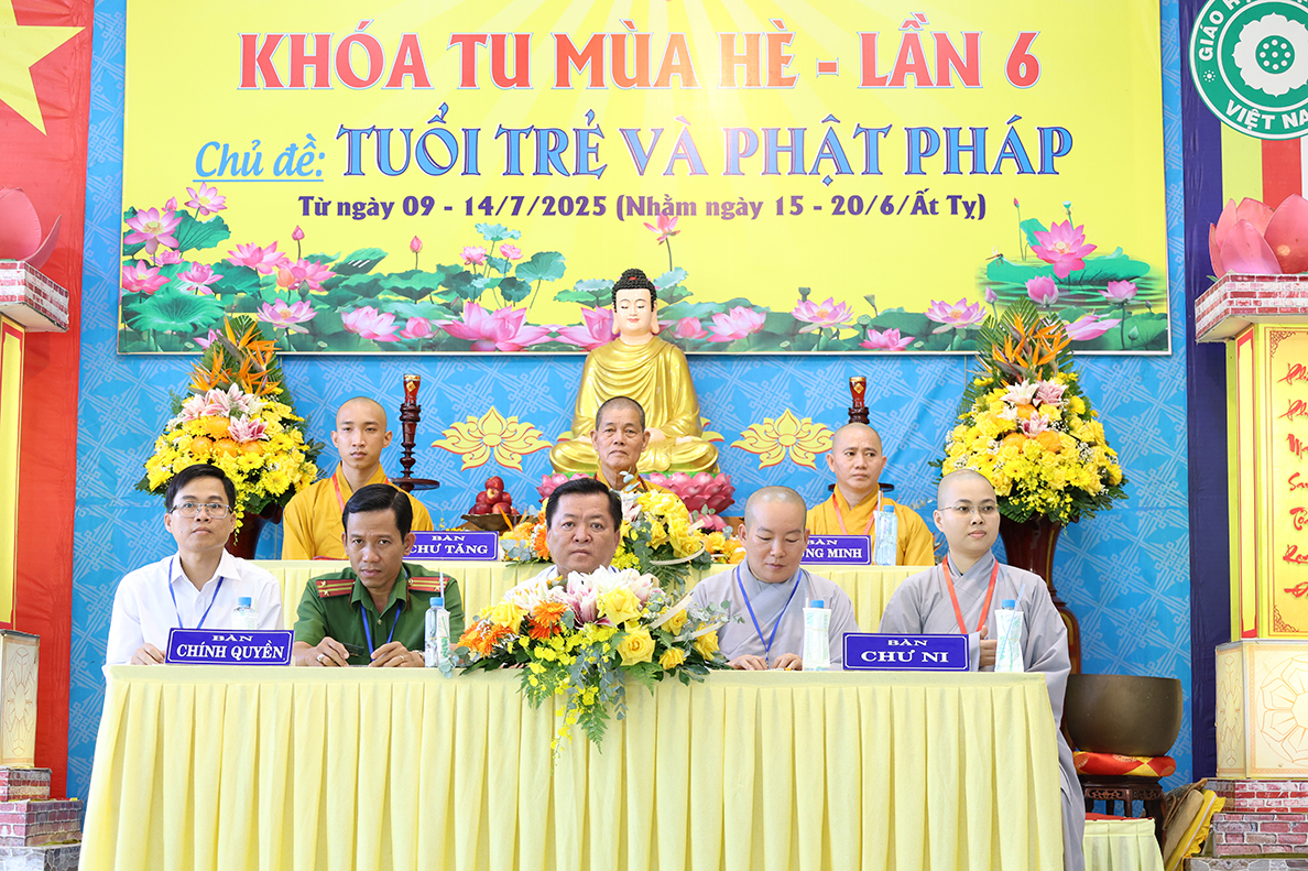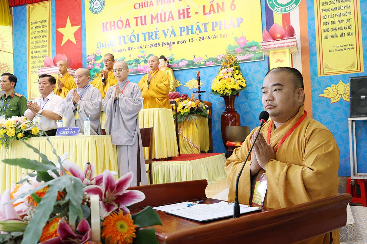 Chứng minh tại buổi lễ – Thượng tọa Thích Lệ Tấn – Chứng minh, cố vấn khóa tu đã hoan hỷ với chư tôn đức về việc tổ chức khóa tu, Thượng tọa nêu lên tầm quan trọng của Phật giáo trong xã hội mới thông qua việc hướng dẫn, truyền trao cho giới trẻ, là đội ngũ kế thừa xây dụng đất nước trong tương lai, sẽ có được sự hiểu biết chân chánh về Phật pháp, hiểu rõ về lối sống tích cực, làm thiện lánh ác, tránh xa các hủ tục, trò chơi không lành mạnh, kiểm soát tốt việc tiếp xúc với công nghệ mạng hiện đại, cố gắng học tập tốt, bồi dưỡng đạo đức tốt, hiếu thảo, tôn trọng ông bà cha mẹ, hiểu rõ nghĩa vụ đối với Tổ quốc để xây dựng đất nước hùng cường, vững mạnh.