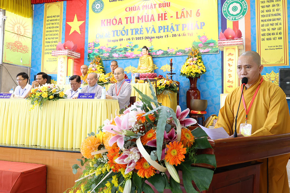 Thay mặt BTC – Đại đức Thích Huệ Nghiêm đã phát biểu khai mạc khóa tu, trong lời phát biểu, Đại đức đã tri ân Chư tôn đức và chính quyền các cấp đã tạo điều kiện thuận lợi để khóa tu mùa hè tại Chùa Phật Bửu được tổ chức thuận lợi, bên cạnh đó nêu ra định hướng việc tổ chức khóa tu mùa hè dành cho khóa sinh, đề ra thời khóa tu tập, tổ chức huấn giảng để truyền trao cho khóa sinh về lối sống lành mạnh, tư duy nhạy bén, khả năng hội nhập xã hội một cách tốt đẹp.